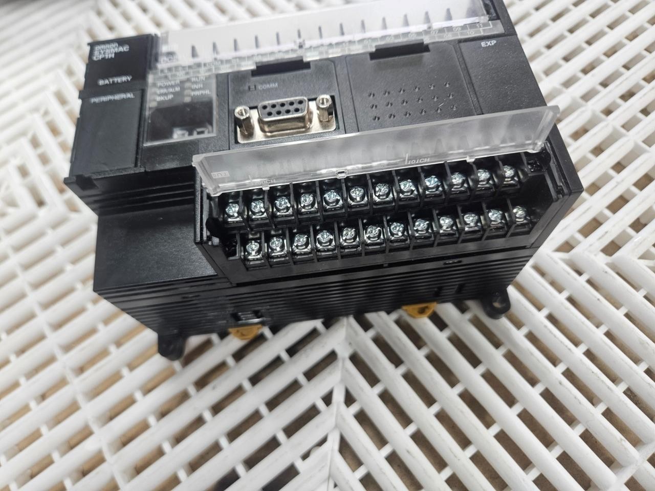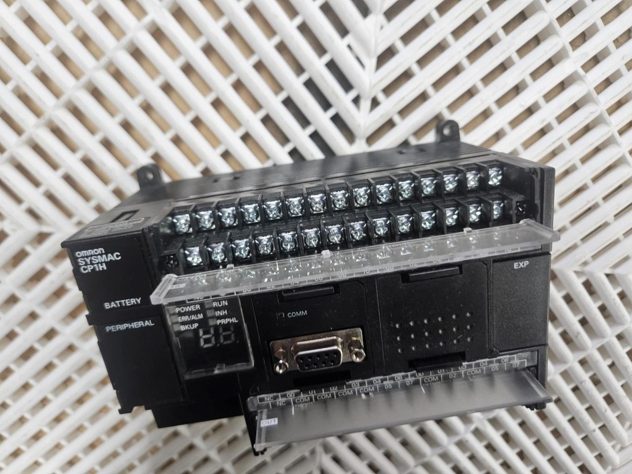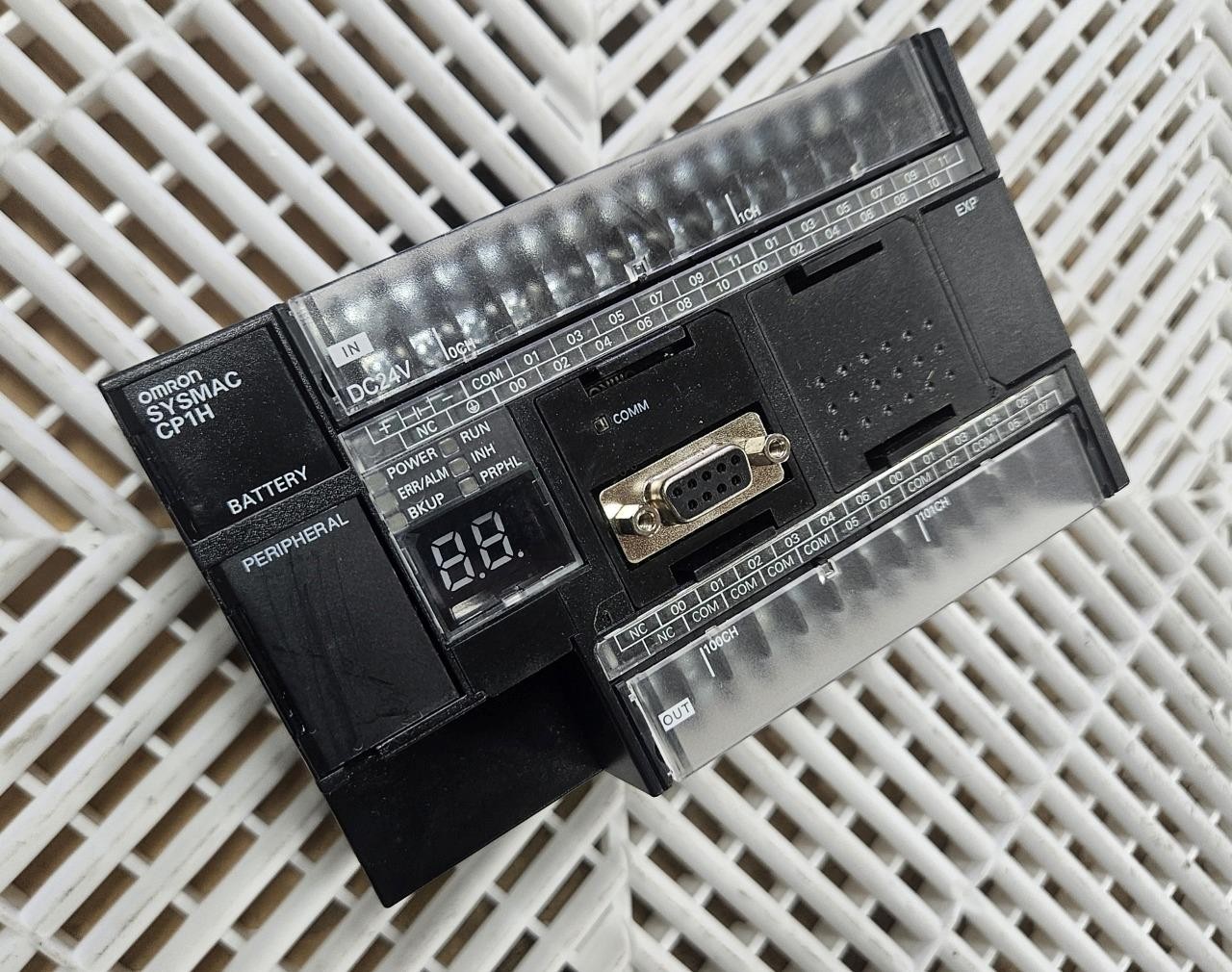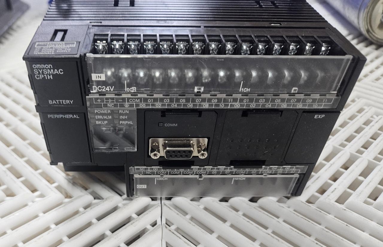 Here is an Omron CP1H-X40DT-D-SC programmable controller. This is a late model unit and was pulled from an unused conveyor system. It comes with a serial communication interface.  Â