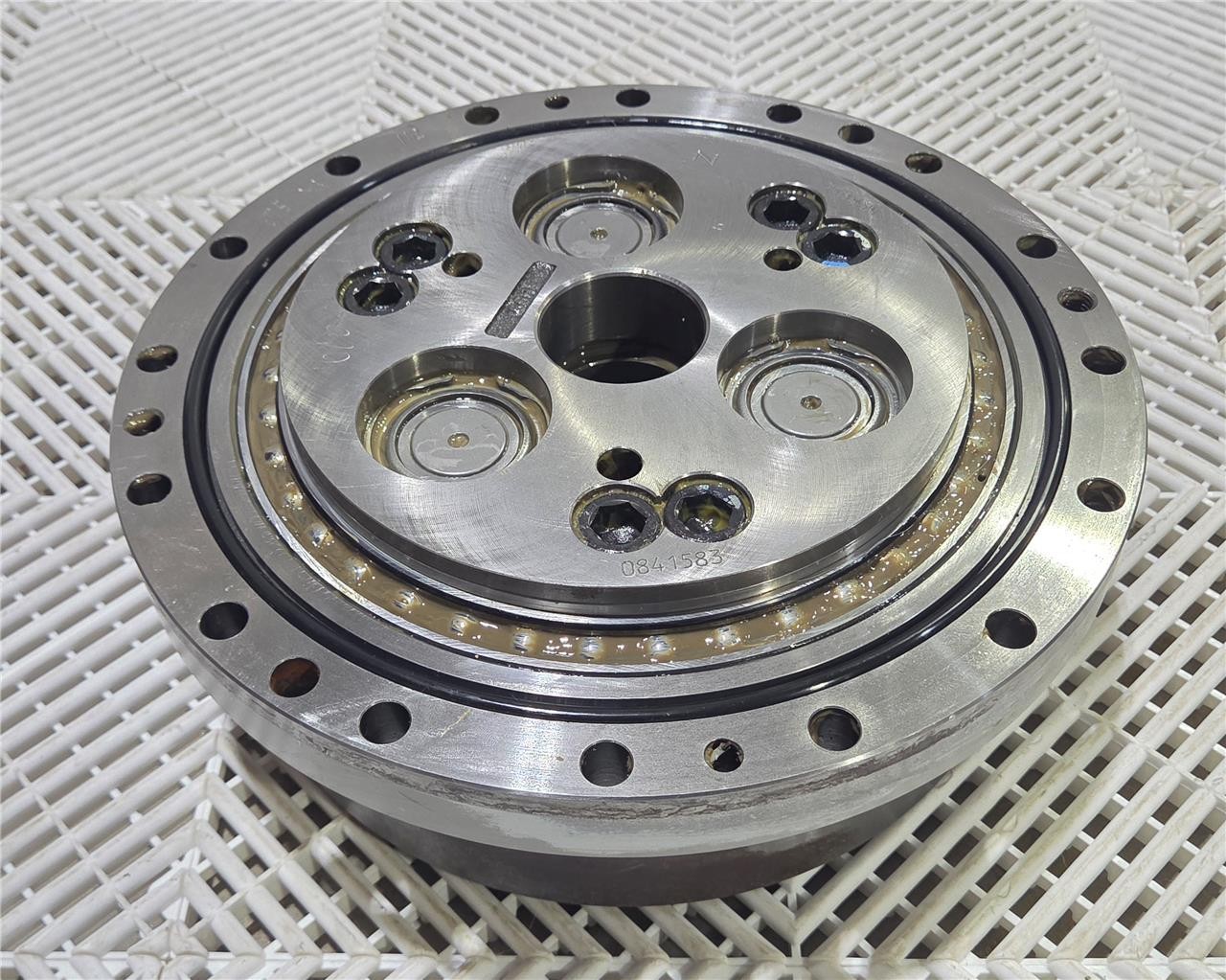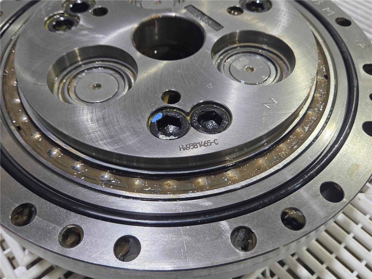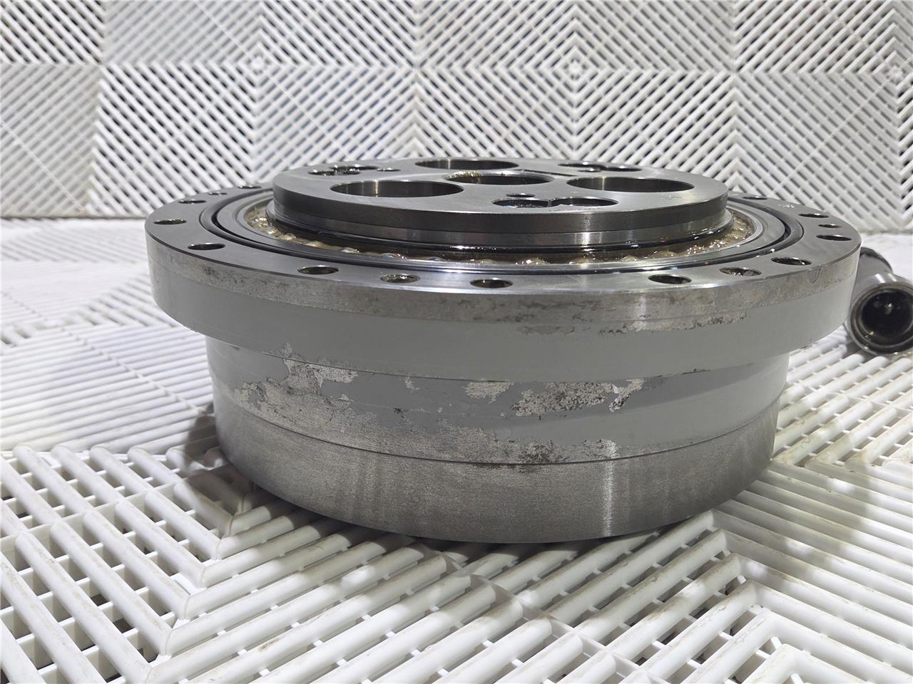 Here is a Yaskawa HW9381465-C Motoman ES165N Robot Gear Reducer 185:1 Ratio U-Arm Part. Moves without play, pulled from a functioning Yaskawa Motoman. The system was sealed, so the gear reducer is in immaculate internal condition and has minimal to moderate exterior wear.