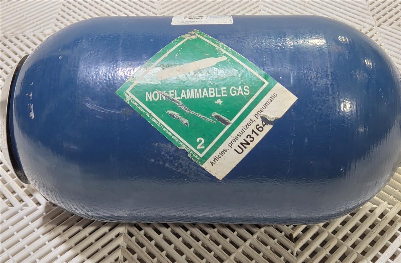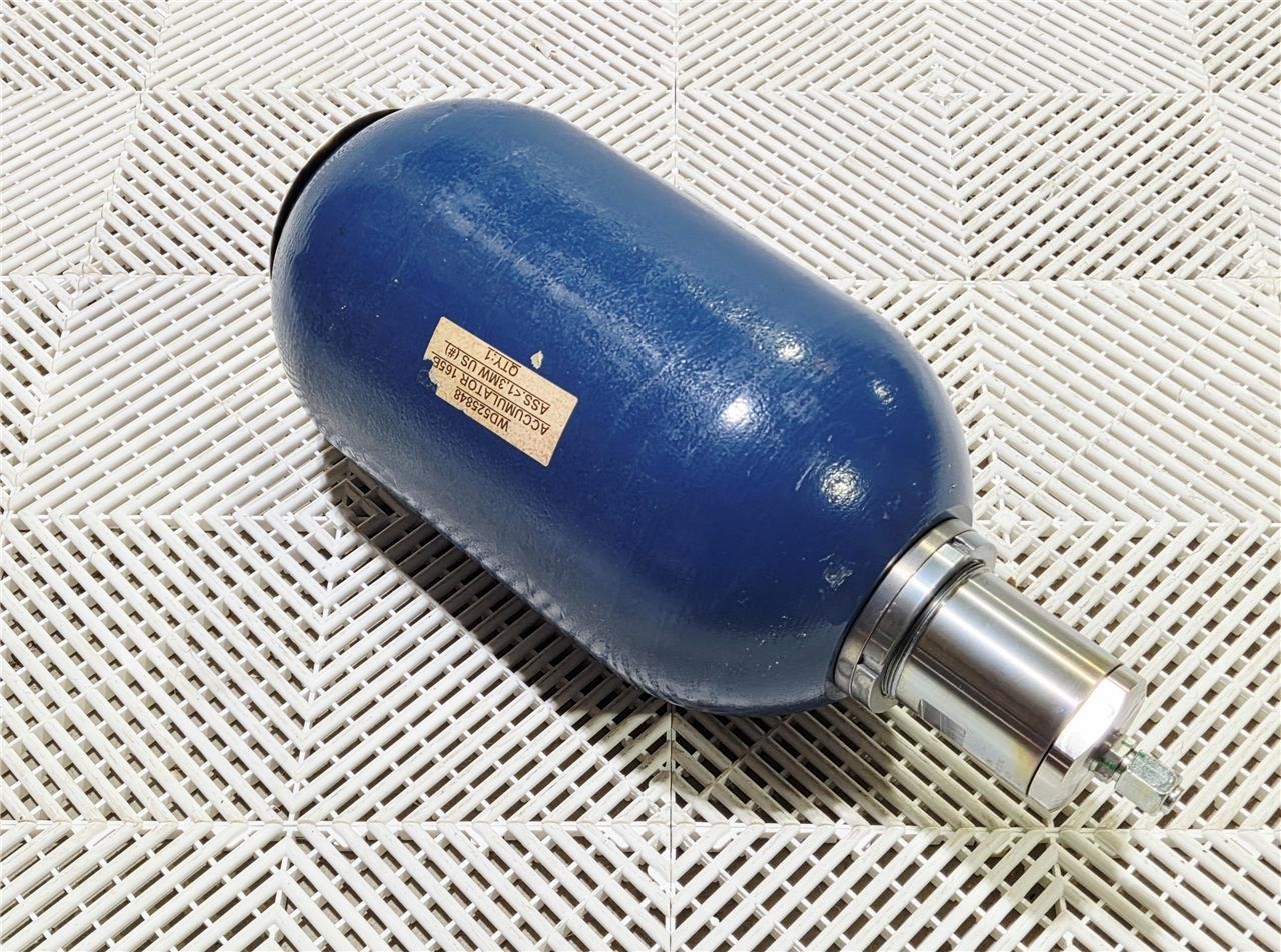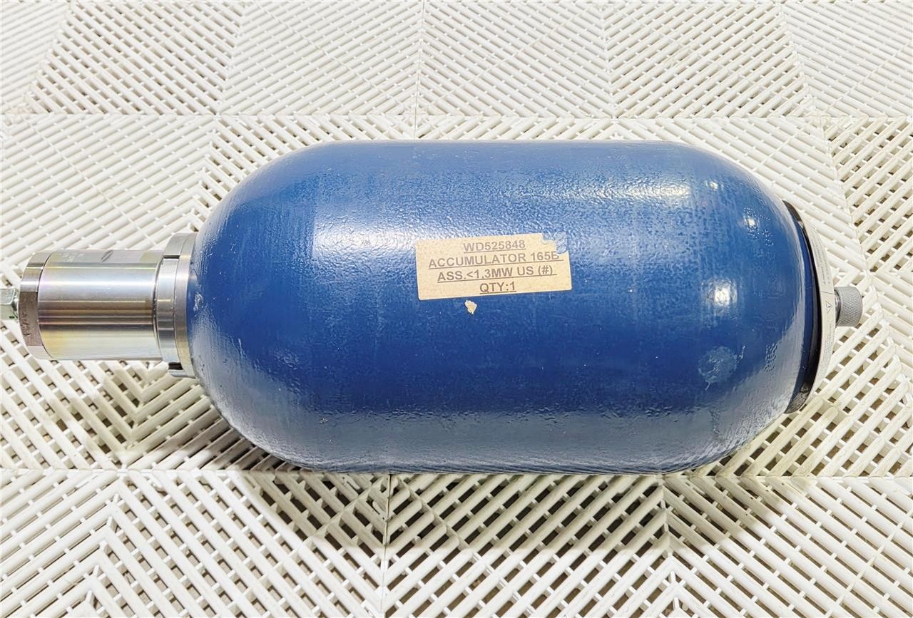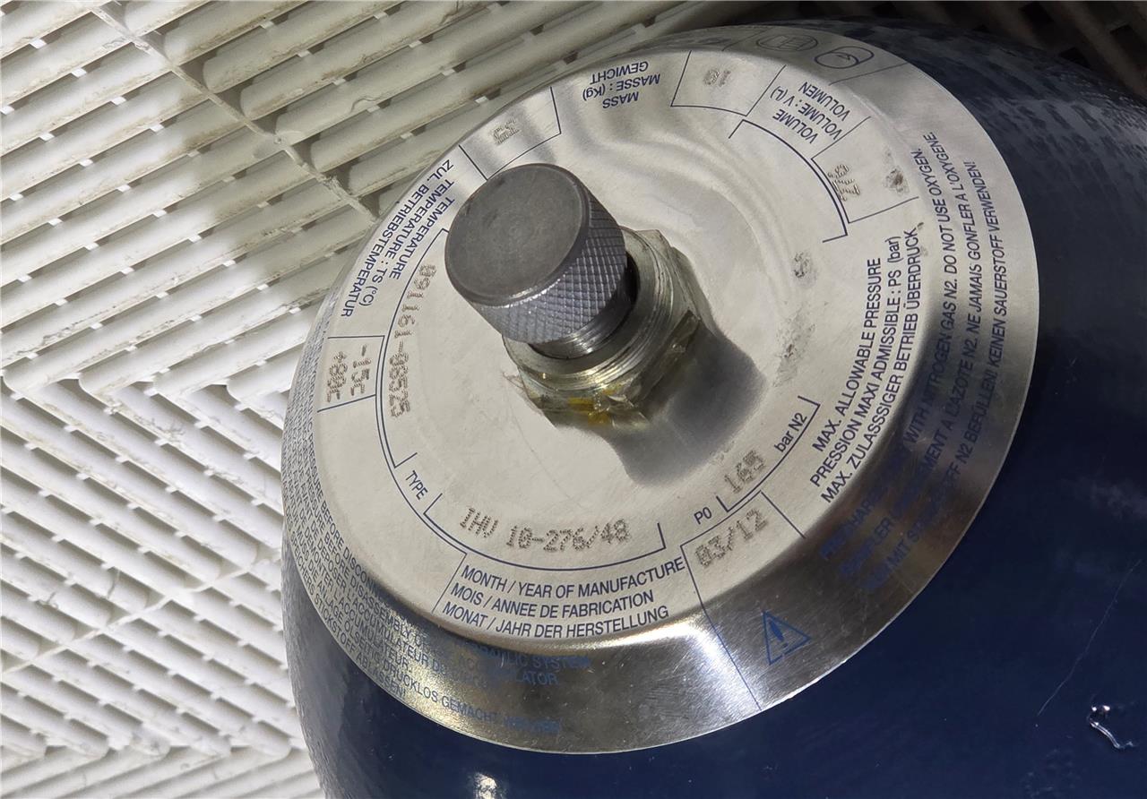 Here is a New Olaer IHV10-276/48 Hydraulic Accumulator Max 276 Bar 4000 PSI A9B00525848. These are 10-liter units rated for up to 276 bar. New, no box. Ports are covered.