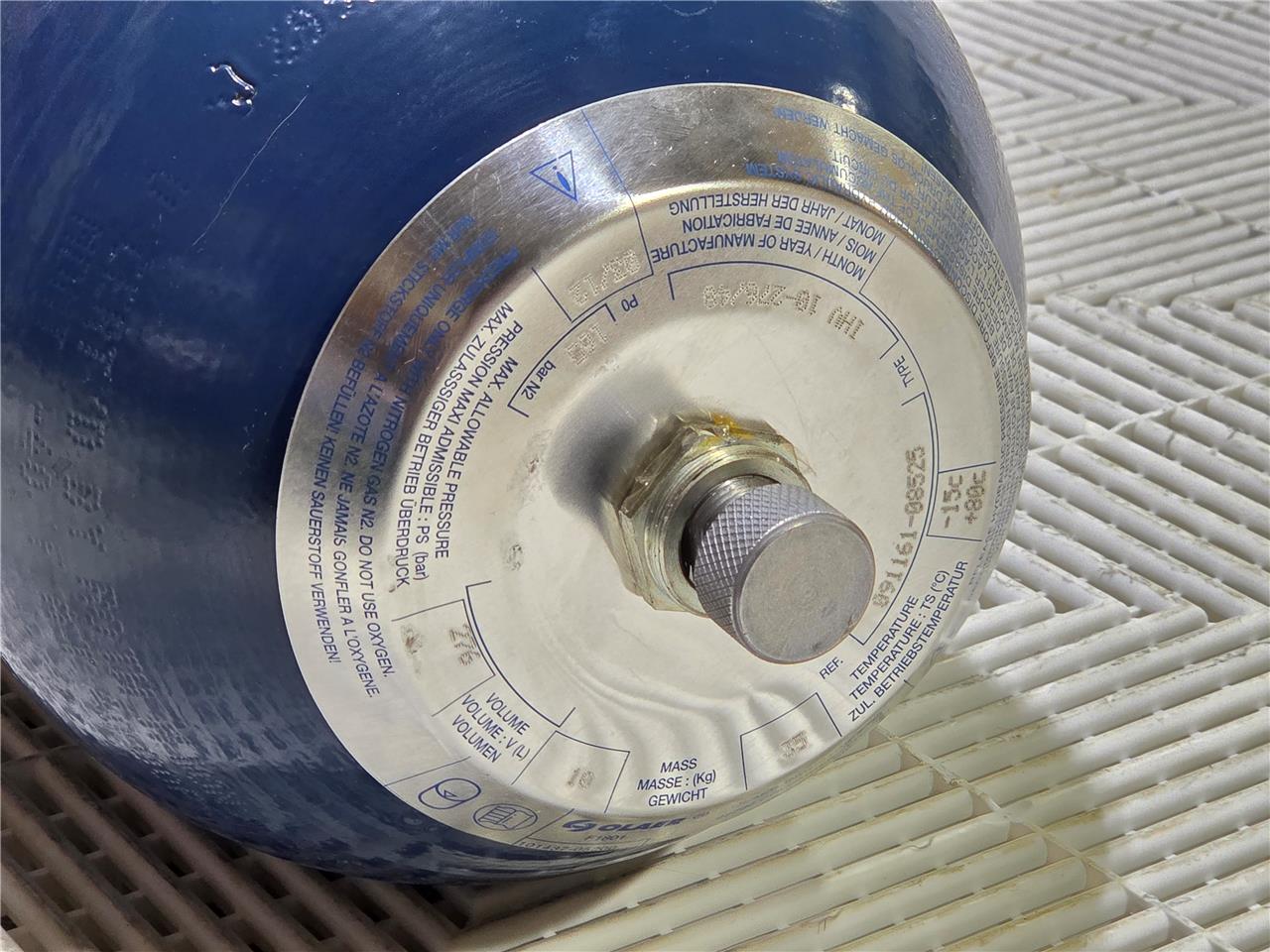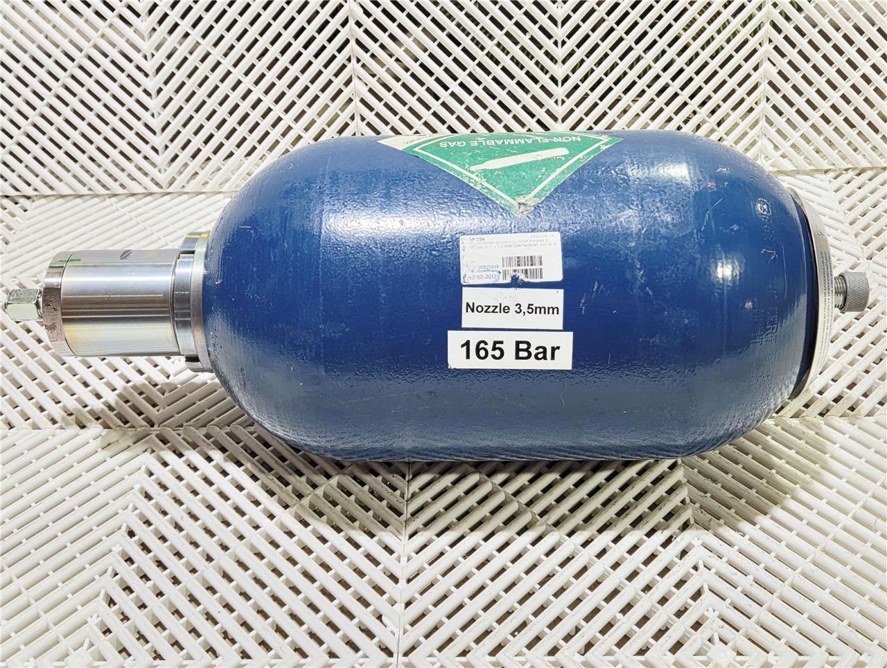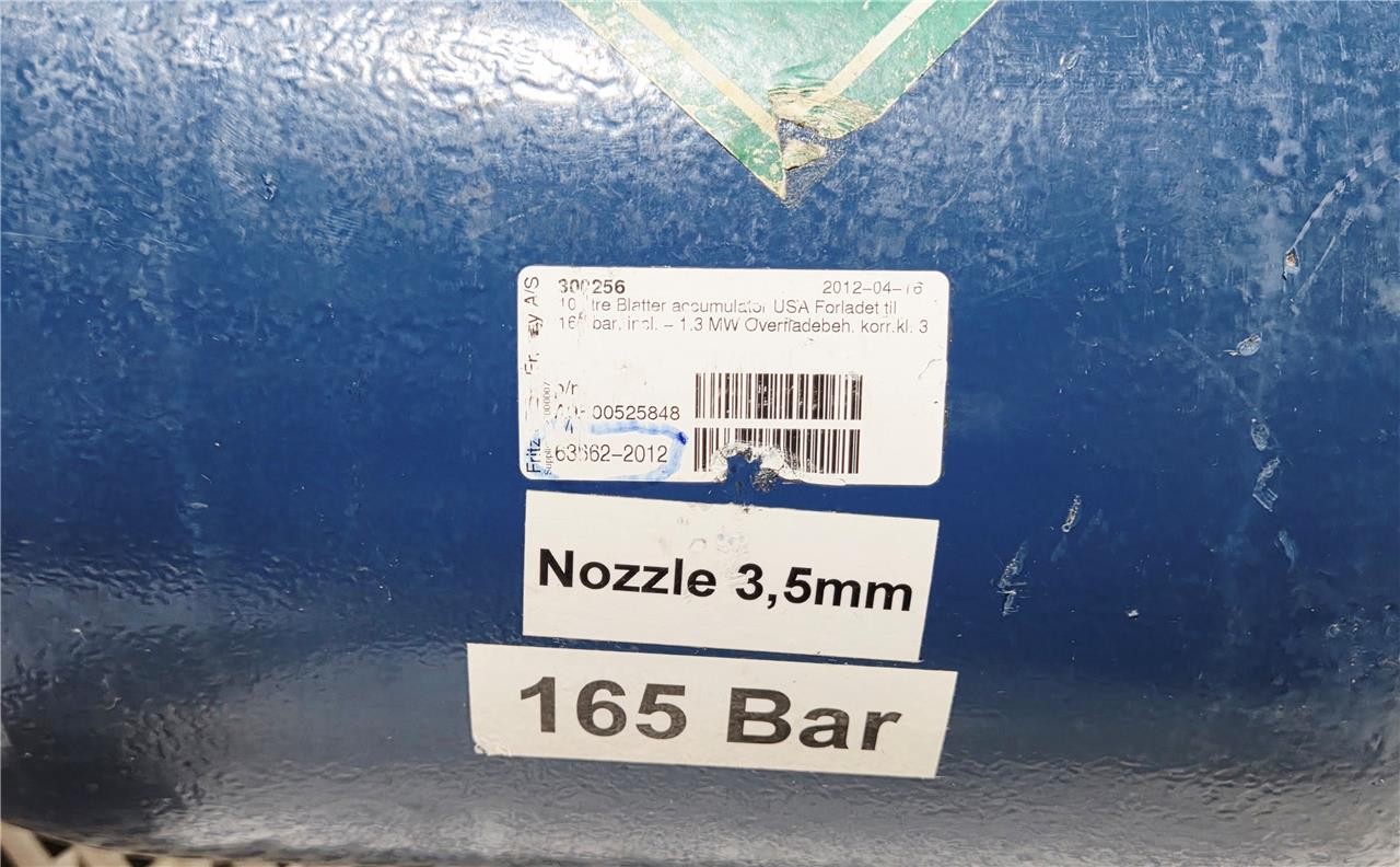Here is a New Olaer IHV10-276/48 Hydraulic Accumulator Max 276 Bar 4000 PSI A9B00525848. These are 10-liter units rated for up to 276 bar. New, no box. Ports are covered.