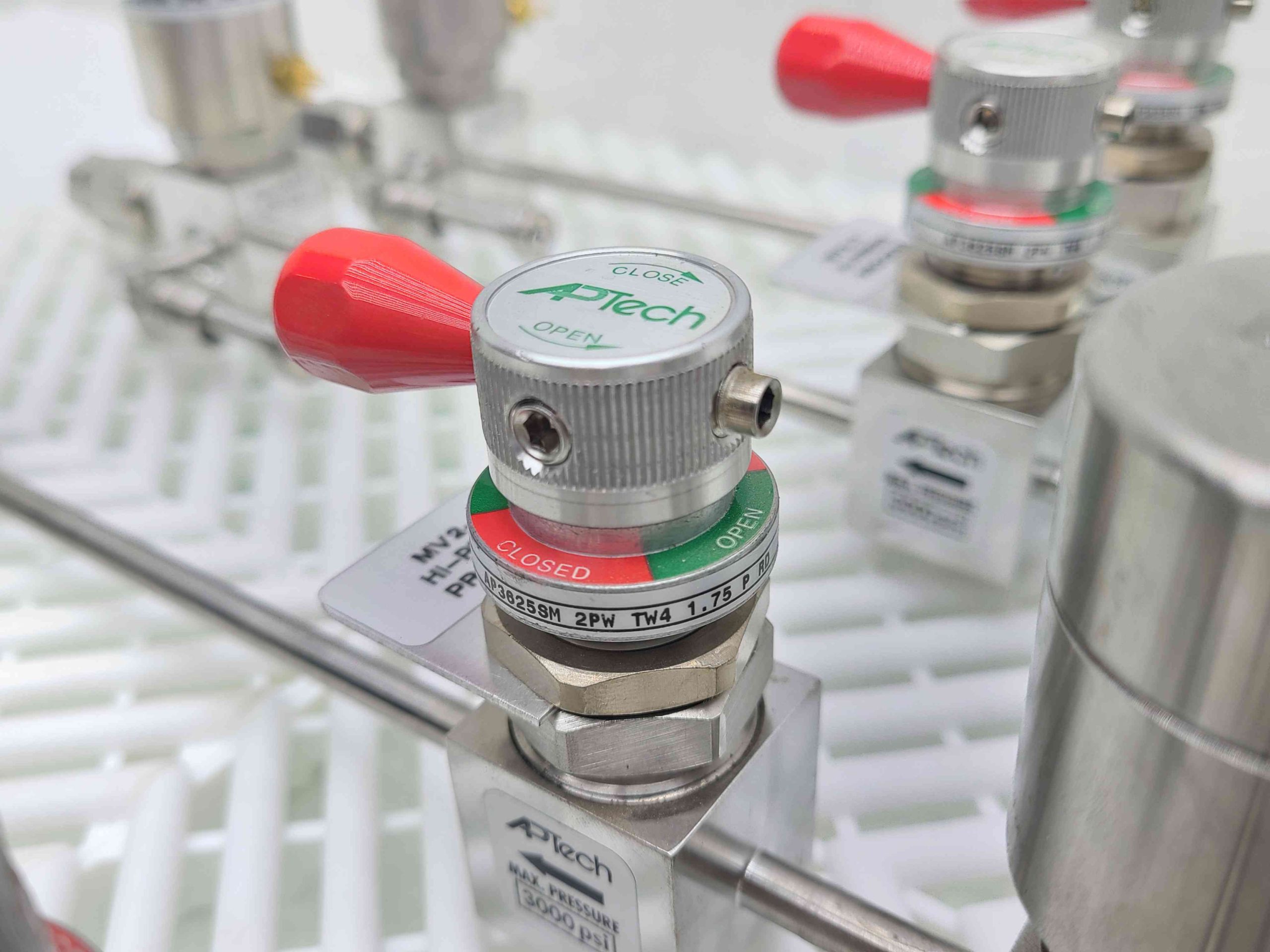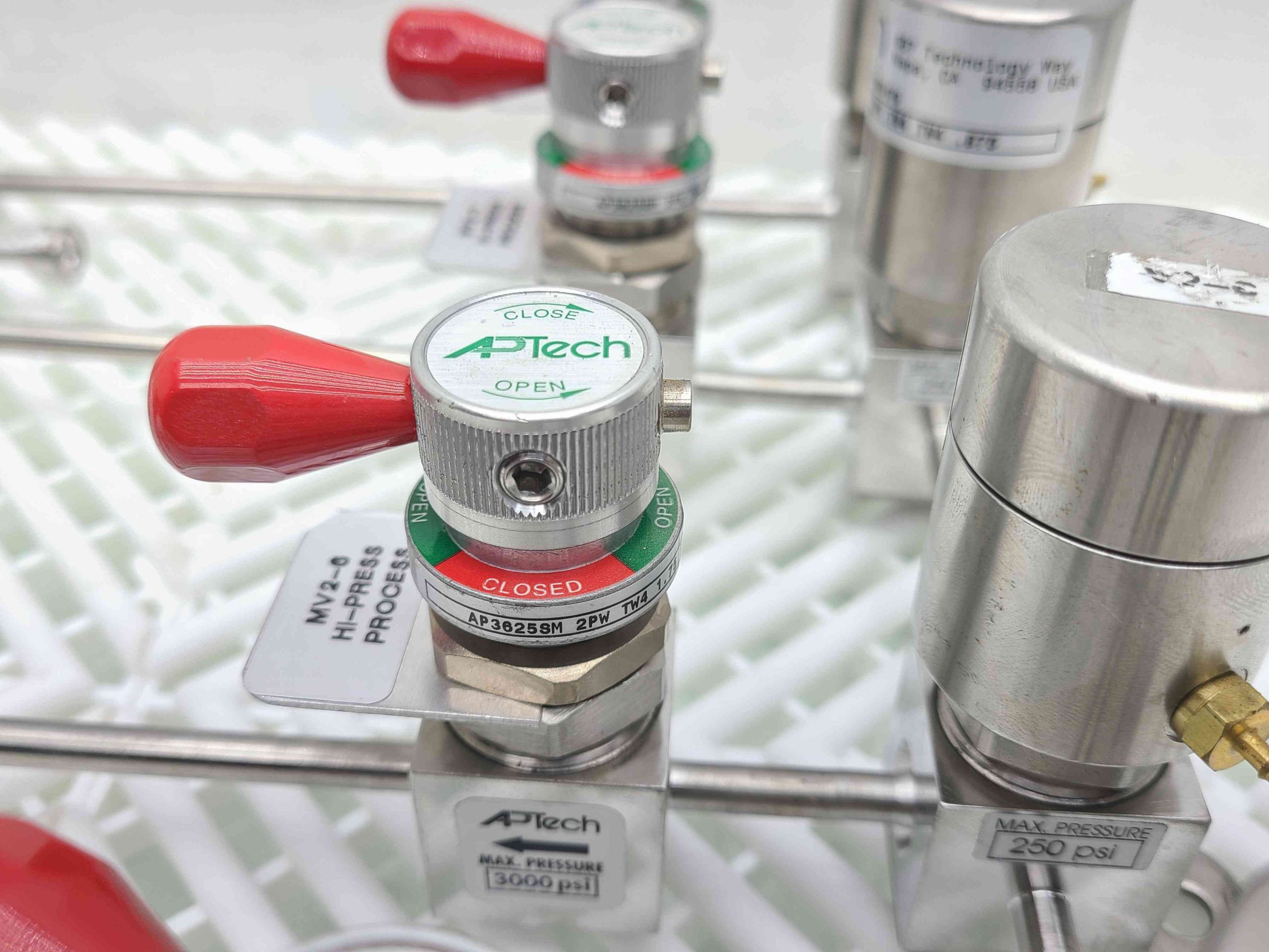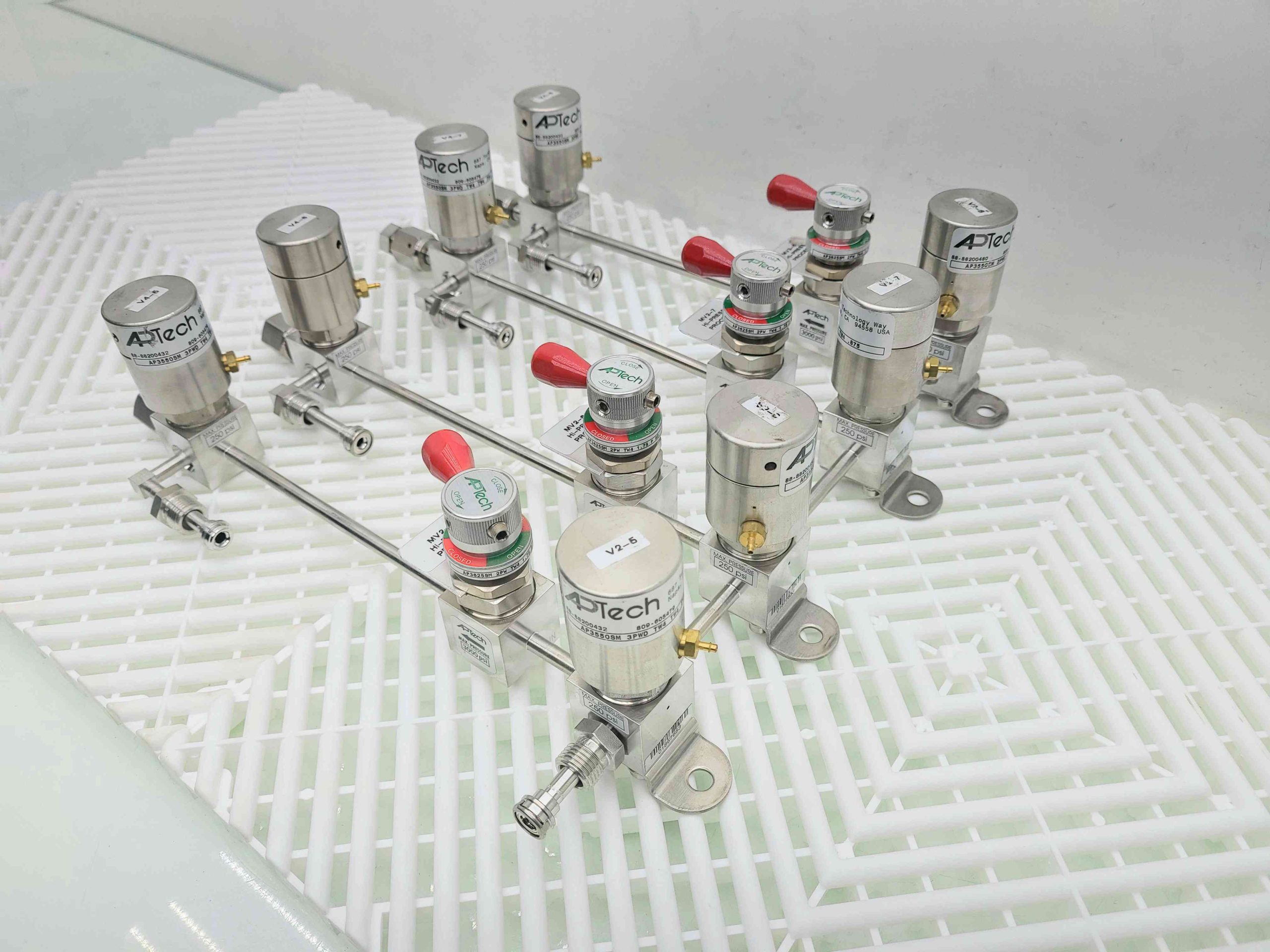 Here is a APTech gas distribution manifold. This includes 4 distribution three way air pilot valves. (AP35505M-3PWD-TW4-TW4-TW4-.875). These are fed by four isolation diaphragm valves with manual shut off valves. AP3625SM-2PW-TW4-1.75-P-RD) All connections are 1/4″ VCR.Â