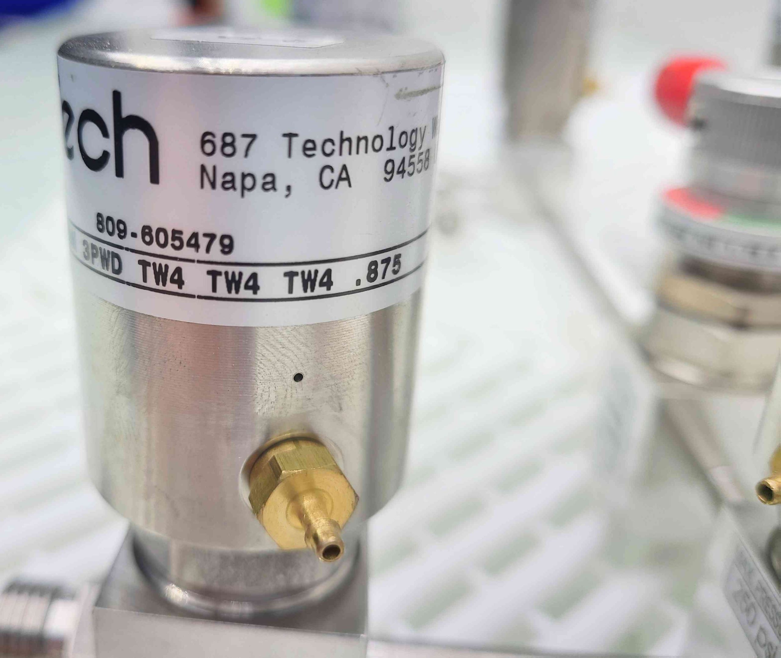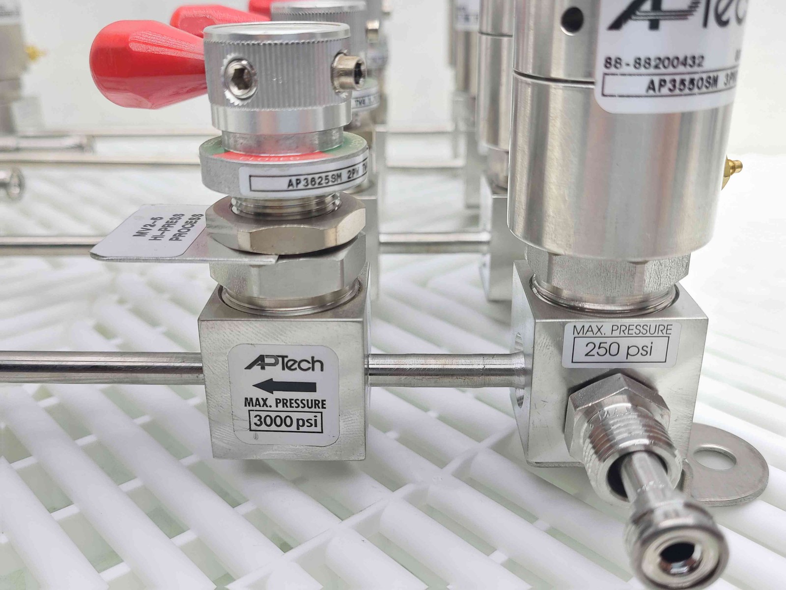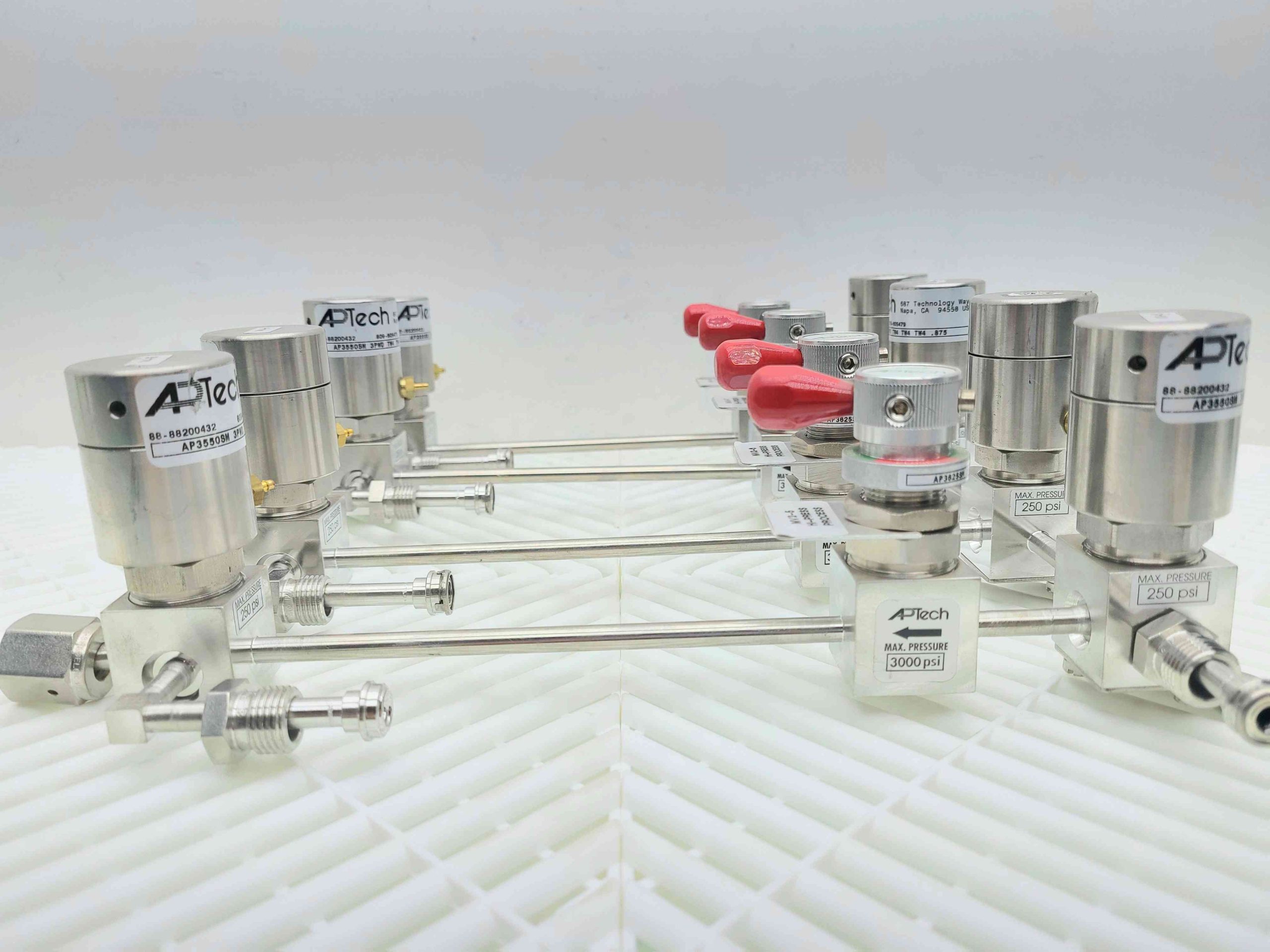 Here is a APTech gas distribution manifold. This includes 4 distribution three way air pilot valves. (AP35505M-3PWD-TW4-TW4-TW4-.875). These are fed by four isolation diaphragm valves with manual shut off valves. AP3625SM-2PW-TW4-1.75-P-RD) All connections are 1/4″ VCR.Â