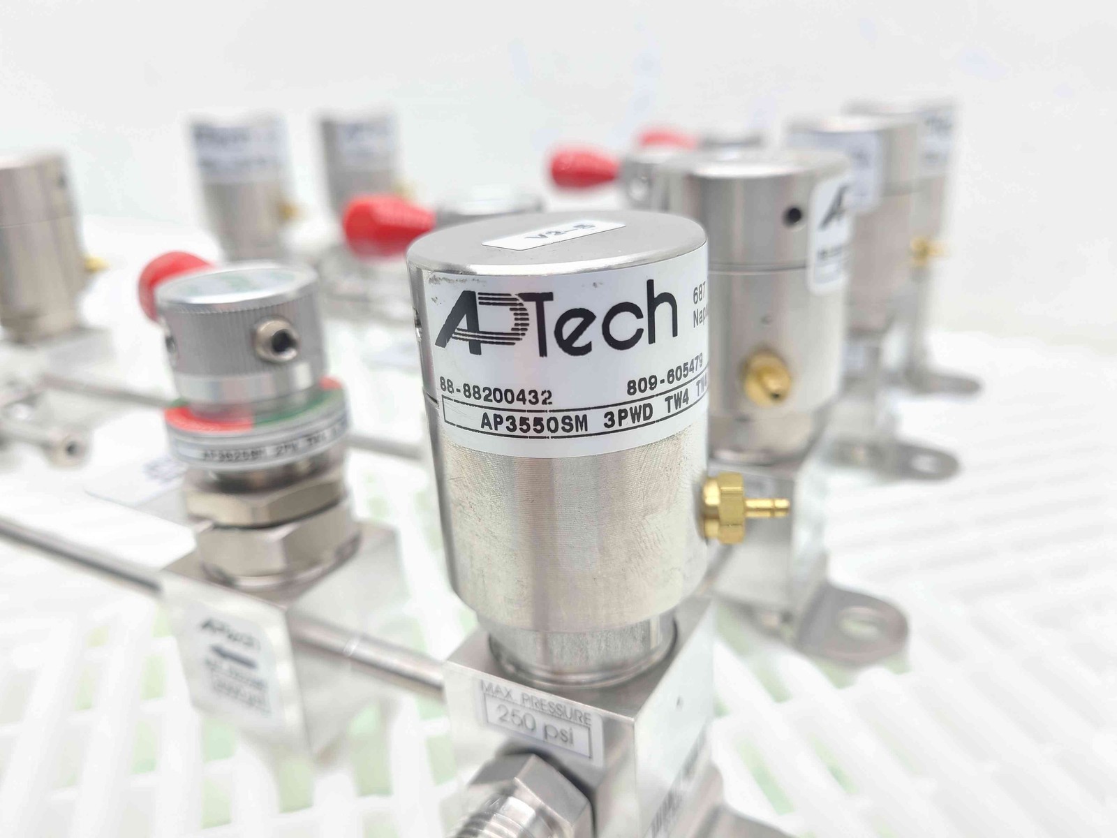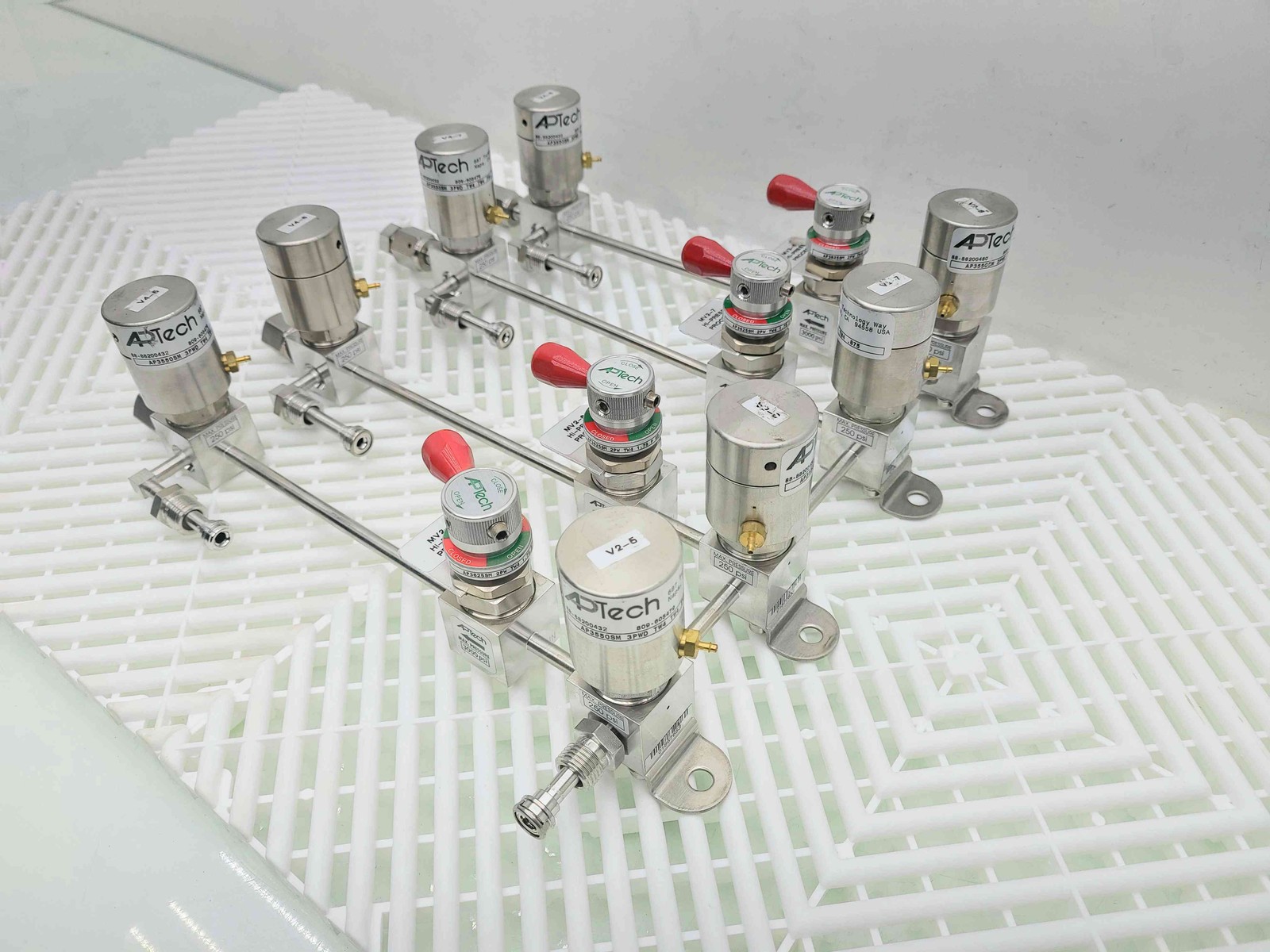 Here is a APTech gas distribution manifold. This includes 4 distribution three way air pilot valves. (AP35505M-3PWD-TW4-TW4-TW4-.875). These are fed by four isolation diaphragm valves with manual shut off valves. AP3625SM-2PW-TW4-1.75-P-RD) All connections are 1/4″ VCR. These are in like new functional and cosmetic shape. They were pulled from a semiconductor line used only for testing before the firm went out of business. Home POLICIES CONTACT US ABOUT ME FEEDBACK view all items Menu Home POLICIES CONTACT US ABOUT ME FEEDBACK view all items Categories Ball Screws / Shaft Couplings Cable Chains Cables for Automation Cameras for Automation Contactors/Relays Control Systems and PLCs Heating/Cooling for Automation Hydraulics Gear Reducers / Gear Heads Lab/Analytical Equipment Lasers Linear Actuators Linear Guides Liquid Valves/Flow Controls Manufacturing / Metalworking Motors For Automation Optics Power Supplies/Circuit Breaker Pneumatic Actuators /Cylinders Pneumatic Valves Safety Hardware for Automation Sensors Servo Motors / Servo Drives Stepper Motors /Stepper Drives Switches For Automation Transformers Vaccum Equipment Wiring for Automation (4) APTech AP35505M-3PWD-TW4-.875 Diaphragm Valves AP3625SM-2PW-TW4 Item Specifications