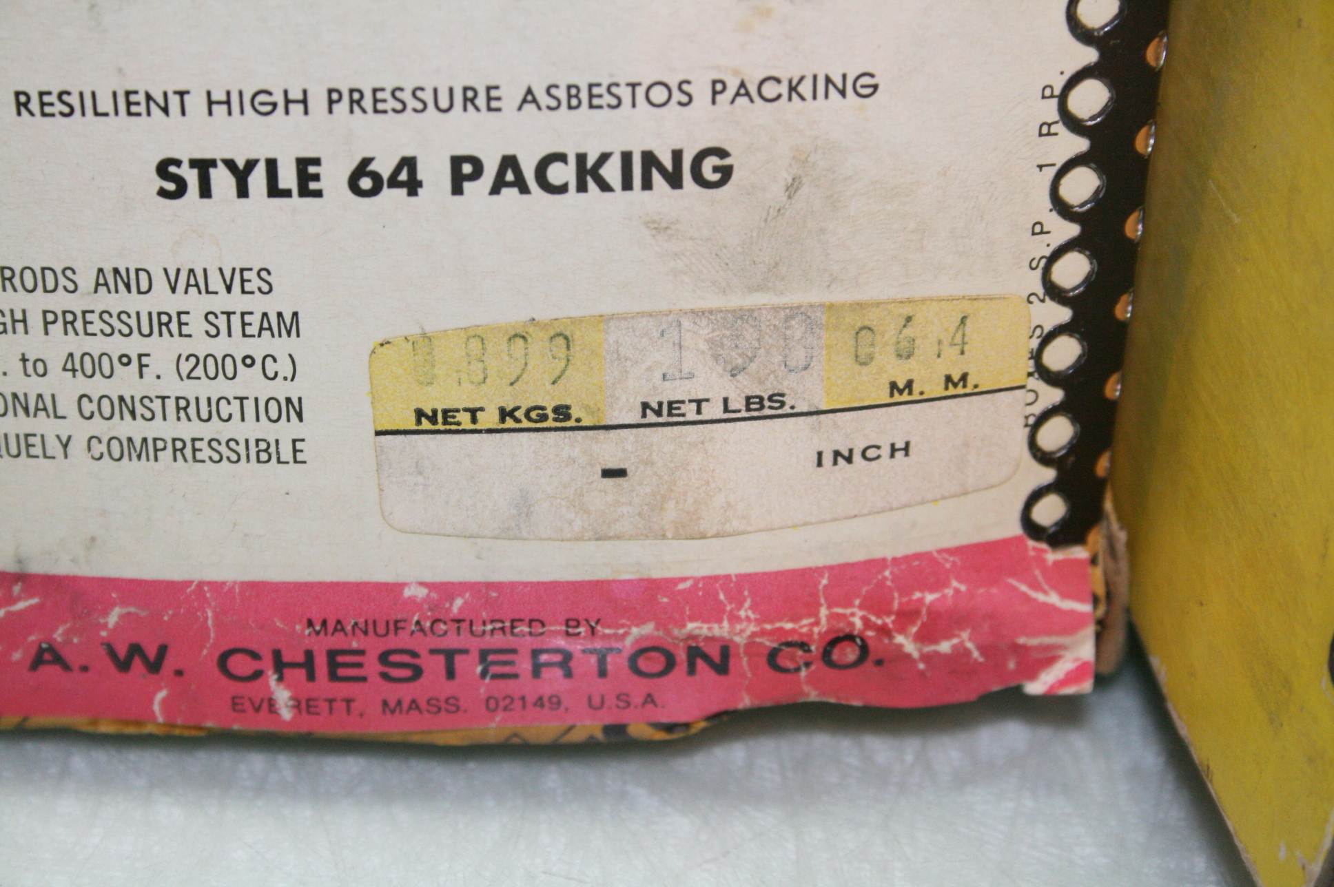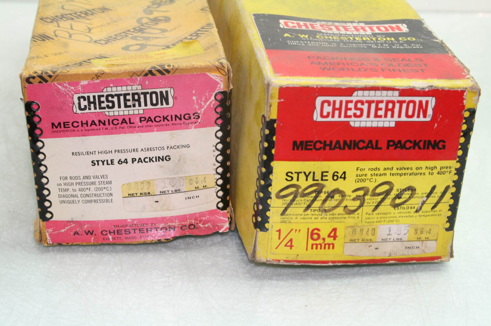 Here is two boxes of Chesterton type 64 mechanical packing. Both had a very slight amount of material cut from each packing spool, but there is well over 100′ left between the two. Both boxes are included as shown.Â