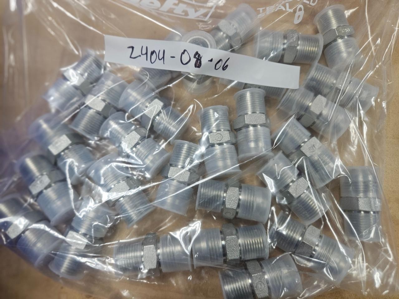 Here is a lot of (28) Brennan 2404-08-06 1/2″ male JIC flare to 3/8″ NPT hydraulic fitting. This purchase is for 28 new fittings as shown.Â