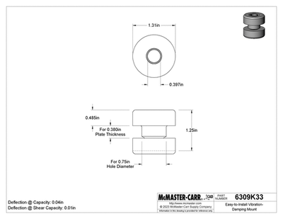 Here is a new bag of Barry Controls 22001-15 bonded tube mounts. These take a 3/8″ or M10 bolt and insert into a 0.75″ hole. Dimensional drawings are listed above. Each purchase is for four mounts. These are also McMaster part number 6309K33 and typically sell for $8.99 per mount. Home POLICIES CONTACT US ABOUT ME FEEDBACK view all items Menu Home POLICIES CONTACT US ABOUT ME FEEDBACK view all items Categories Ball Screws / Shaft Couplings Cable Chains Cables for Automation Cameras for Automation Contactors/Relays Control Systems and PLCs Heating/Cooling for Automation Hydraulics Gear Reducers / Gear Heads Lab/Analytical Equipment Lasers Linear Actuators Linear Guides Liquid Valves/Flow Controls Manufacturing / Metalworking Motors For Automation Optics Power Supplies/Circuit Breaker Pneumatic Actuators /Cylinders Pneumatic Valves Safety Hardware for Automation Sensors Servo Motors / Servo Drives Stepper Motors /Stepper Drives Switches For Automation Transformers Vaccum Equipment Wiring for Automation (4) New Barry Controls 22001-15 Bonded Tube Mount Vibration Isolator 22000 Mount Item Specifications