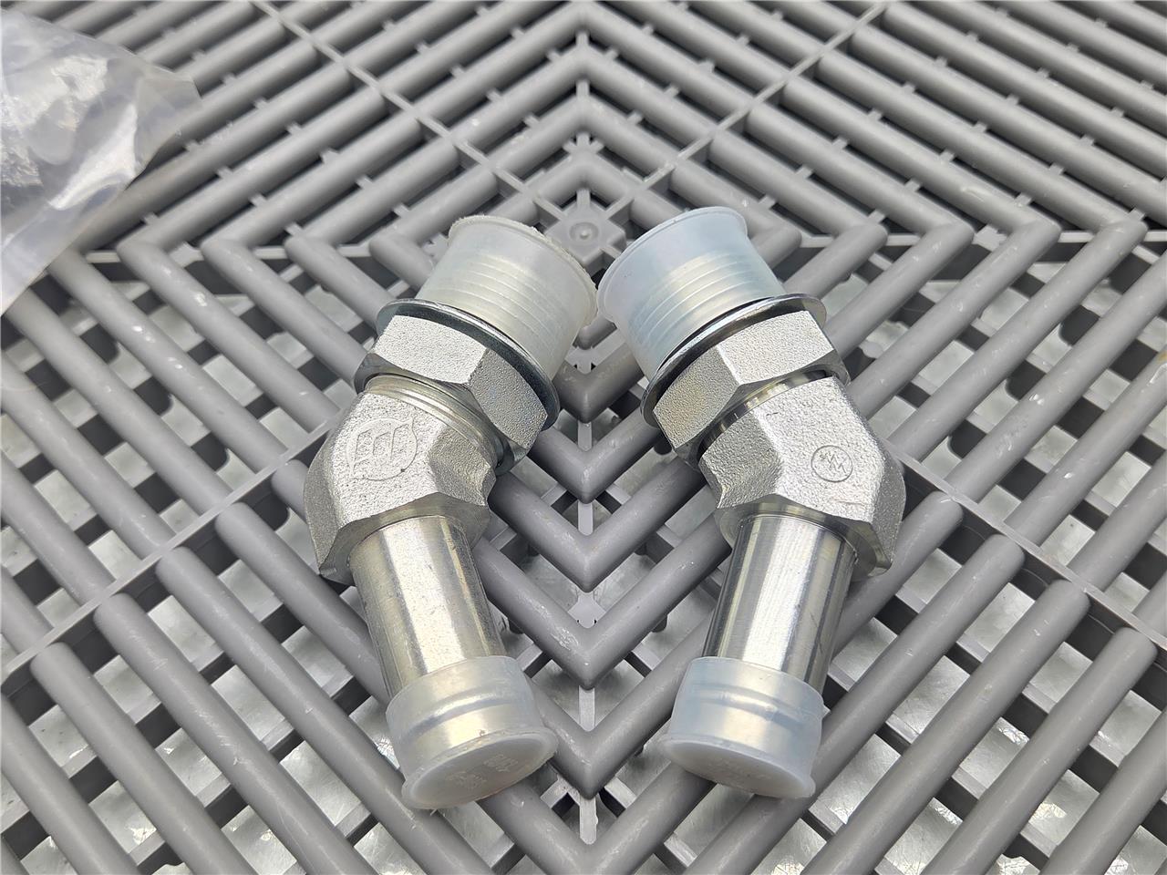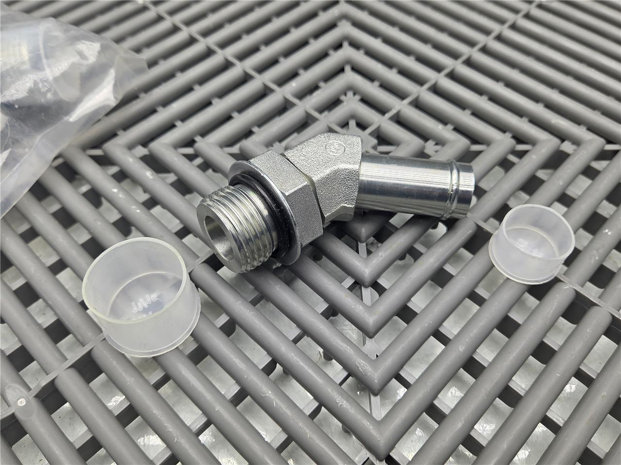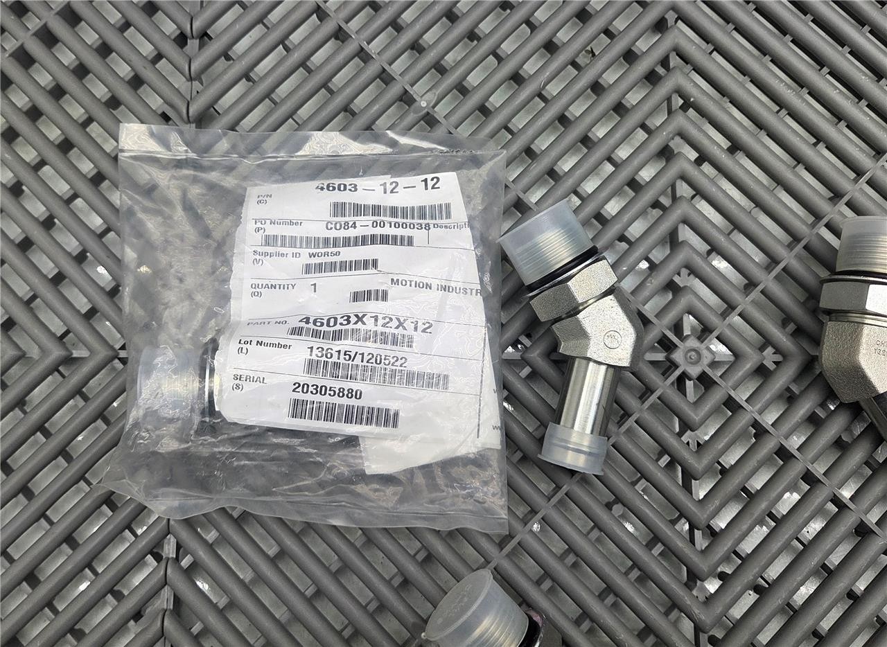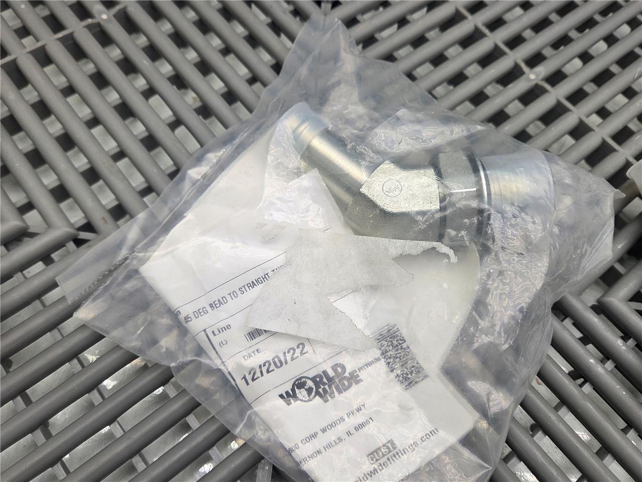 Here is a lot of 5, 45° Elbow 4603 Hose Bead to Threaded Straight Fitting, 4603-12-12. These are #12 SAE/ORB Male to 3/4″ Hose Bead tube fitting. All 5 are included as shown.