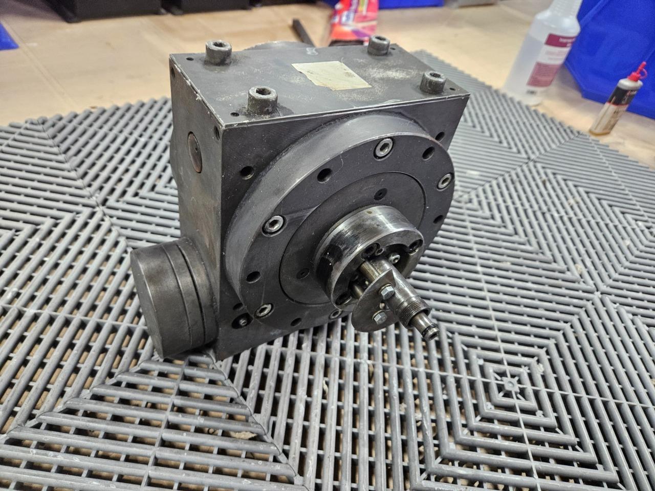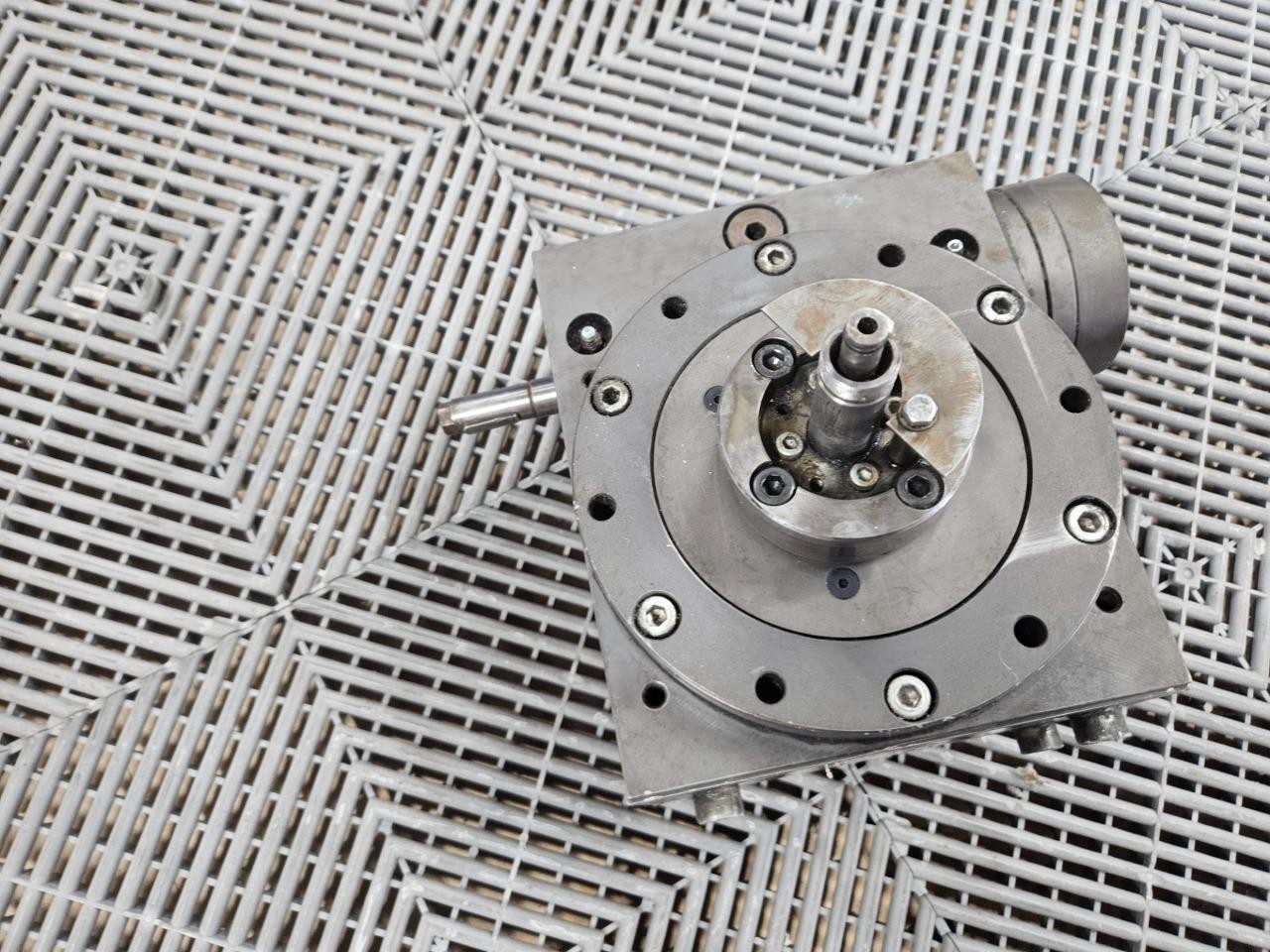 Here is an ESAB rotary table. This appears to have a rotary feedthrough installed for some type of gas or oil. It has an o-ring connection on one half of the output side and runs to those two threaded female ports on the adjacent side. The case has some grease stains and there are some scratch marks on an output shaft, but is otherwise in clean shape all around and rotates smoothly as shown in the video. The worm drive has a 100:1 ratio. Â