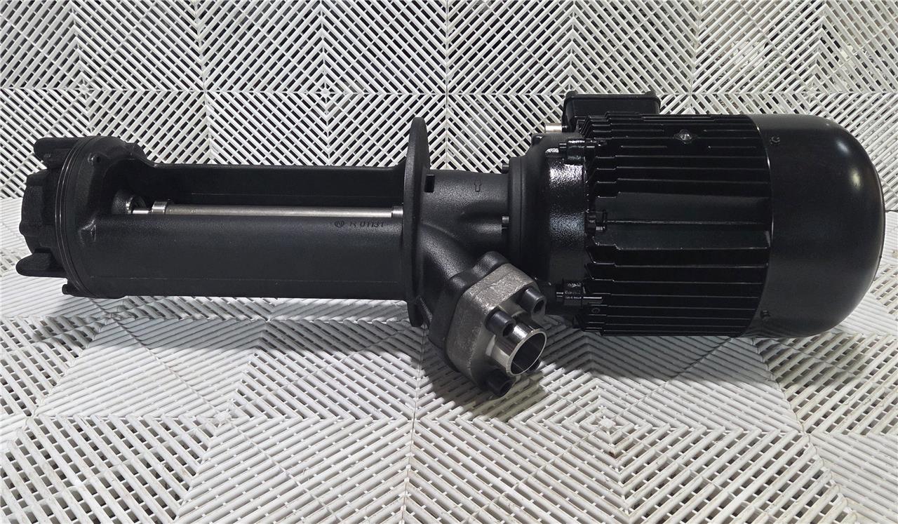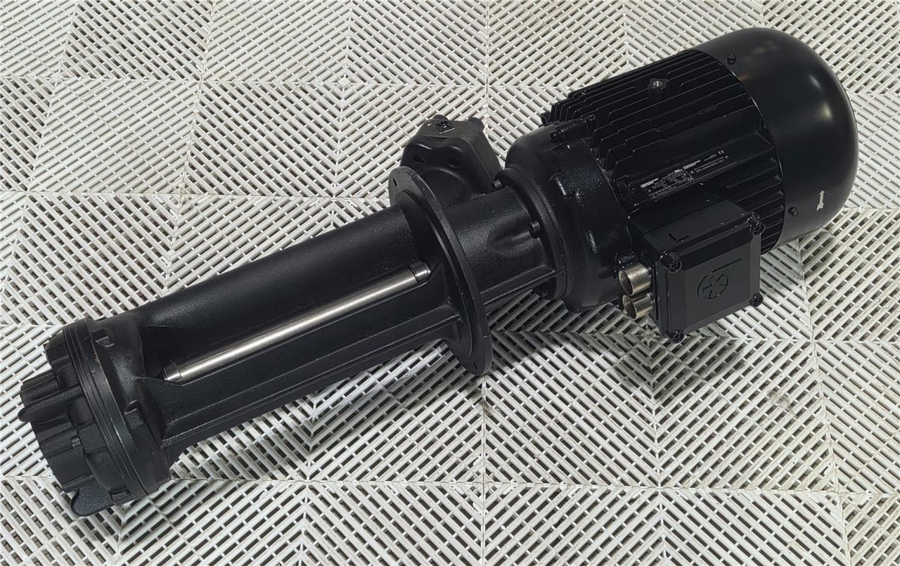Here is what appears to be a new Brinkmann immersion coolant pump. This is still in its original factory box with sealed ports. This has a 9.25 HP motor. It can pump up to 220 l/min. The pump head immersion depth is 444mm from the mounting flange (~17.5″). Further specs are listed above.Â