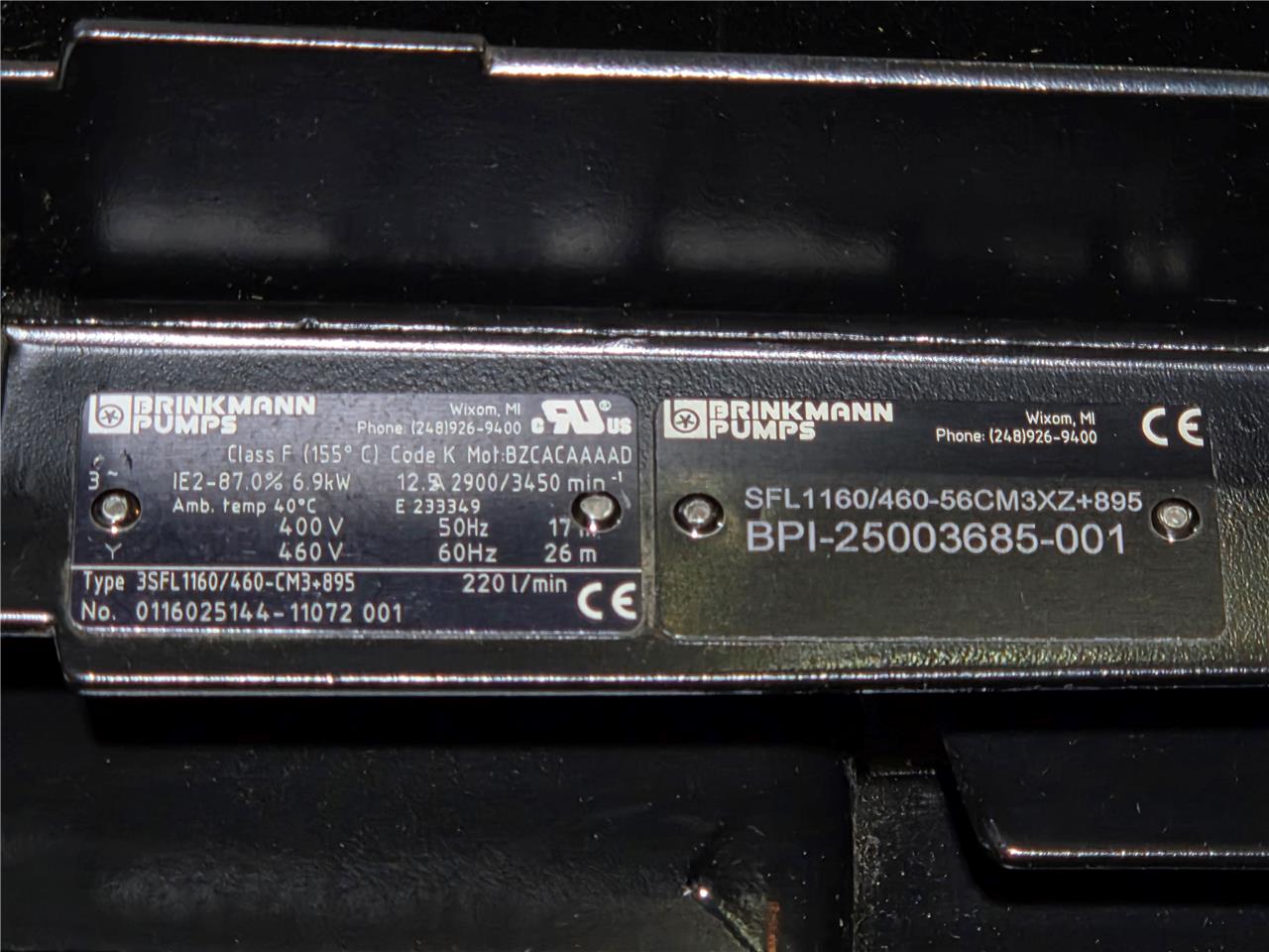 Here is what appears to be a new Brinkmann immersion coolant pump. This is still in its original factory box with sealed ports. This has a 9.25 HP motor. It can pump up to 220 l/min. The pump head immersion depth is 444mm from the mounting flange (~17.5″). Further specs are listed above. LTL flat rate shipping is a flat $200 to business addresses within the continental US. Home POLICIES CONTACT US ABOUT ME FEEDBACK view all items Menu Home POLICIES CONTACT US ABOUT ME FEEDBACK view all items Categories Ball Screws / Shaft Couplings Cable Chains Cables for Automation Cameras for Automation Contactors/Relays Control Systems and PLCs Heating/Cooling for Automation Hydraulics Gear Reducers / Gear Heads Lab/Analytical Equipment Lasers Linear Actuators Linear Guides Liquid Valves/Flow Controls Manufacturing / Metalworking Motors For Automation Optics Power Supplies/Circuit Breaker Pneumatic Actuators /Cylinders Pneumatic Valves Safety Hardware for Automation Sensors Servo Motors / Servo Drives Stepper Motors /Stepper Drives Switches For Automation Transformers Vaccum Equipment Wiring for Automation New Brinkmann SFL1160/460-56CM3XZ+895 Immersion Pump, 9.25 HP, 220 LPM Item Specifications