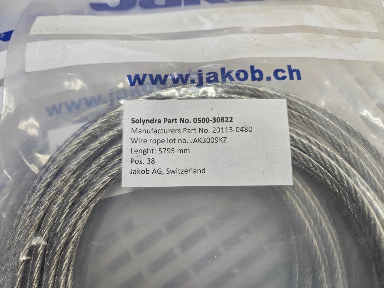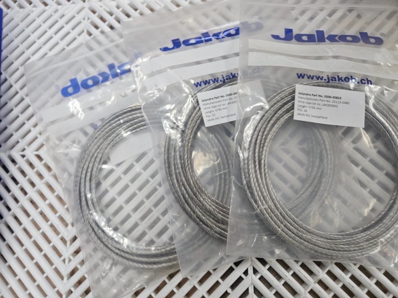 Here are some new reels of Jakob stainless steel wire rope. These are continuous loop sections. The rope is 4mm in outer diameter with a 5795 mm overall length. These are new in factory packaging as shown.