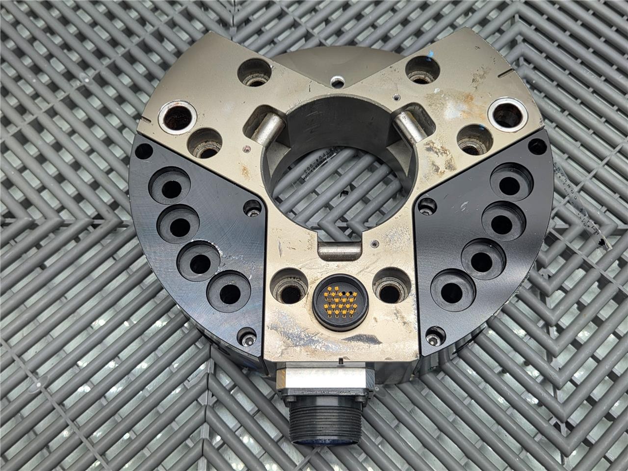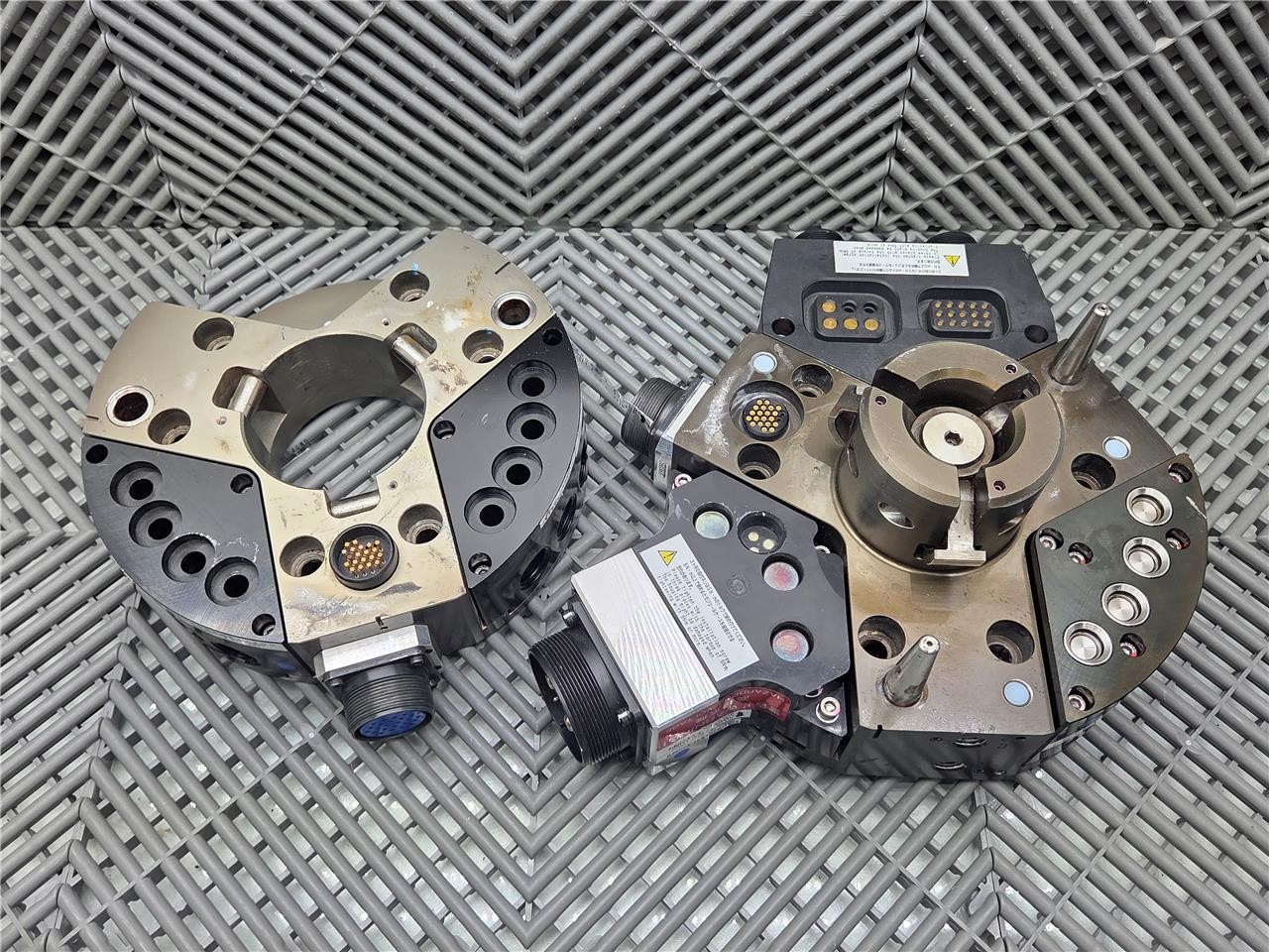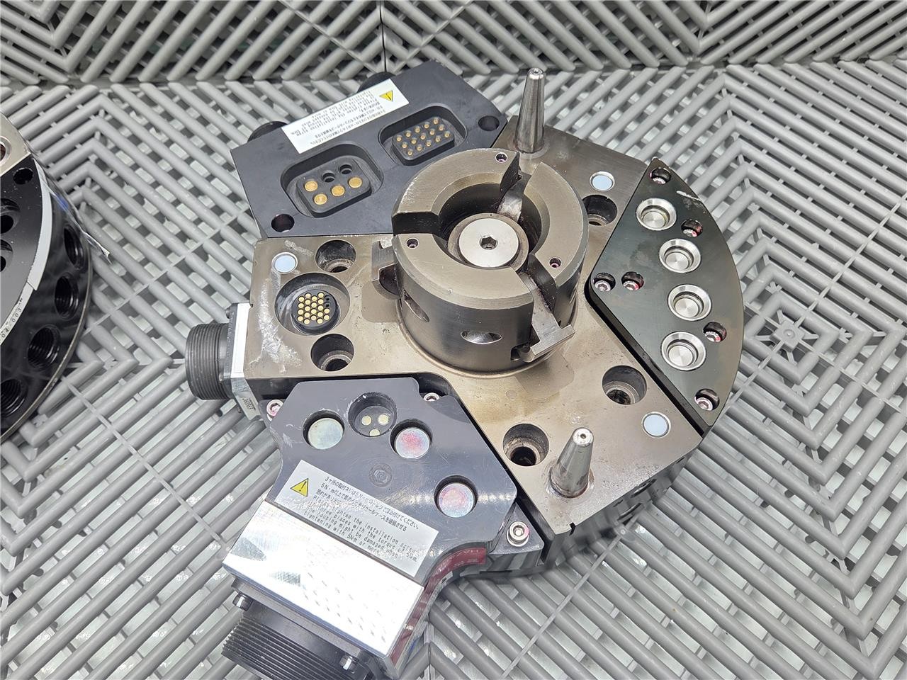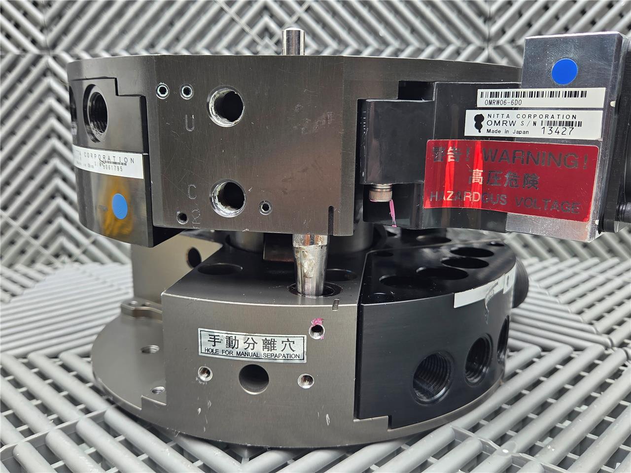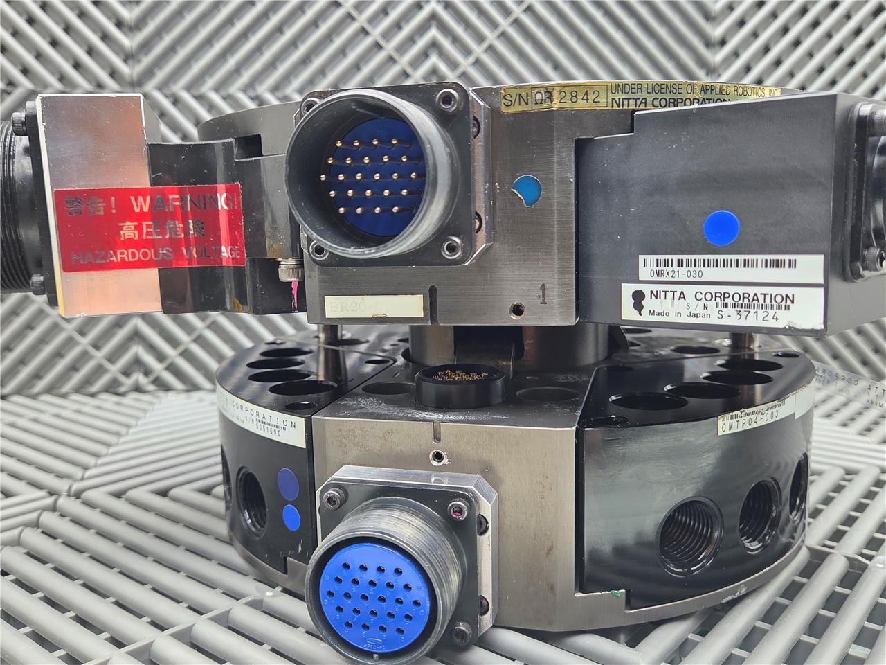 Here is a Nitta Corporation Omega IV Type L1000-OM robotic automatic tool changer / adaptor with modules. In good overall condition, pulled from working equipment. External marks and minor discoloration may be present, see photos. Includes the tool holder, mounting plate, and all modules seen. All ports and plugs seem to be in good functioning condition.