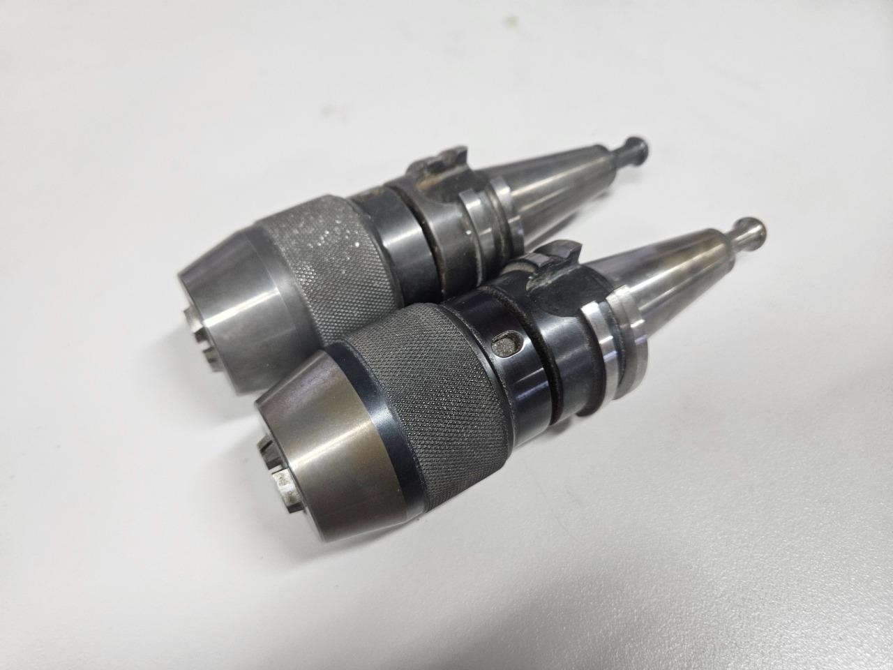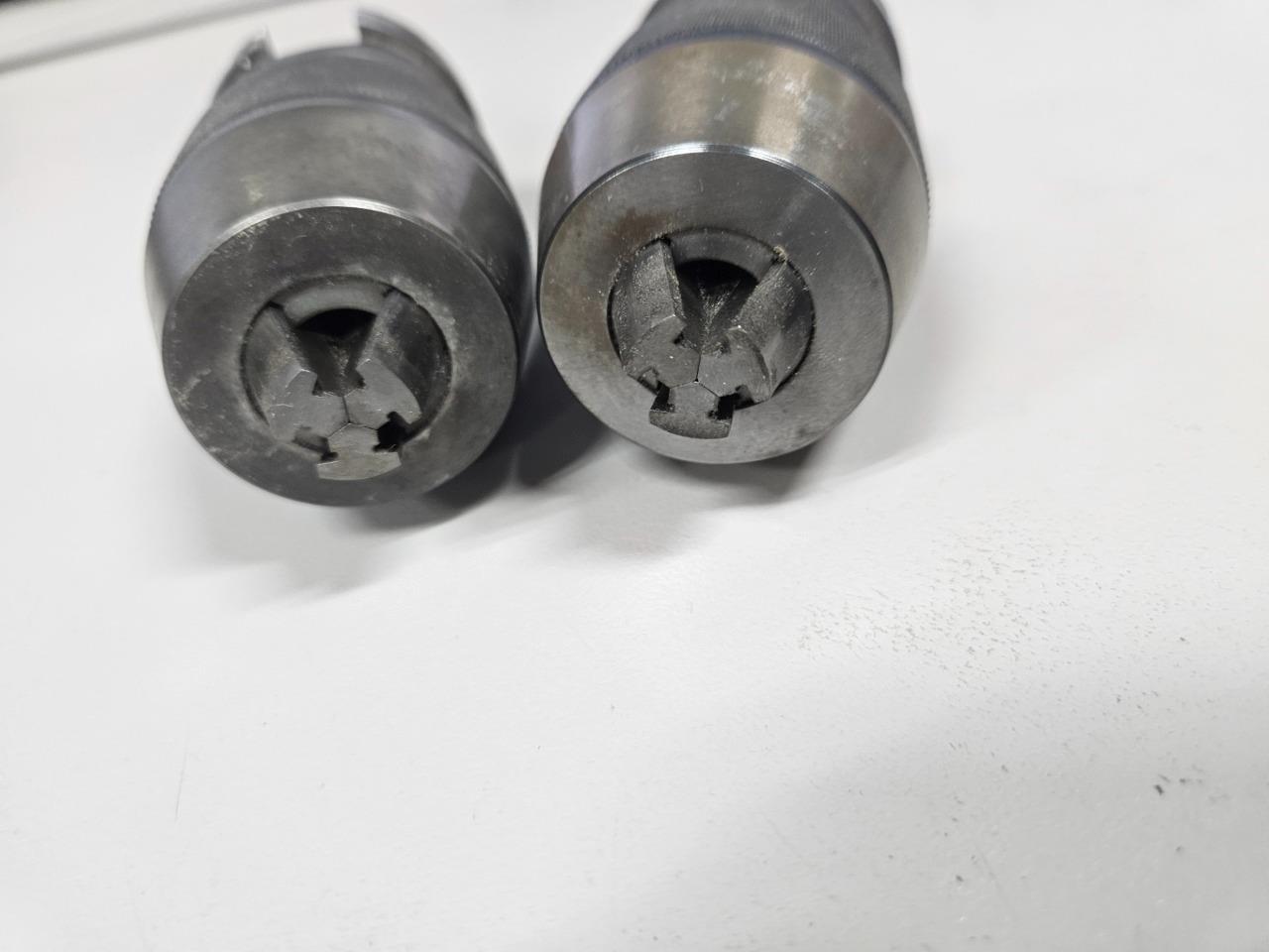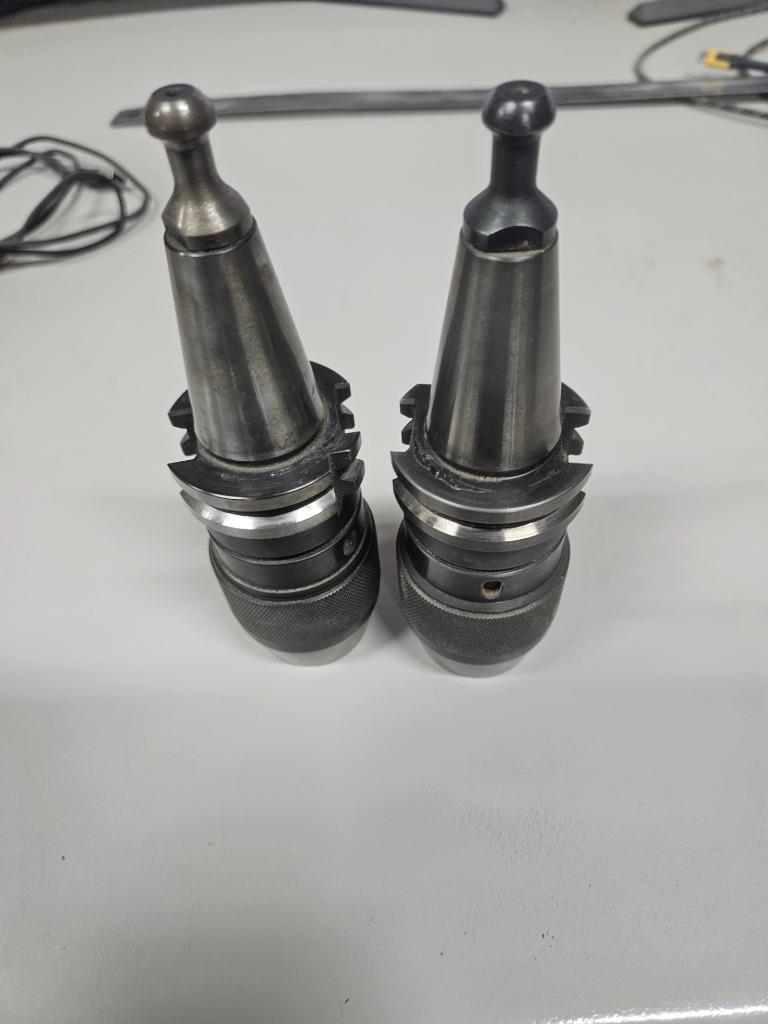 Here is a pair of IMTE keyless drill chucks. These were previously used on our CNC router for a short time. We switched to a different style keyless chuck that aligns better in our automatic holders since the router is a bit custom. These are in good shape. They just have some MDF dust in spots as shown, but are otherwise clean without damage. These are standard ISO30 taper chucks and currently have pull studs for an HSD spindle. Both chucks are included.