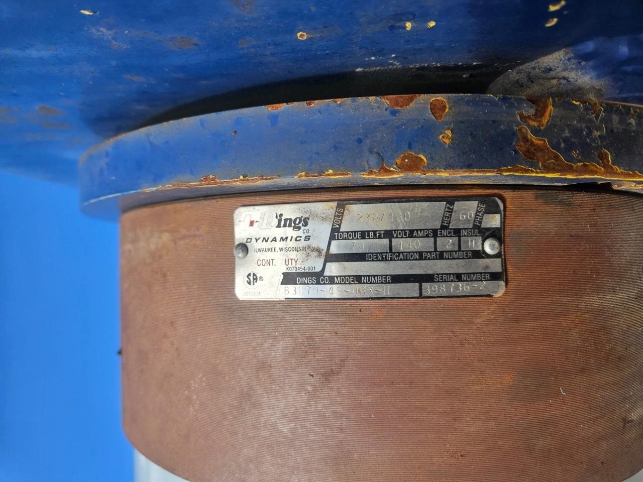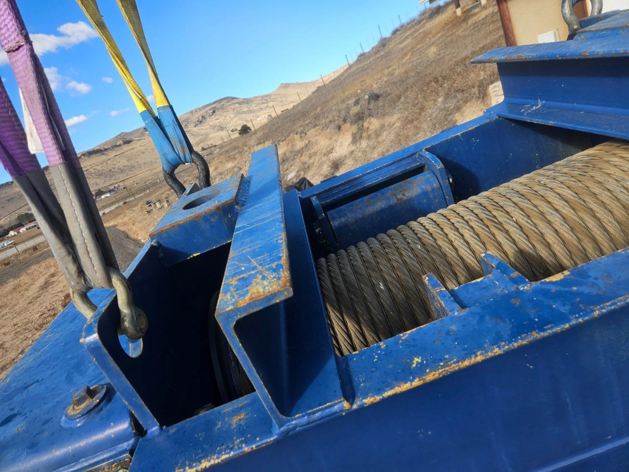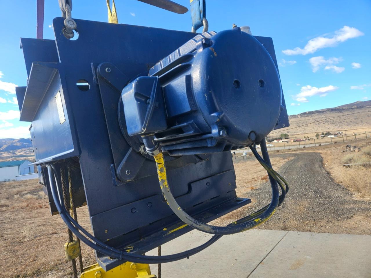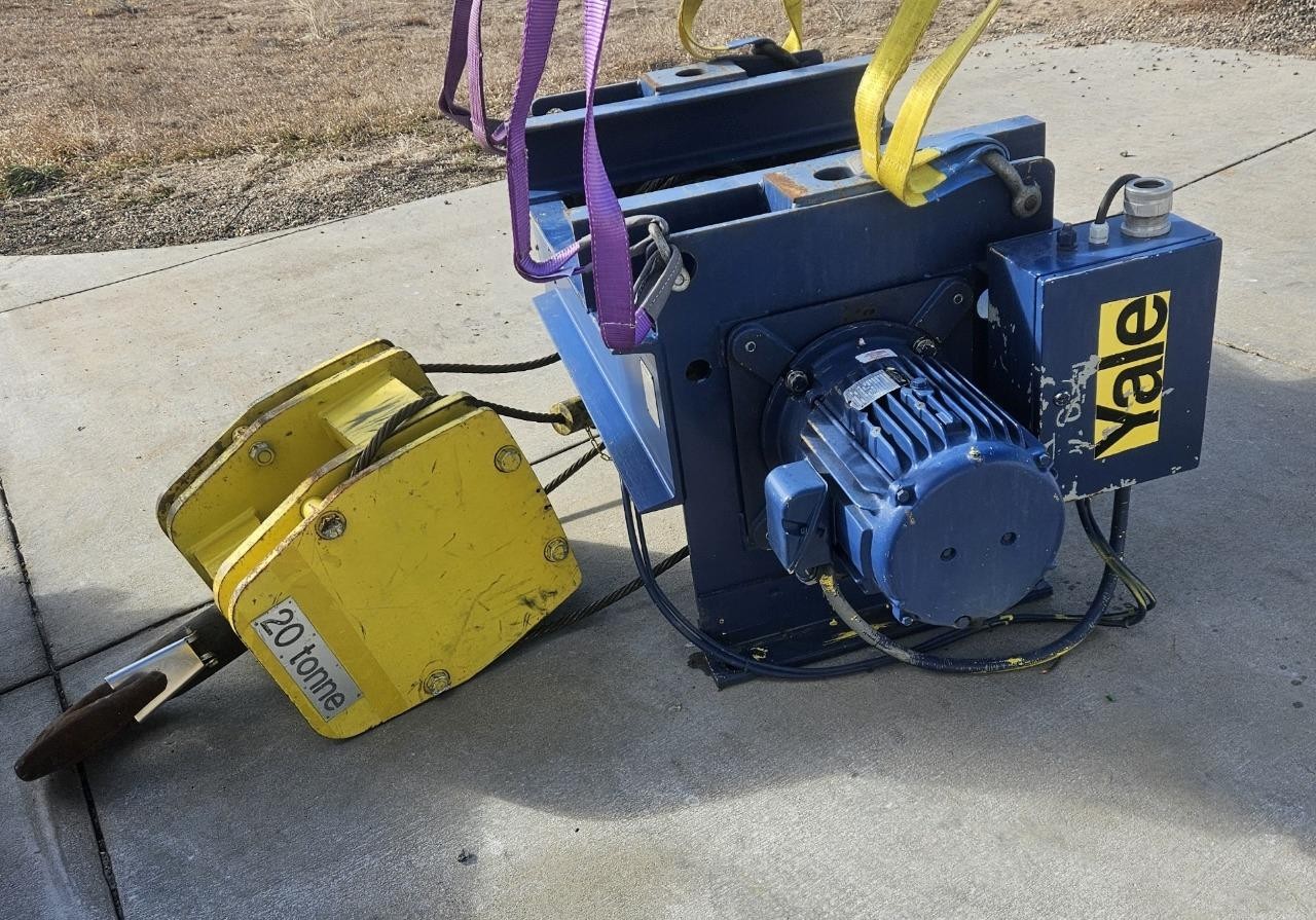 Here is a Yale EW series 20 metric ton hoist with a 35′ lift. This is a base mounted unit that is typically mounted to a larger trolley system. These were part of a line for manufacturing turbine blades. It was retired when the plant switched locations. It appears to be in good functional shape as shown. It has some paint scuffs and minor dents on the brake cover, but mechanically, all components look in good shape.