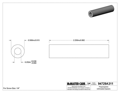 Here is a lot of 50 plastic unthreaded spacers. These are 1/4″ screw size, 1/2″ outer diameter and 2-1/4″ long. Each purchase is for 50 spacers (5 packs of 10). These are McMaster part number 94729A311. Home POLICIES CONTACT US ABOUT ME FEEDBACK view all items Menu Home POLICIES CONTACT US ABOUT ME FEEDBACK view all items Categories Ball Screws / Shaft Couplings Cable Chains Cables for Automation Cameras for Automation Contactors/Relays Control Systems and PLCs Heating/Cooling for Automation Hydraulics Gear Reducers / Gear Heads Lab/Analytical Equipment Lasers Linear Actuators Linear Guides Liquid Valves/Flow Controls Manufacturing / Metalworking Motors For Automation Optics Power Supplies/Circuit Breaker Pneumatic Actuators /Cylinders Pneumatic Valves Safety Hardware for Automation Sensors Servo Motors / Servo Drives Stepper Motors /Stepper Drives Switches For Automation Transformers Vaccum Equipment Wiring for Automation (50) New Polypropylene 1/4″ Unthreaded Spacers 1/2″ OD, 2-1/4″ Long 94729A311 Item Specifications