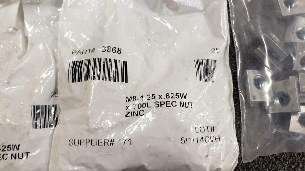 4/26 RL (25 each). The remaining 100 are loose in a zip lock bag as shown. In total, there are 478 t-nuts included. Home POLICIES CONTACT US ABOUT ME FEEDBACK view all items Menu Home POLICIES CONTACT US ABOUT ME FEEDBACK view all items Categories Ball Screws / Shaft Couplings Cable Chains Cables for Automation Cameras for Automation Contactors/Relays Control Systems and PLCs Heating/Cooling for Automation Hydraulics Gear Reducers / Gear Heads Lab/Analytical Equipment Lasers Linear Actuators Linear Guides Liquid Valves/Flow Controls Manufacturing / Metalworking Motors For Automation Optics Power Supplies/Circuit Breaker Pneumatic Actuators /Cylinders Pneumatic Valves Safety Hardware for Automation Sensors Servo Motors / Servo Drives Stepper Motors /Stepper Drives Switches For Automation Transformers Vaccum Equipment Wiring for Automation 8020 Inc. 3868 Slide In T-Nut M8 / Bags of 478 Nuts / 15 Series Item Specifications