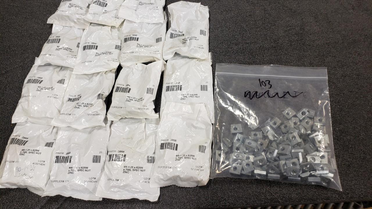 Here are some new 8020 15 series slide in metric M8 t-nuts. This includes a lot of 478 t-nuts. Most are in sealed 80/20 bags (25 each). The remaining 100 are loose in a zip lock bag as shown. In total, there are 478 t-nuts included.