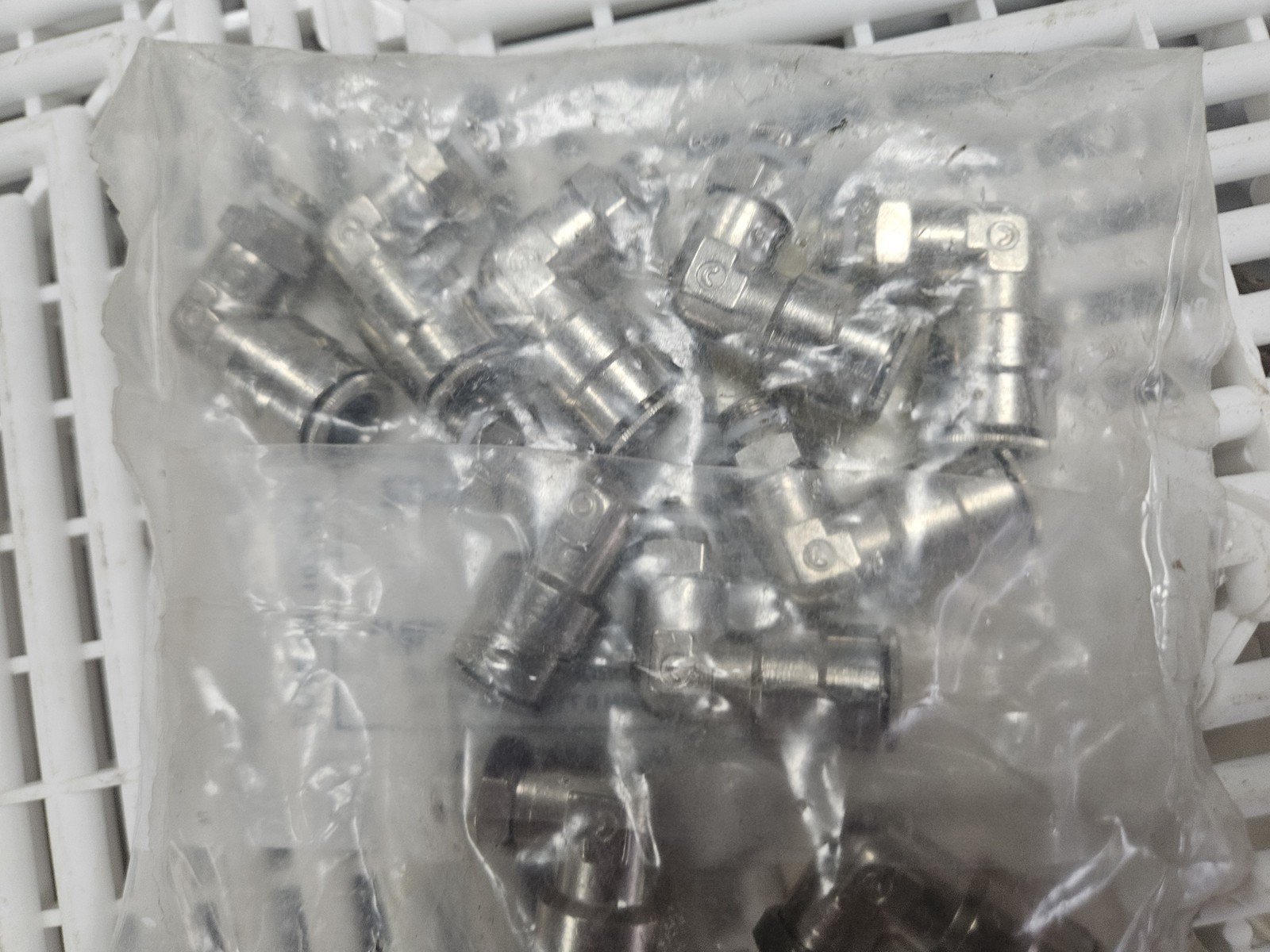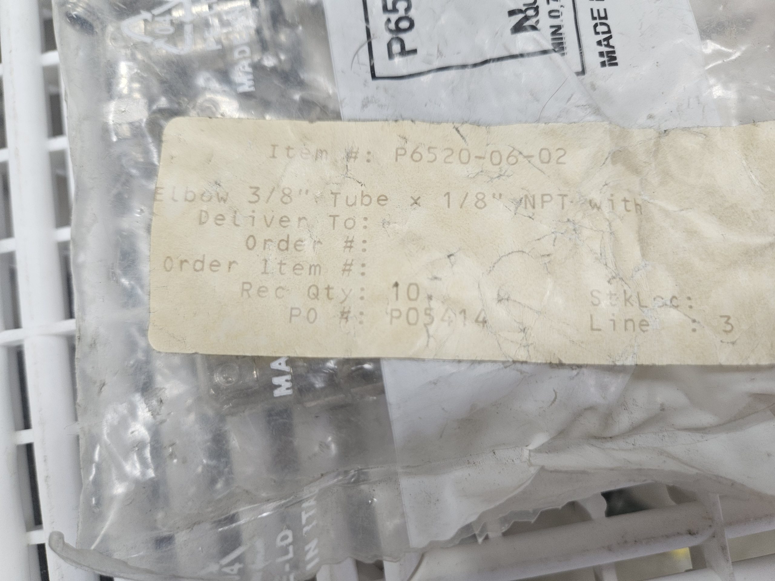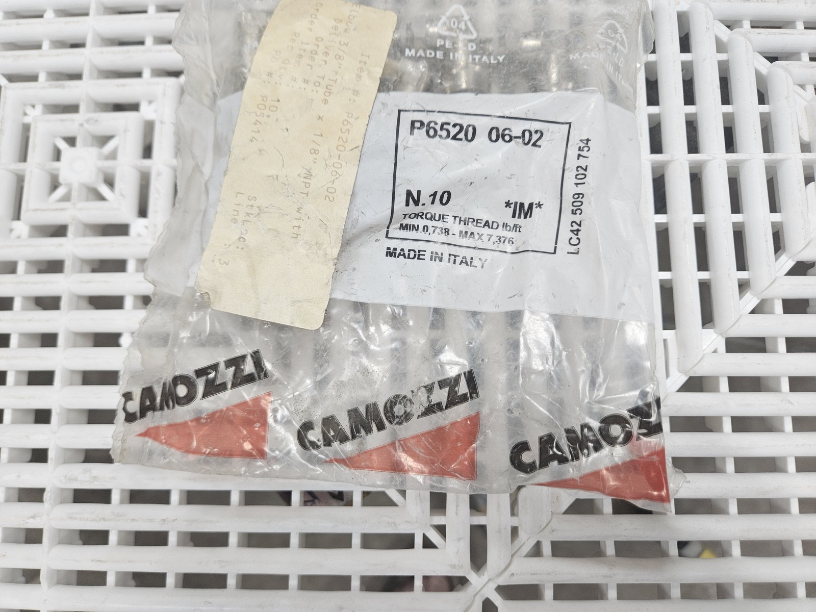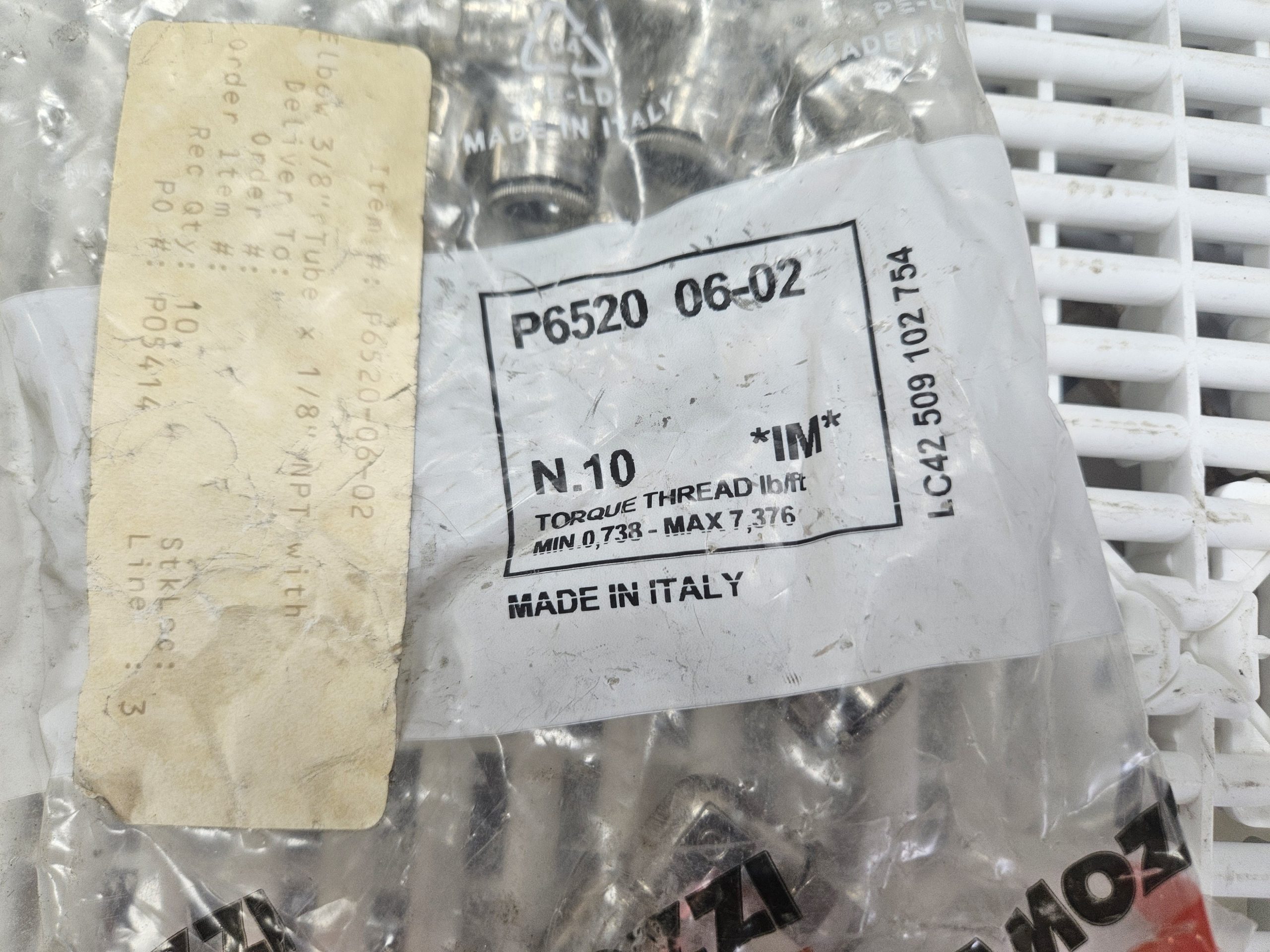 This listing is for one factory-sealed bag of 10 Camozzi P6520-06-02 swivel elbow push-to-connect pneumatic fittings, 3/8″ tube x 1/8″ NPT, made in Italy from nickel-plated brass. The bag is original, sealed, and unopened; fittings appear new and uninstalled with full quantity confirmed. The bag and label show some age and storage wear consistent with surplus inventory, but contents are in new condition. LOCATION: C-0504-K |