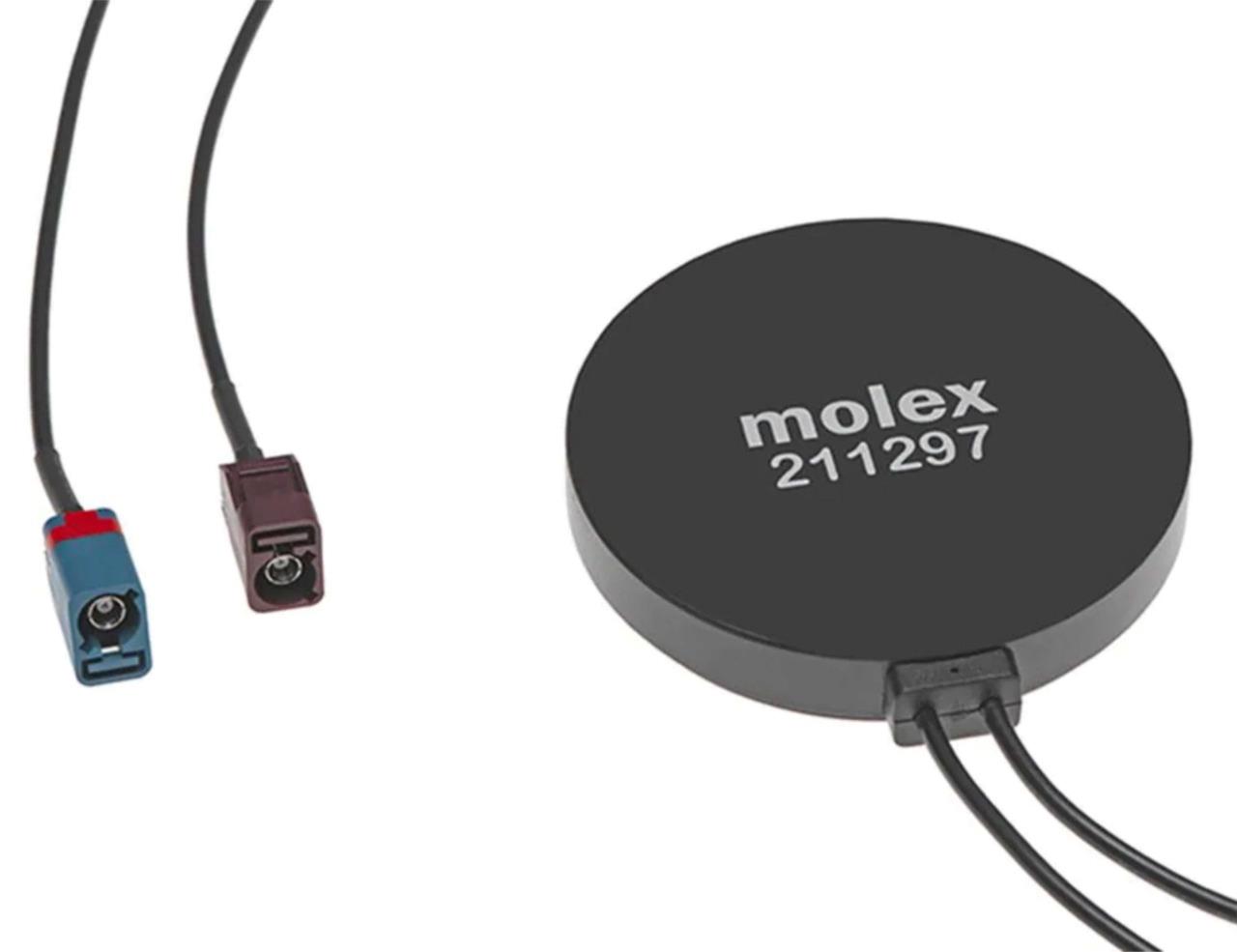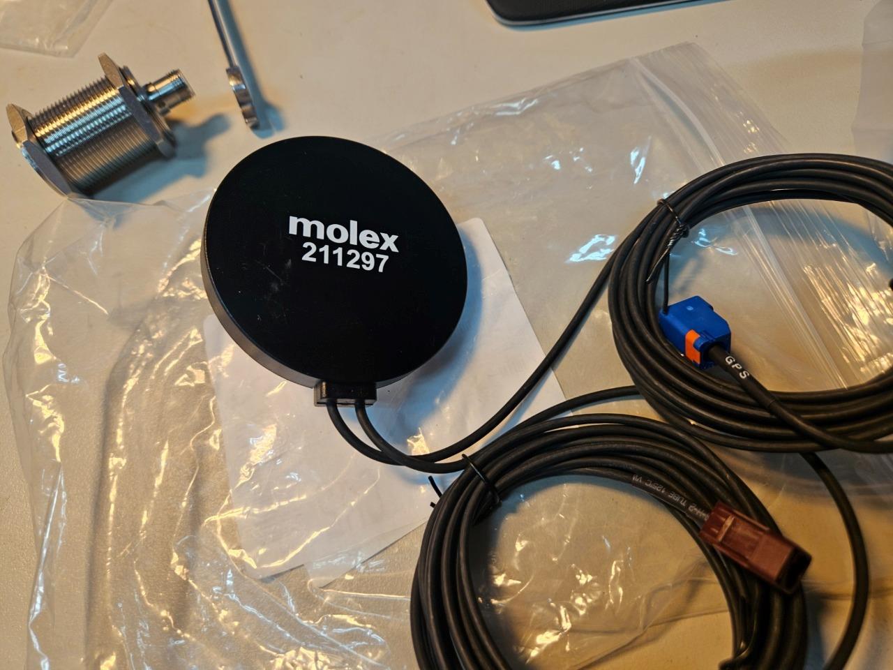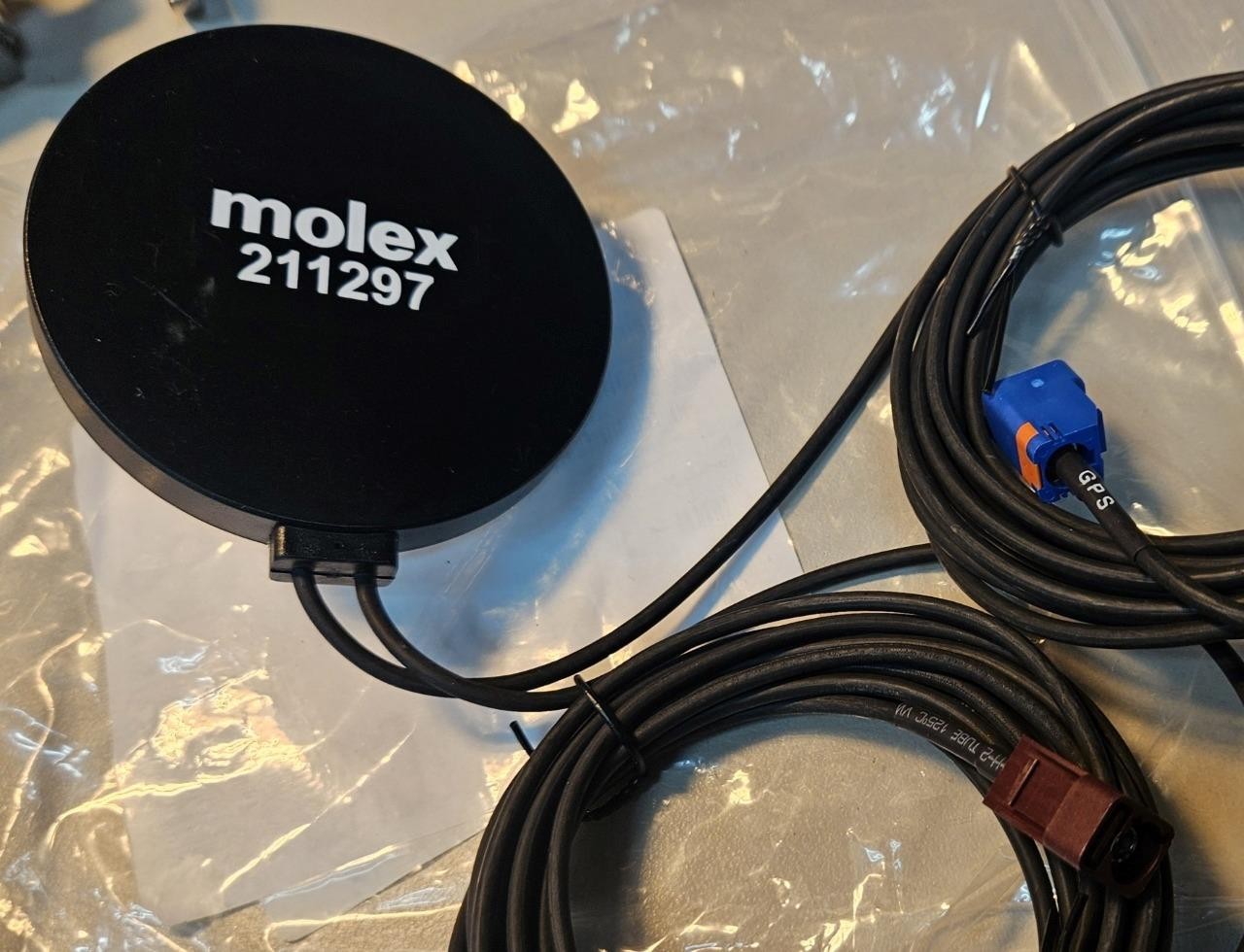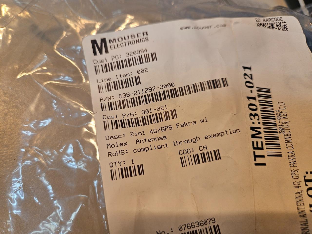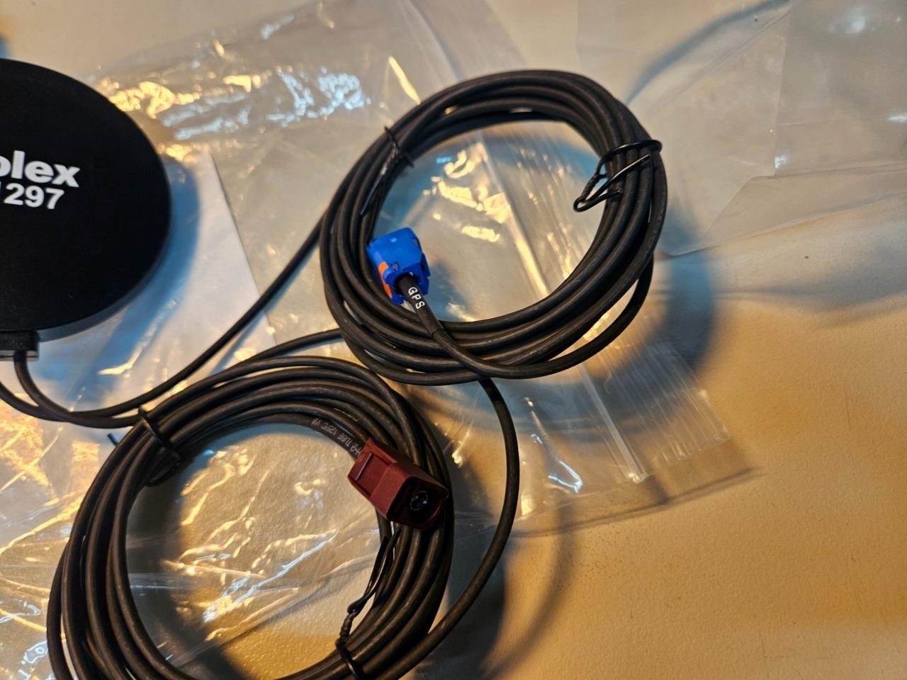 Here are some new Molex 211297 combination antennas. These are for 4G cellular and GPS. They are often used on vehicles or mobile applications and have Fakra style connection ends as shown. LOCATION: C0204 BIN: C-0204-F 07/24 ND 4/26 RL |