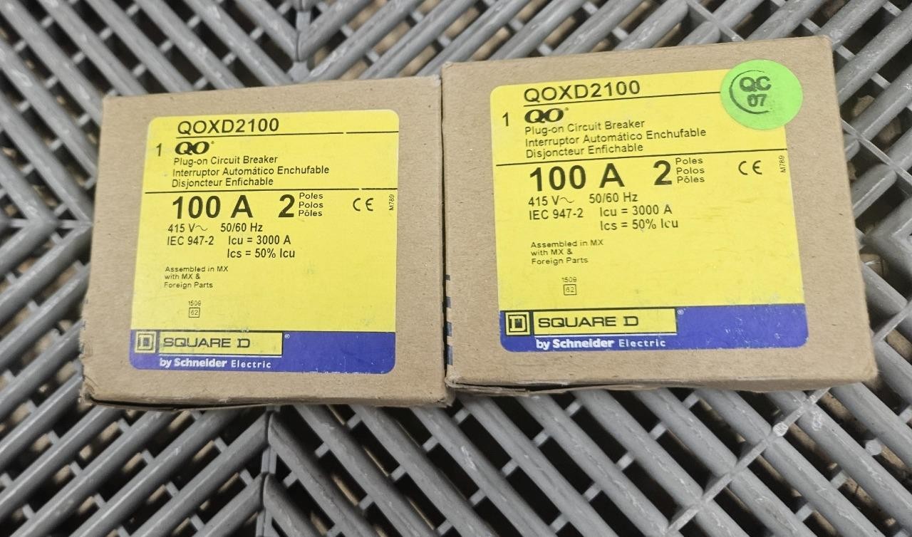 Here are some new Square D QOXD2100 circuit breakers. Please, note these are typically used overseas with 380/400/415V / 50 Hz distribution and have IEC 947.2 ratings. These breakers are new in factory boxes as shown. LOCATION: C0403 BIN: C-0403-A 06/24 ND 4/26 RL |