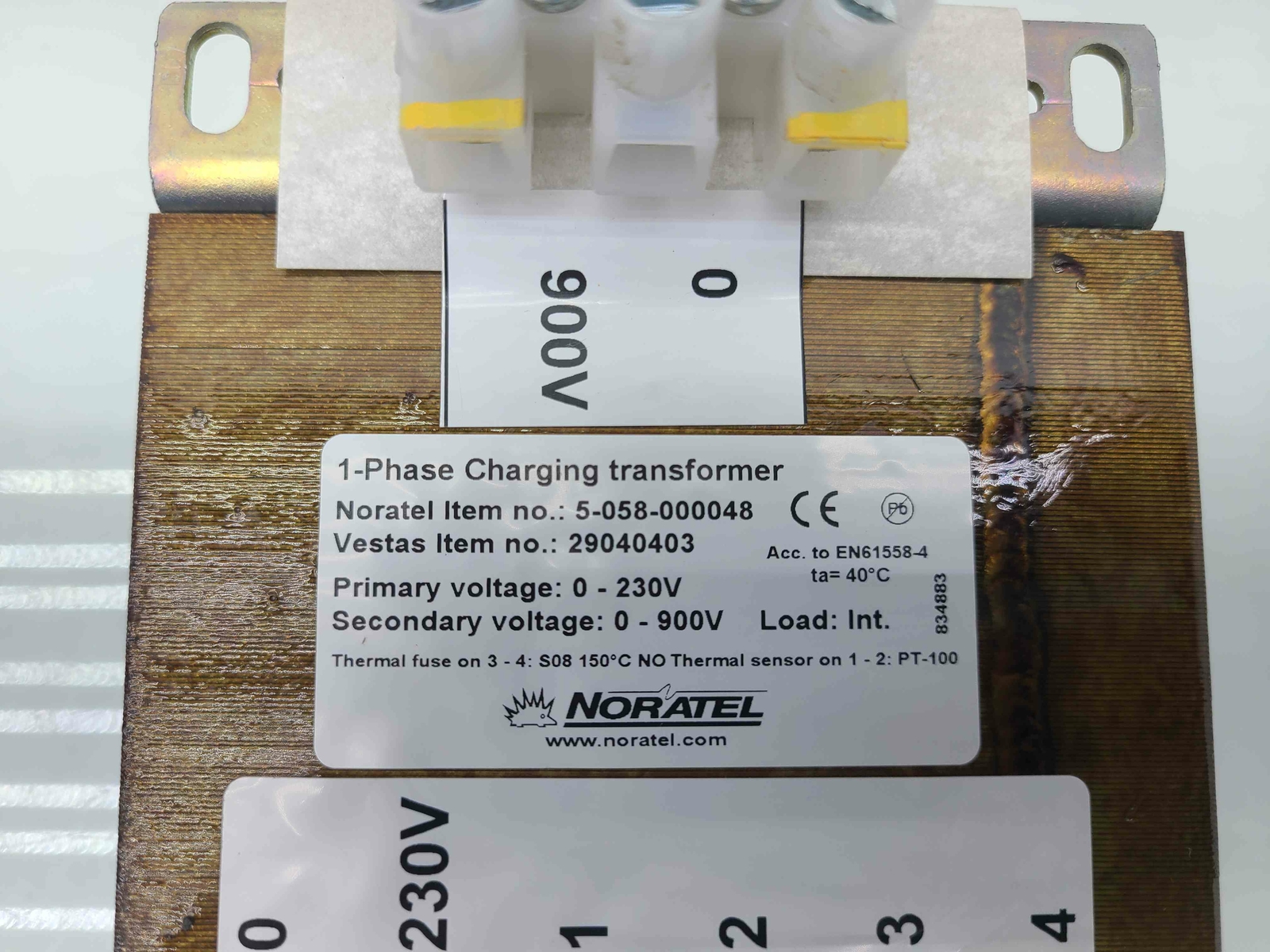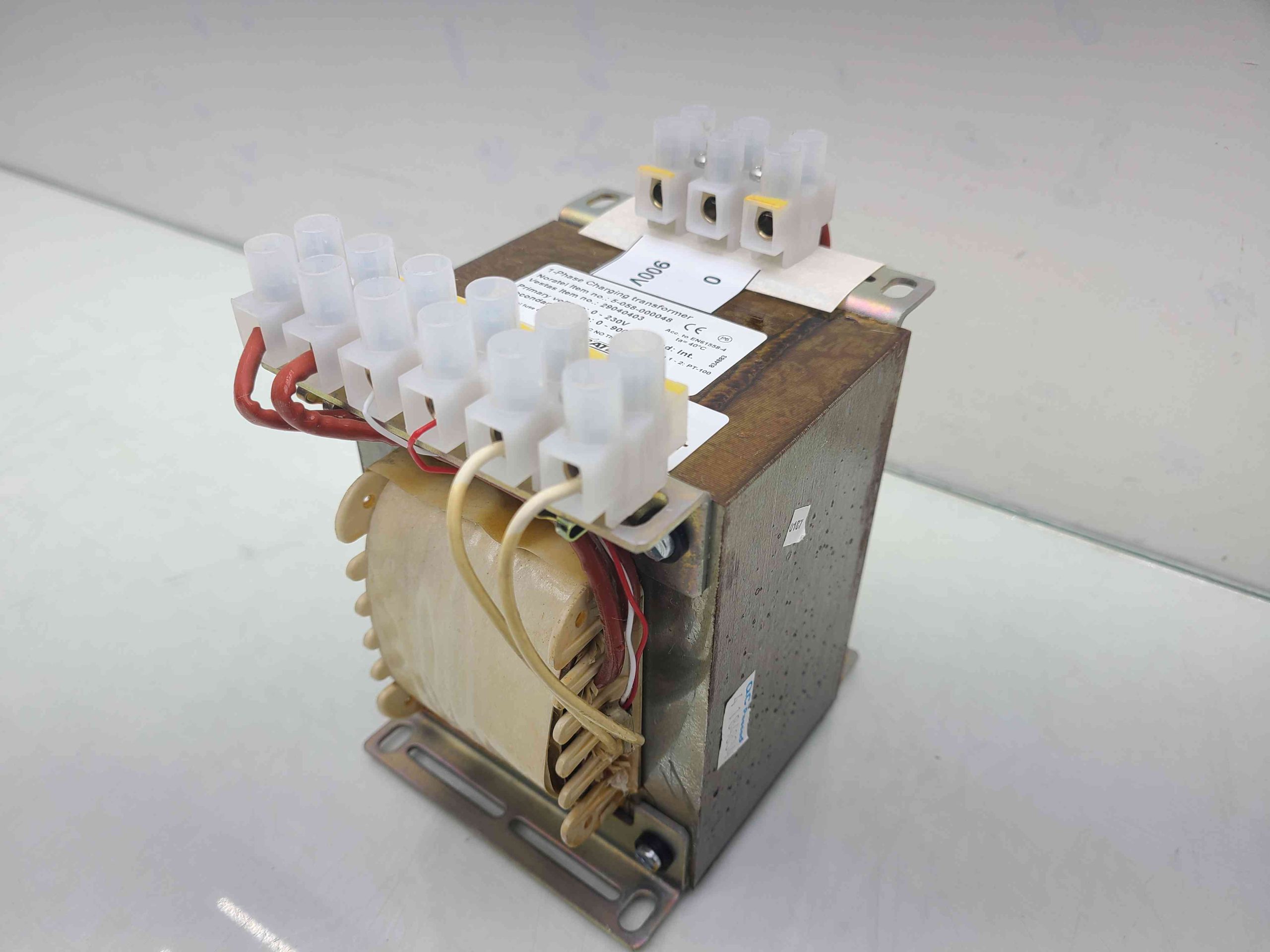 Here is a Noratel 1-Phase Charging Transformer 5-058-000048 0-230VAC, Vestas #29040403 in good condition with minimal wear, pulled from working equipment.