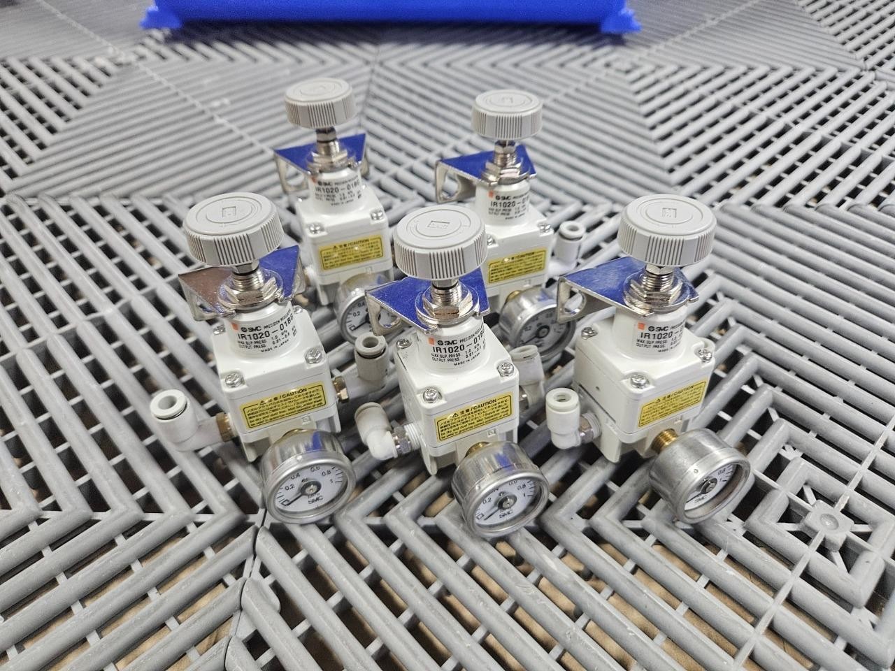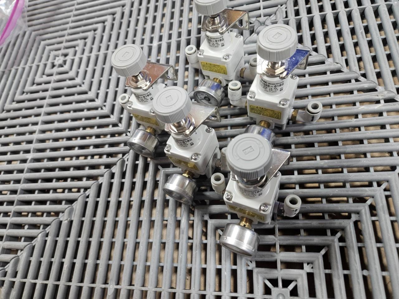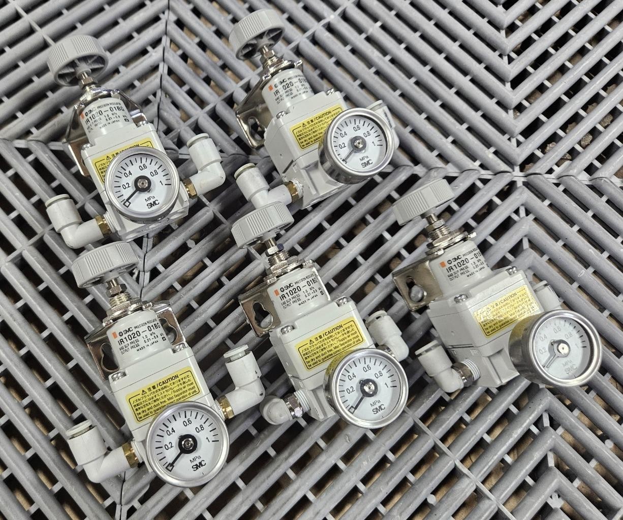 Here is a lot of 5 SMC precision pressure regulators. These are rated for a 1 MPa max input pressure (145 PSI) and regulate from 1.5 – 116 PSI. All include mounting brackets and 6mm tubing push to connect fittings installed as shown. These are in clean cosmetic shape as shown. All 5 are included. Â