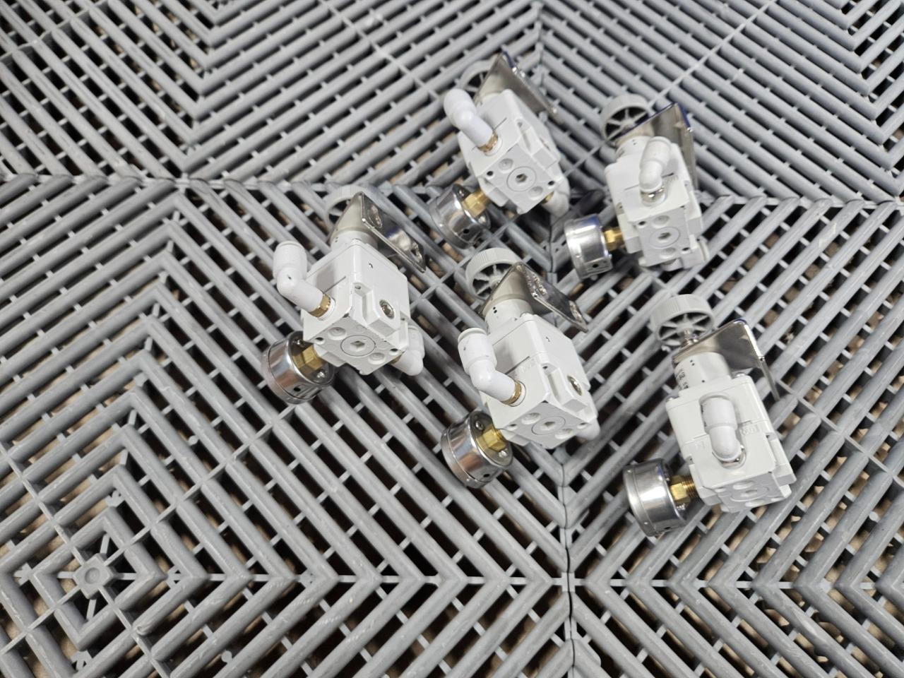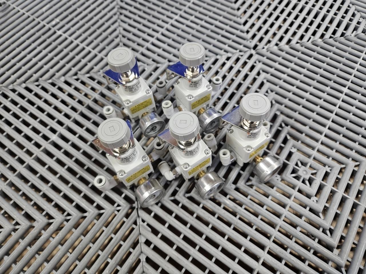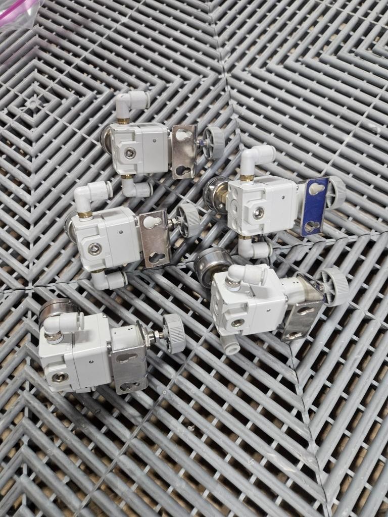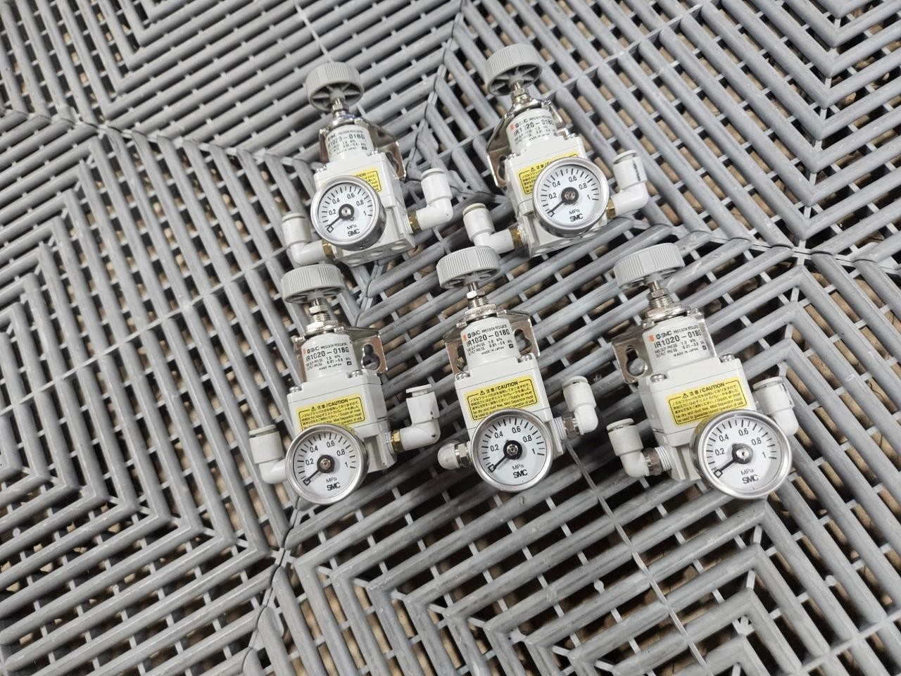Here is a lot of 5 SMC precision pressure regulators. These are rated for a 1 MPa max input pressure (145 PSI) and regulate from 1.5 – 116 PSI. All include mounting brackets and 6mm tubing push to connect fittings installed as shown. These are in clean cosmetic shape as shown. All 5 are included. Â