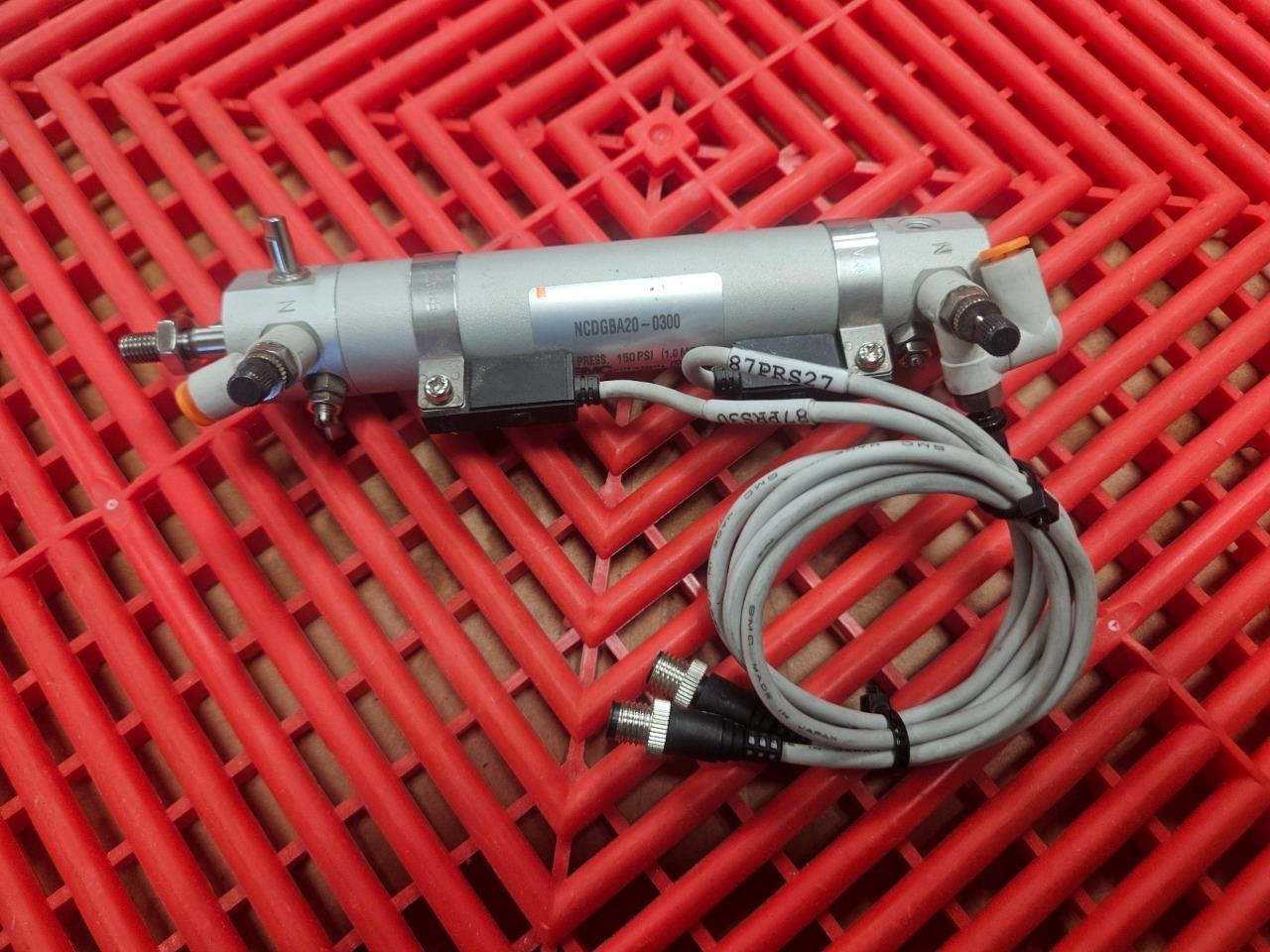Here is an SMC NCDGBA20-0300 air cylinder complete with D-H7A2 limit switches. This is in like new functional and cosmetic shape. Â