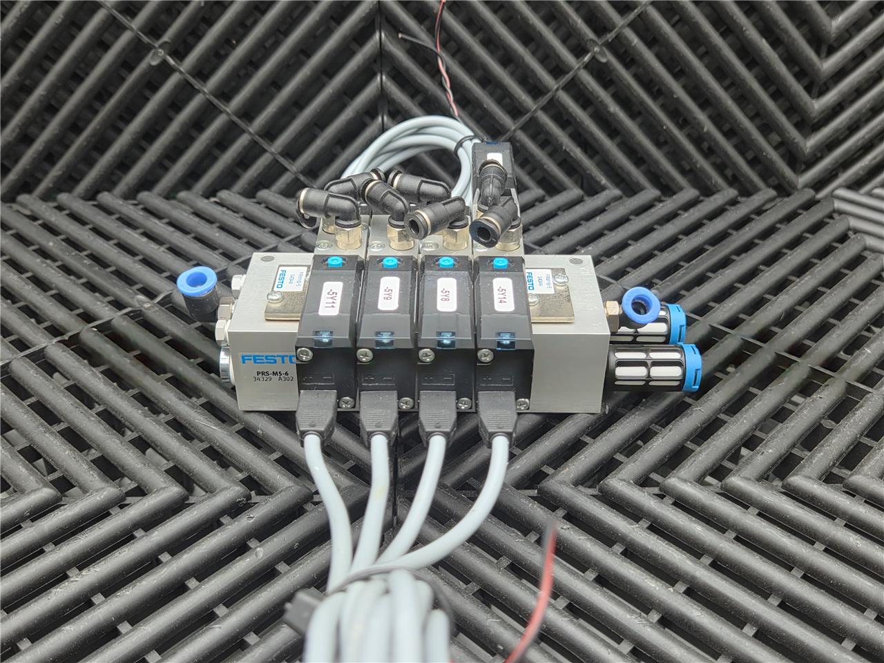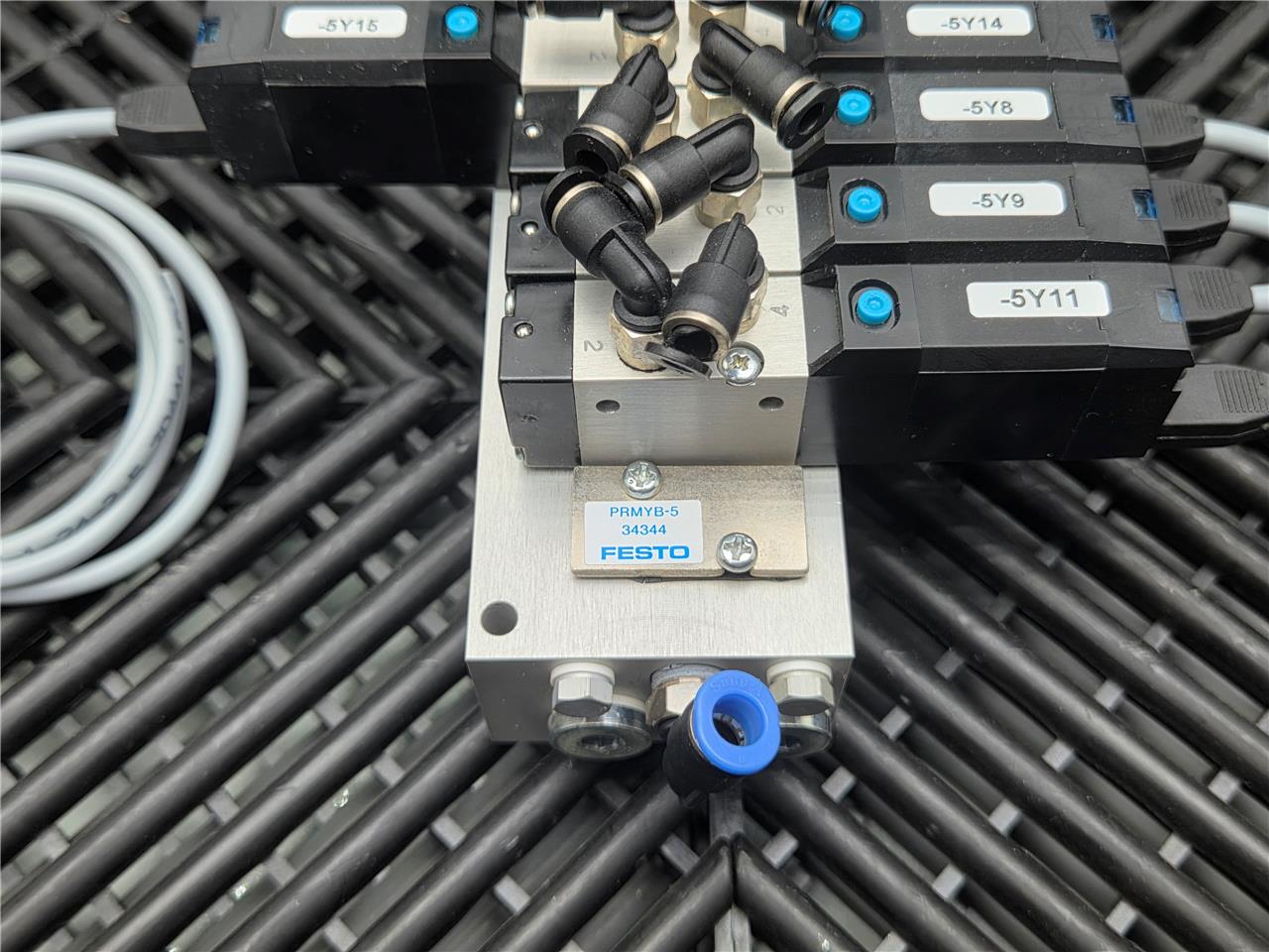 Here is a Festo 6-Slot Valve Manifold Block PRS-M5-6 with 1x 34307, 1x 34311, 2x 34309 Solenoid Valves. In good condition with minimal cosmetic wear, pulled from working equipment.
