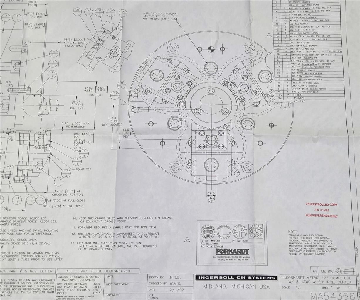 Here is a New Forkardt M15701A 3-Jaw 12″ UBL-Universal Ball Lok Pull-Down Chuck. This item is brand new in an open package. As such, it is in great overall condition. The DWG Spec sheet will be sent with this item, as shown in the pictures. Along with a few extra fastening screws (4).