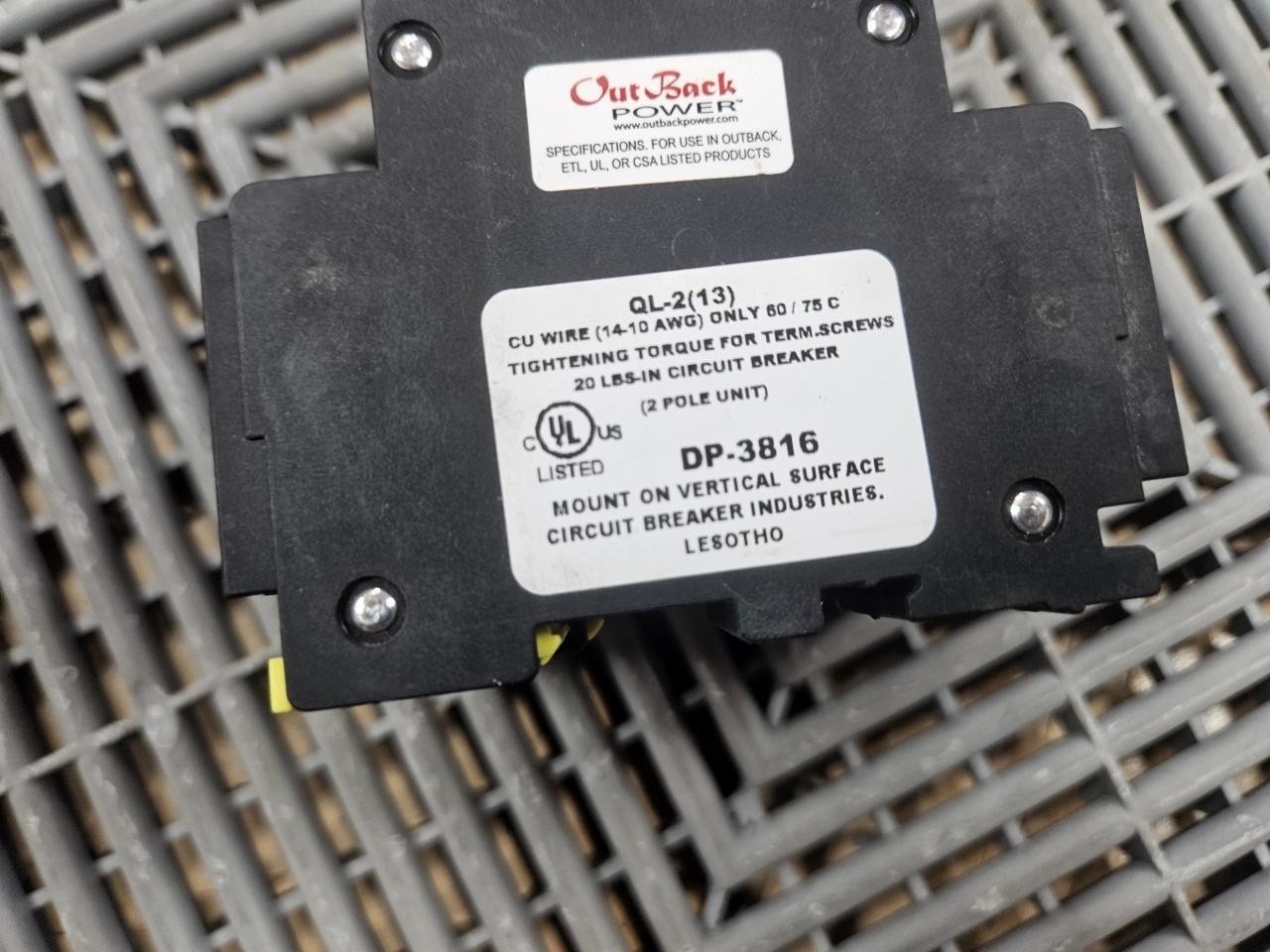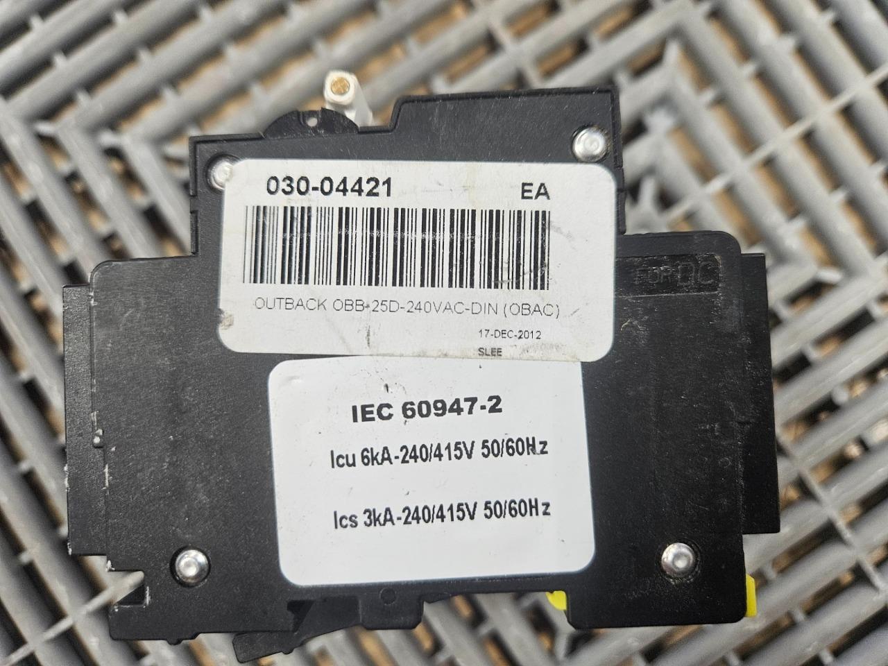 Here is a lot of 3 Outback Solar OBB-25D-240VAC-DIN circuit breakers (CBi DP-3816). These are new surplus from some solar installations and have never been installed. They were in a box on a shelf for a while so they might have some dust, but are otherwise unused. They are rated for 25 amps and 240/415V AC. All 3 are included as shown. Home POLICIES CONTACT US ABOUT ME FEEDBACK view all items Menu Home POLICIES CONTACT US ABOUT ME FEEDBACK view all items Categories Ball Screws / Shaft Couplings Cable Chains Cables for Automation Cameras for Automation Contactors/Relays Control Systems and PLCs Heating/Cooling for Automation Hydraulics Gear Reducers / Gear Heads Lab/Analytical Equipment Lasers Linear Actuators Linear Guides Liquid Valves/Flow Controls Manufacturing / Metalworking Motors For Automation Optics Power Supplies/Circuit Breaker Pneumatic Actuators /Cylinders Pneumatic Valves Safety Hardware for Automation Sensors Servo Motors / Servo Drives Stepper Motors /Stepper Drives Switches For Automation Transformers Vaccum Equipment Wiring for Automation (Qty 3) Outback OBB-25D-240VAC-DIN Solar Circuit Breaker 25A / 240V AC DP-3816 Item Specifications