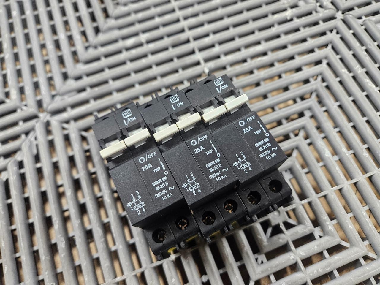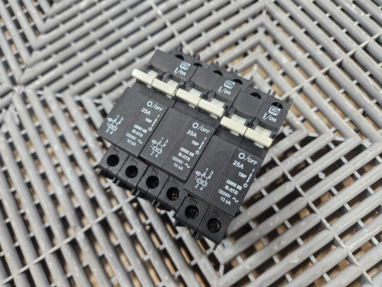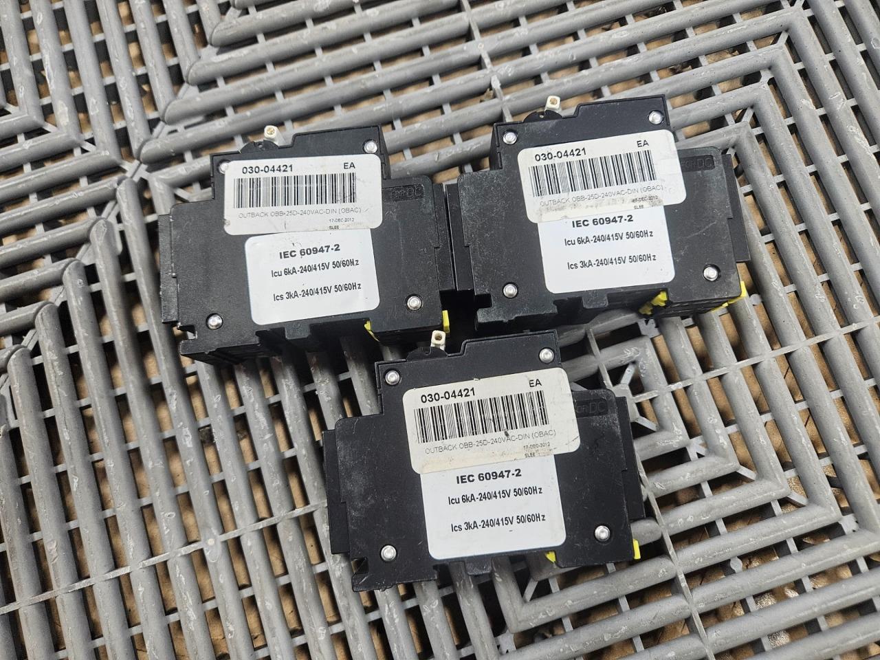 Here is a lot of 3 Outback Solar OBB-25D-240VAC-DIN circuit breakers (CBi DP-3816). These are new surplus from some solar installations and have never been installed. They were in a box on a shelf for a while so they might have some dust, but are otherwise unused. They are rated for 25 amps and 240/415V AC. All 3 are included as shown.