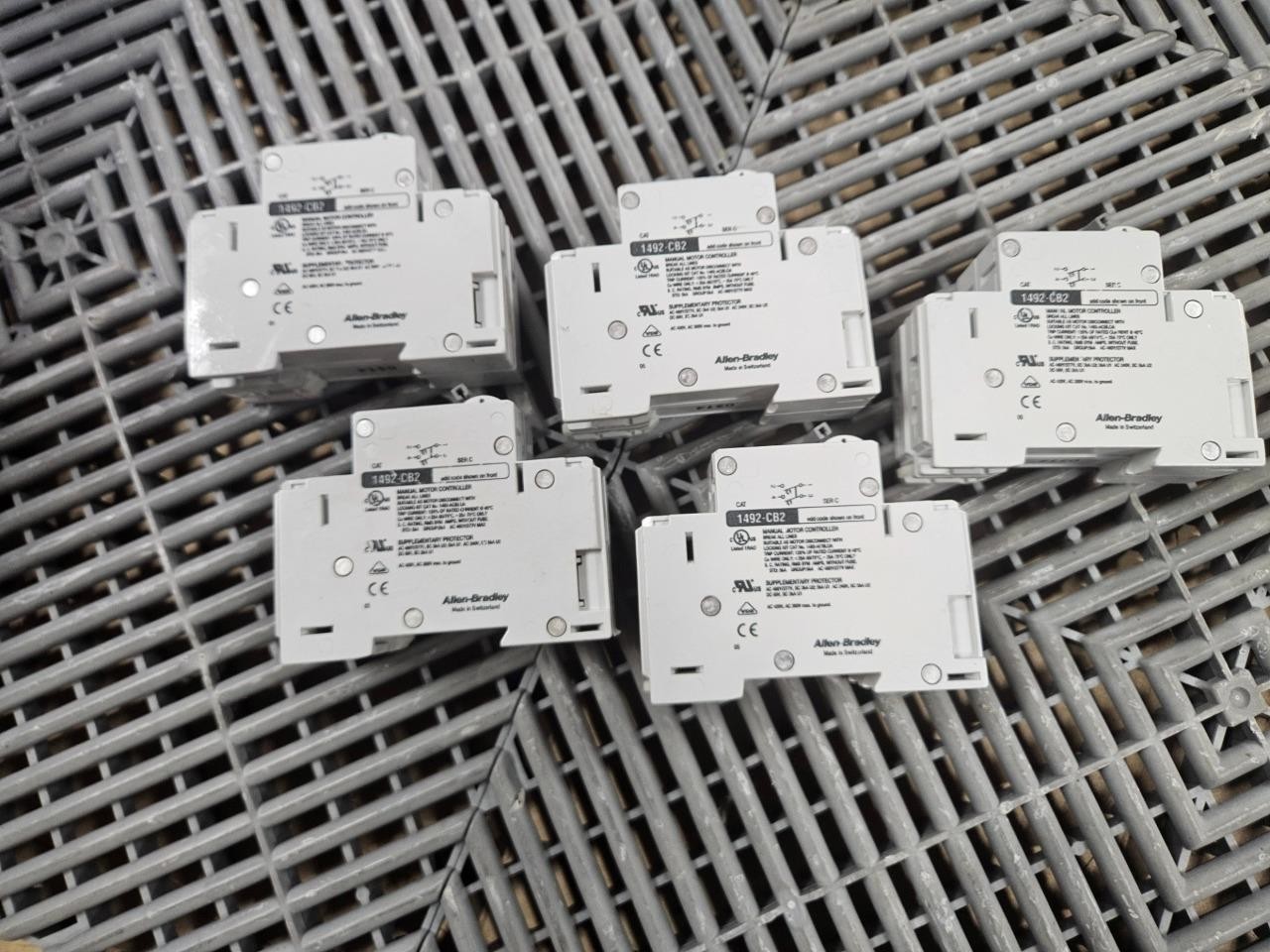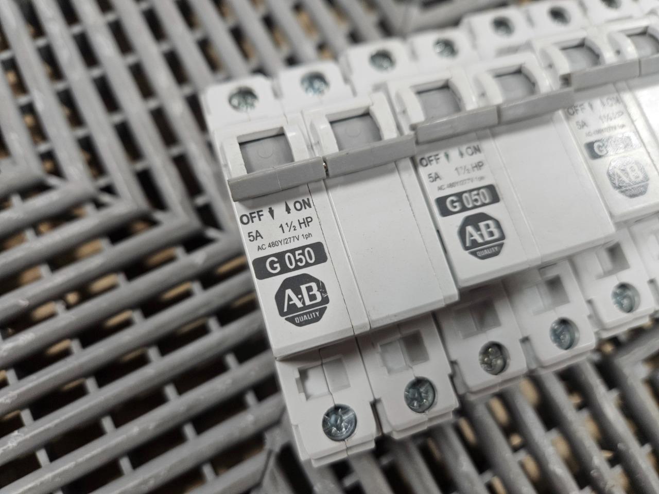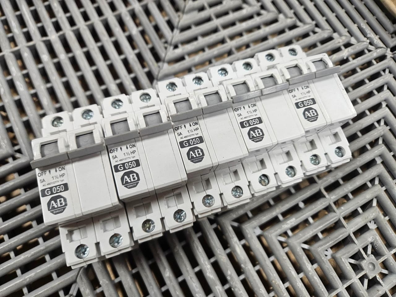 Here is a lot of Allen Bradley 1492-CB2G050 circuit breakers. All five are included as shown. These are rated for 5A and up to 480V AC. In good functional and cosmetic shape as shown.