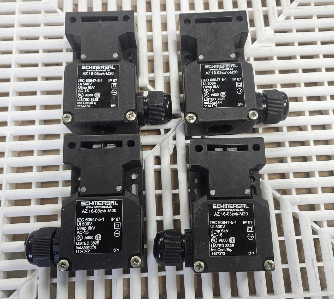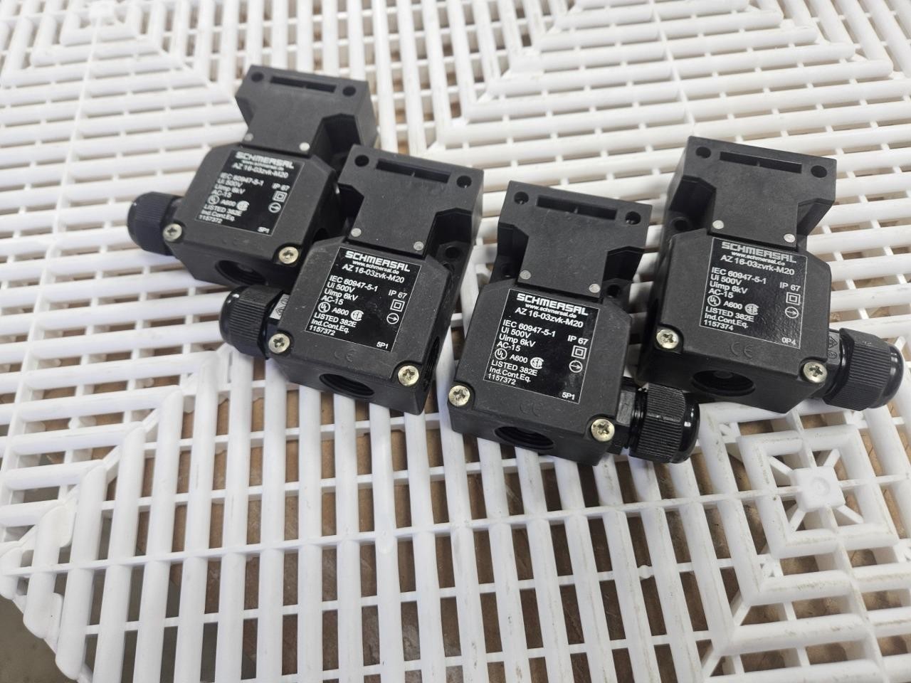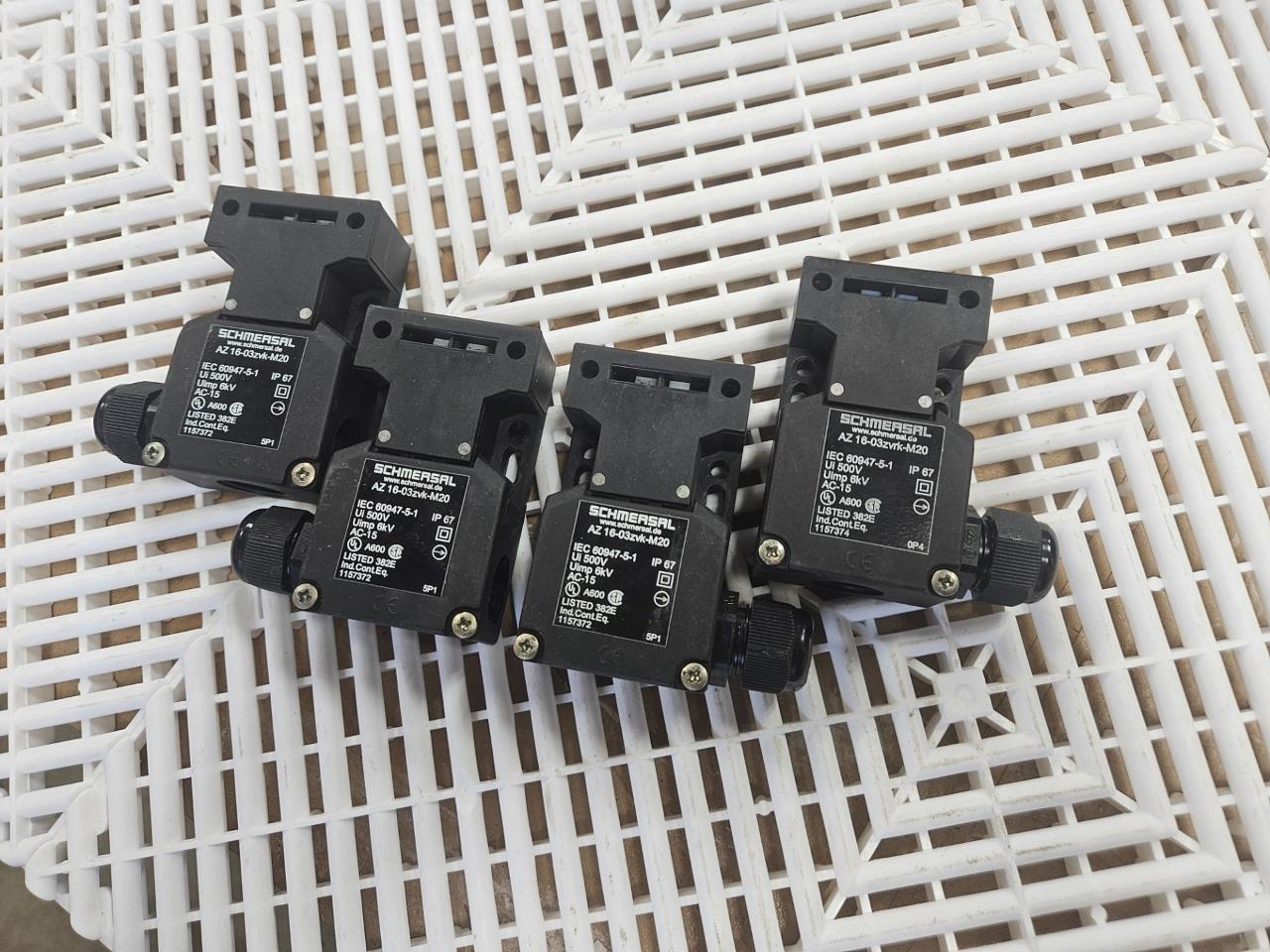 Here is a lot of four Schmersal AZ16-03ZVK-M20 safety interlock switches. These are in good functional and cosmetic shape, but do not include keys.  All four are included.