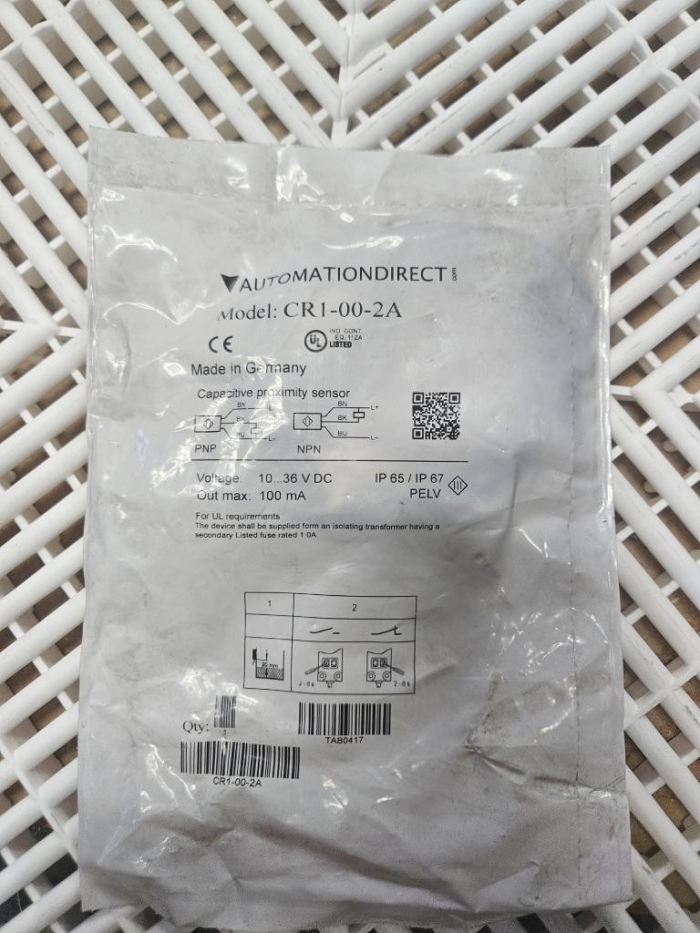 Here is an Automation Direct CR1-00-2A capacitive proximity sensor. This is new in factory packaging as shown.Â