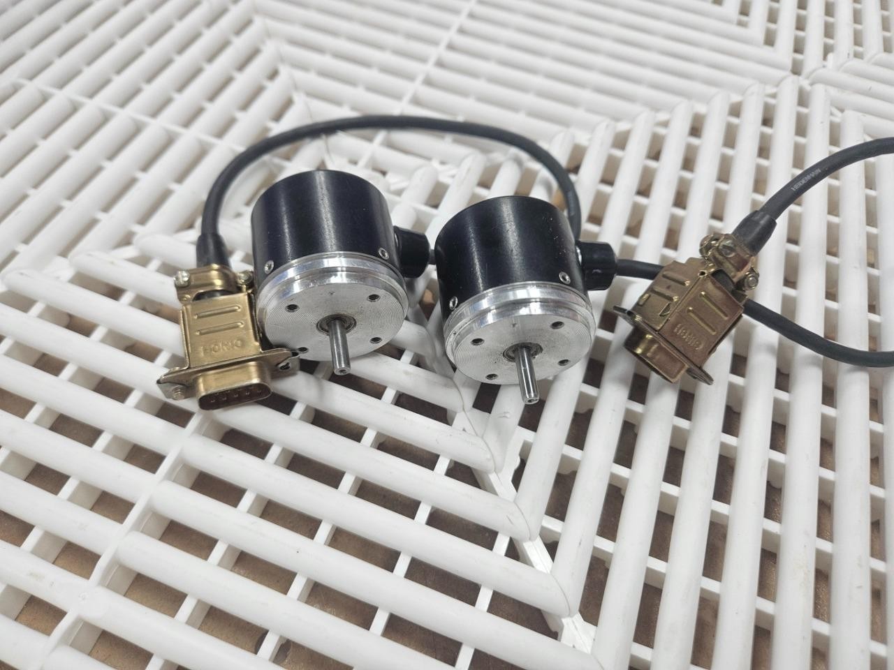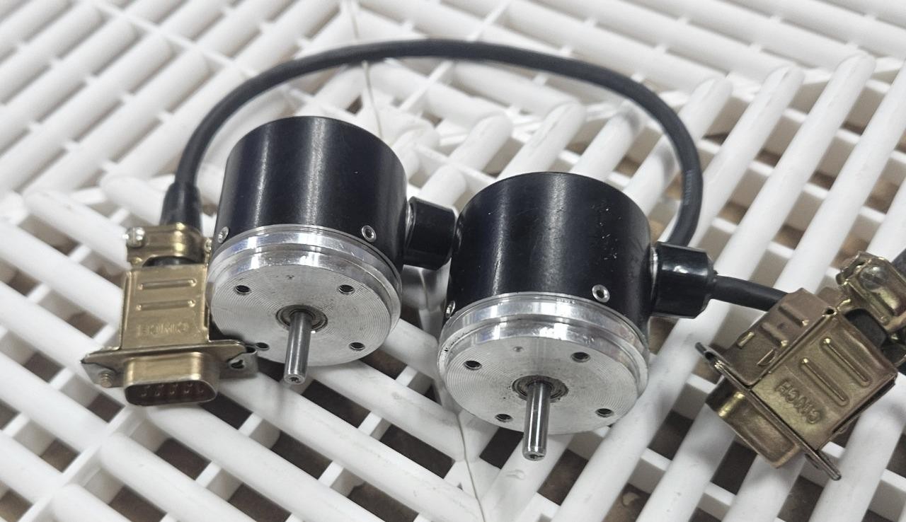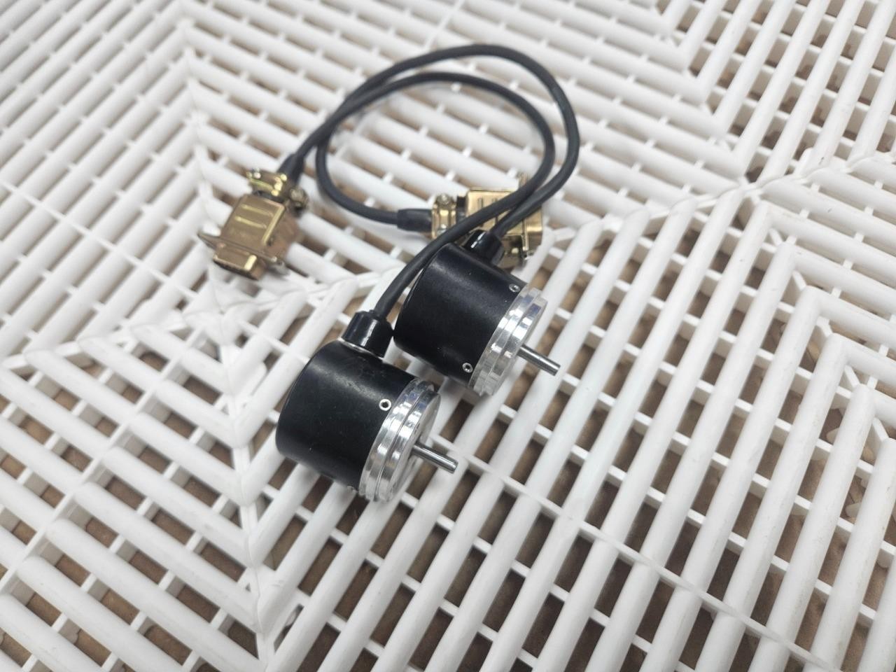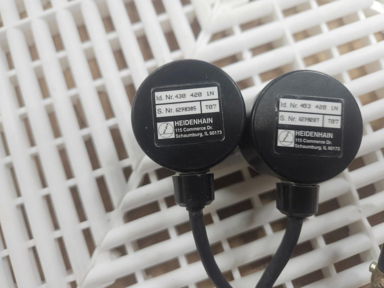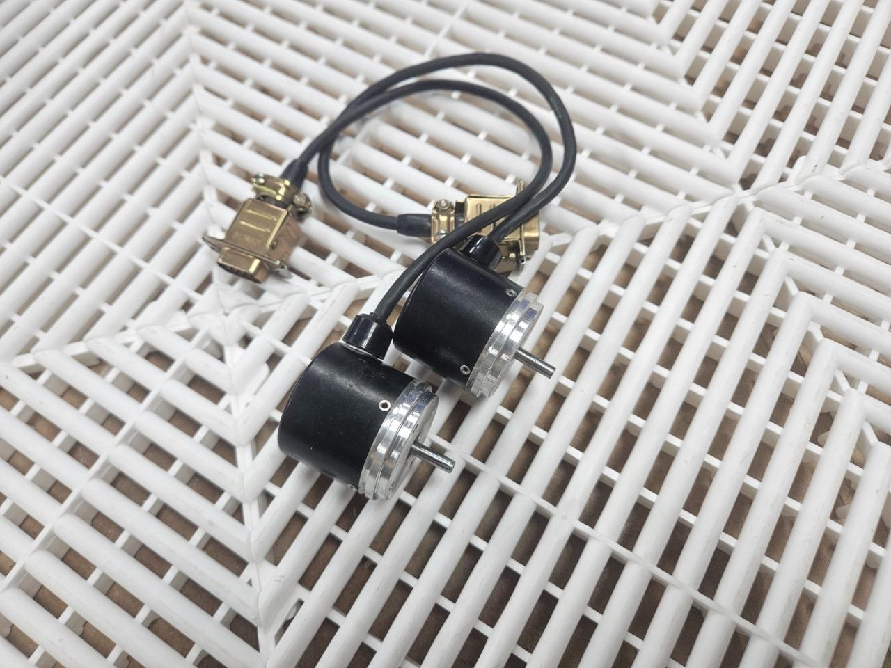 Here is a pair of Heidenhain shaft encoders. These appear identical apart and are believed to be identical. Please note, one tag says 430-420-1N whereas the other is 403-420-1N. This might just be a typo, but we can’t be sure. They are wired to DB9 male connectors. Both encoders shown are included.Â