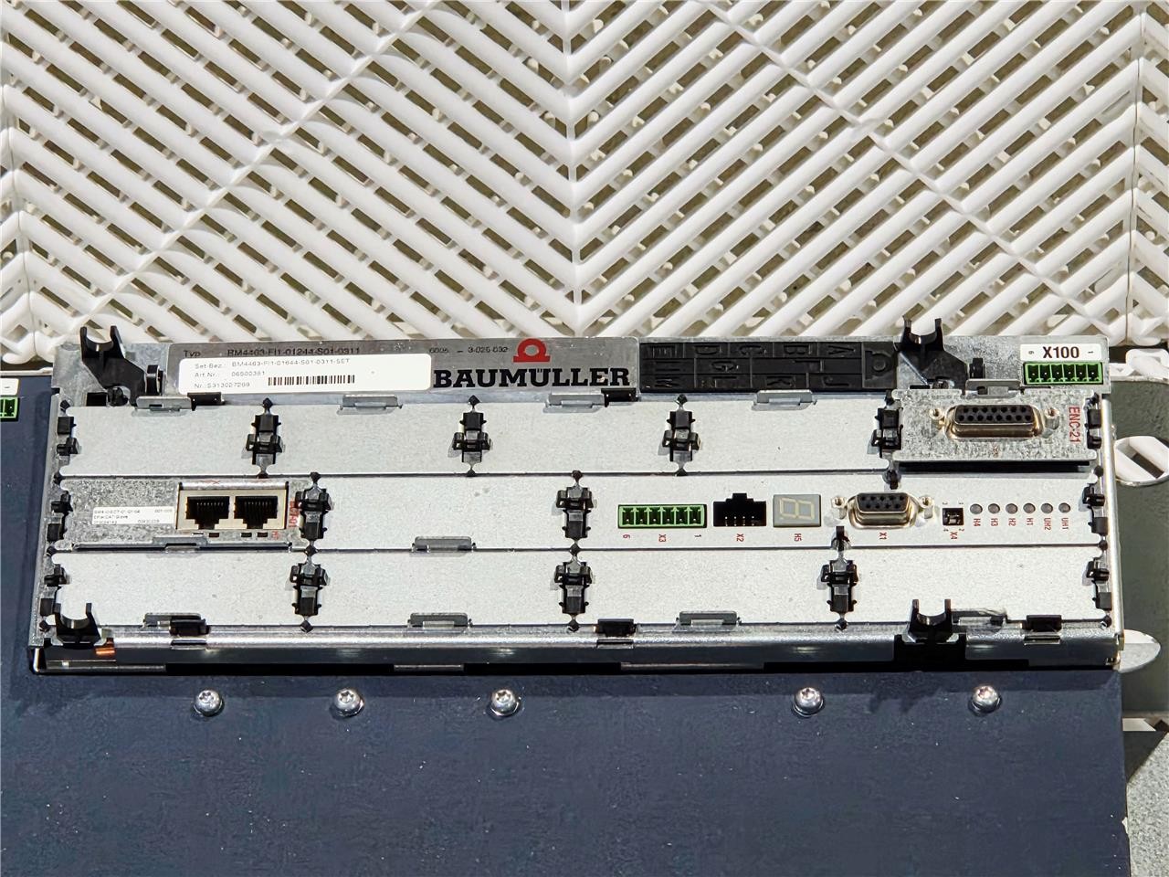 Here is a Baumuller BM4463-FI1-01644-S01-0311-SET Inverter Drive. This item is used, but in a like-new condition, as it was implemented on a line that was taken down before actually being put into use. The internals are very clean and seem to be in great condition. Includes the  BM4463-FI1-01244-S01-0311 Main Drive as shown in the pictures.