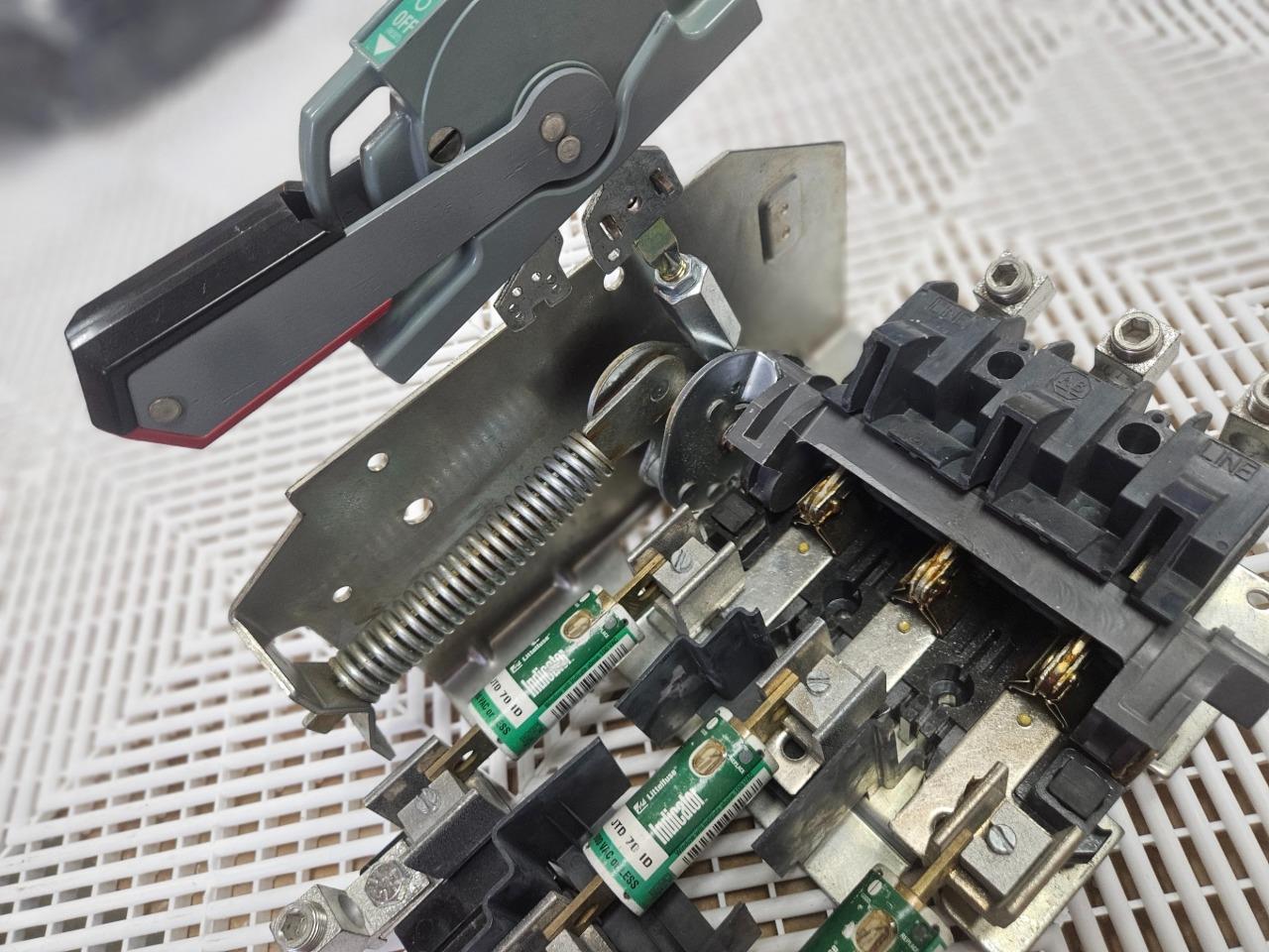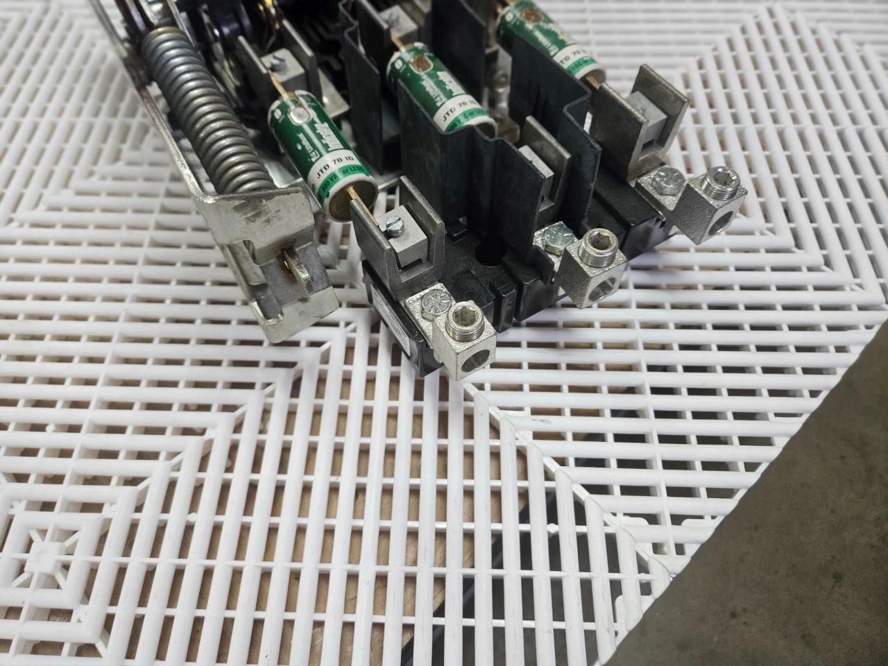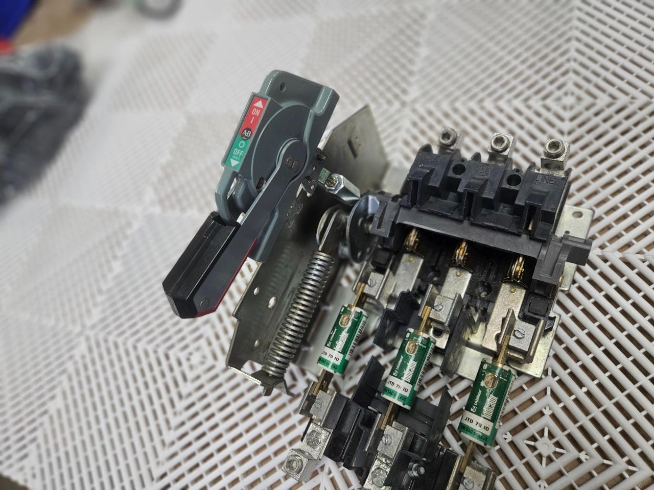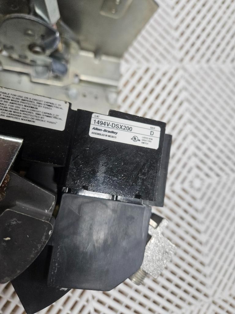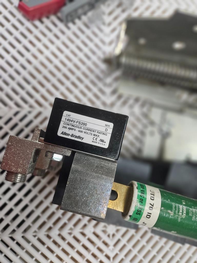 Here is an Allen-Bradley 1494V-DSX200 disconnect mechanism with 1494V-FS200 fuse holder. This also includes handle mechanism for use / mounting in electrical enclosures. Please note, this will need new mounting screws and pin hardware to fully assemble in an enclosure. The Littelfuse JTD 70 ID fuses are also included as shown.Â