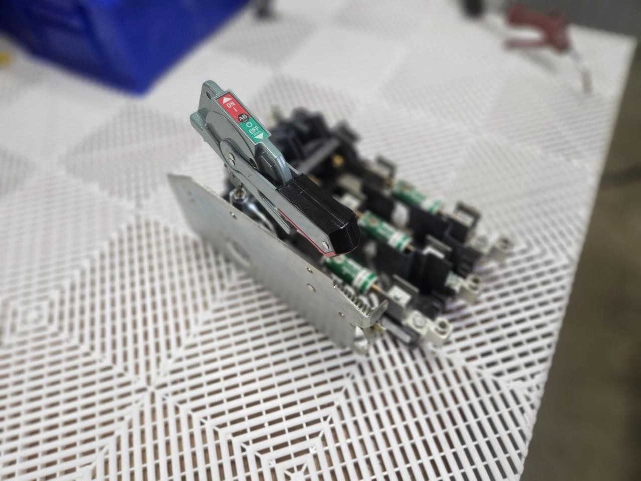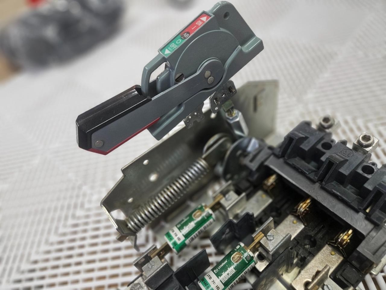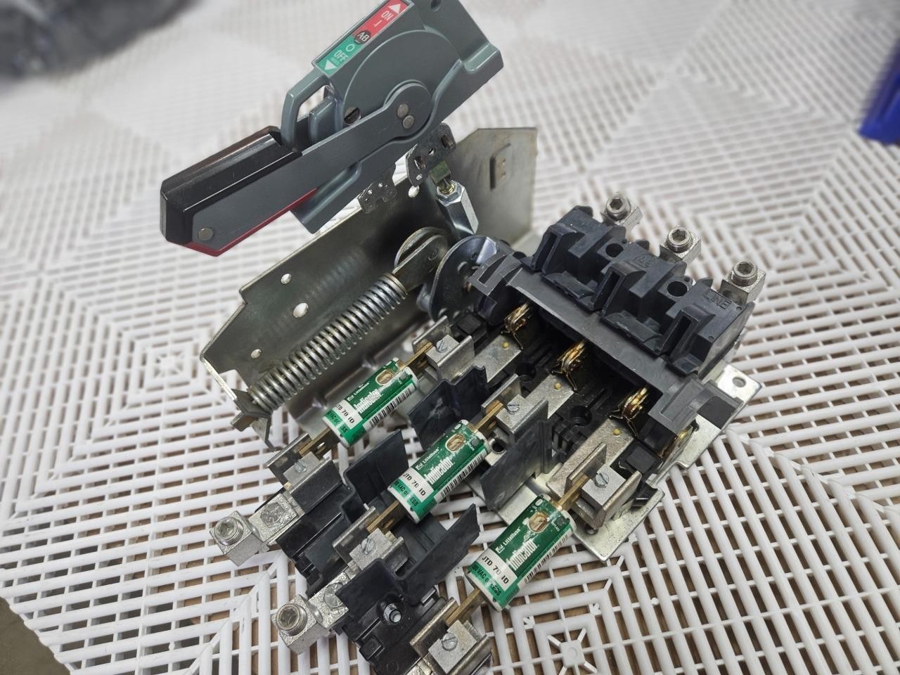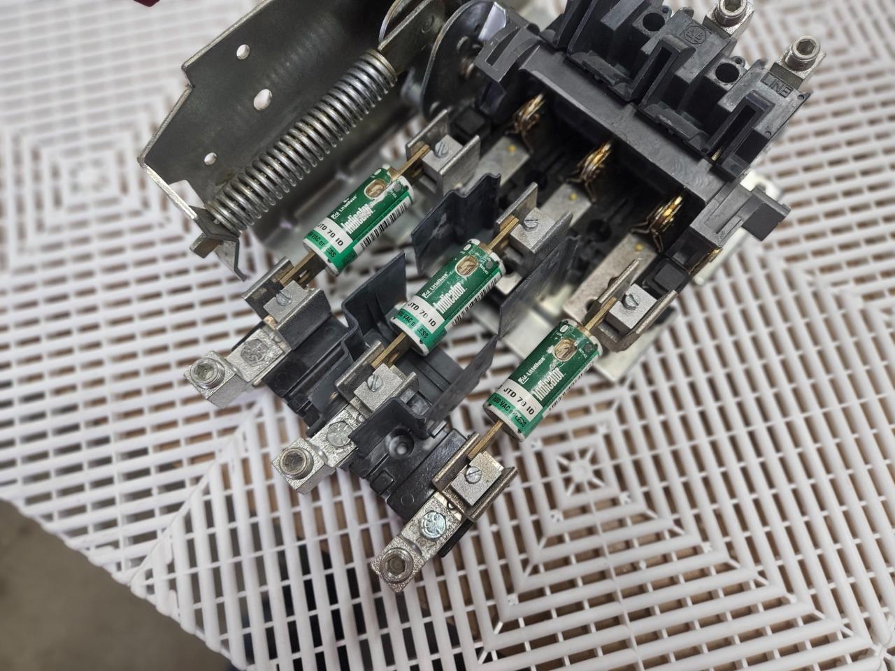 Here is an Allen-Bradley 1494V-DSX200 disconnect mechanism with 1494V-FS200 fuse holder. This also includes handle mechanism for use / mounting in electrical enclosures. Please note, this will need new mounting screws and pin hardware to fully assemble in an enclosure. The Littelfuse JTD 70 ID fuses are also included as shown.Â