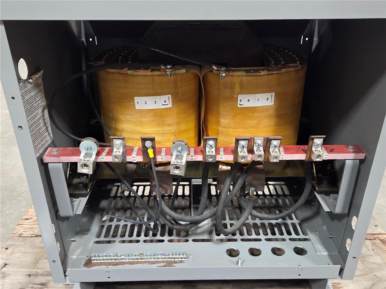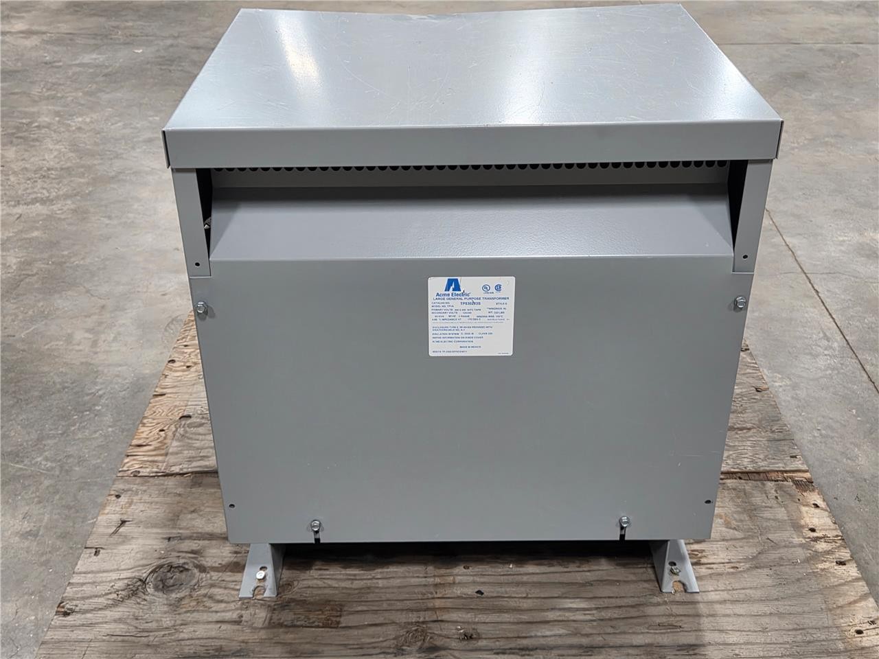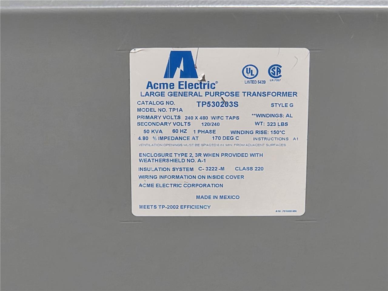 Here is an Acme TP530203S Large General Purpose Transformer. This has dual ratings. The first is 240×480 primary to 120/240V secondary. This is rated for 50 kVA with a 480V input. This is item is used but in great overall condition with minimal cosmetic blemishes such as a small bend on the top panel and minor scratches / scuffs.