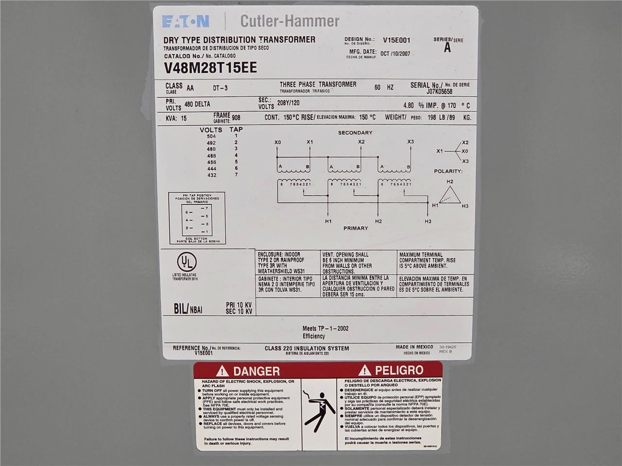 Here is an Eaton Cutler-Hammer transformer. This is a 15 kVA unit rated for 480-Delta primaries and 208Y-120 secondaries. Further specs are listed above. It is in a Nema 2 enclosure. This is in very clean functional and cosmetic shape as shown. The internals looks nearly new and the exterior case is in excellent shape.Â