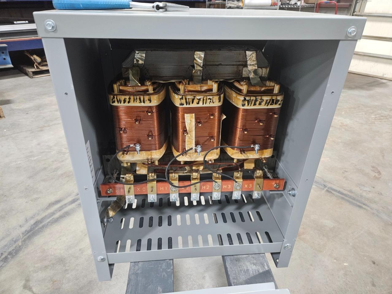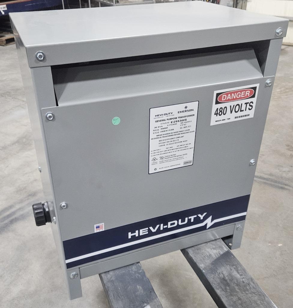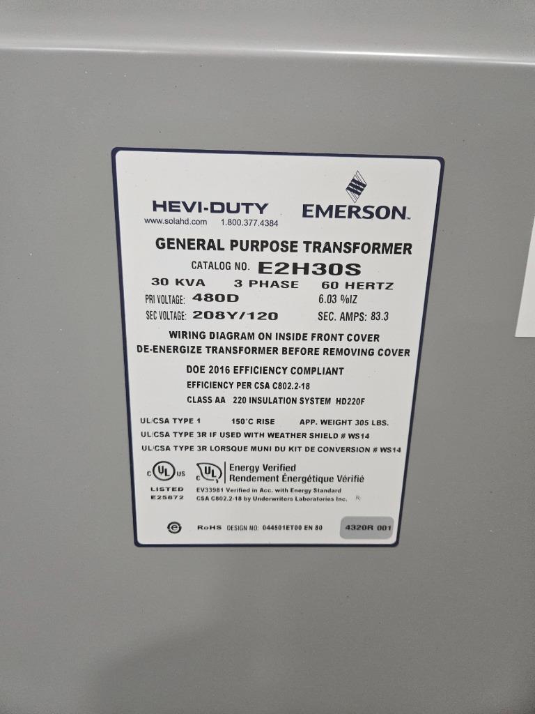 Here is an Emerson transformer. This was on a line purchased with Covid money that was never used. The transformer has never been electrically connected. Apart from one conduit punch on the side, it is in new functional and cosmetic shape.  LTL shipping is a flat $300 to business addresses within the continental US.