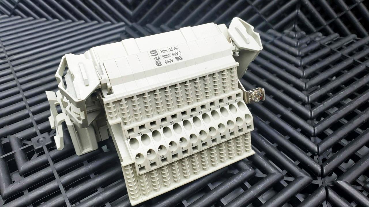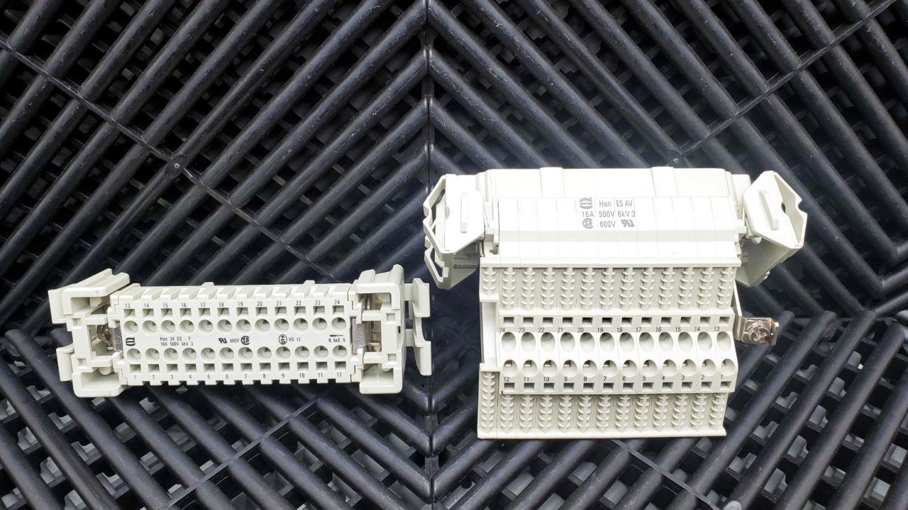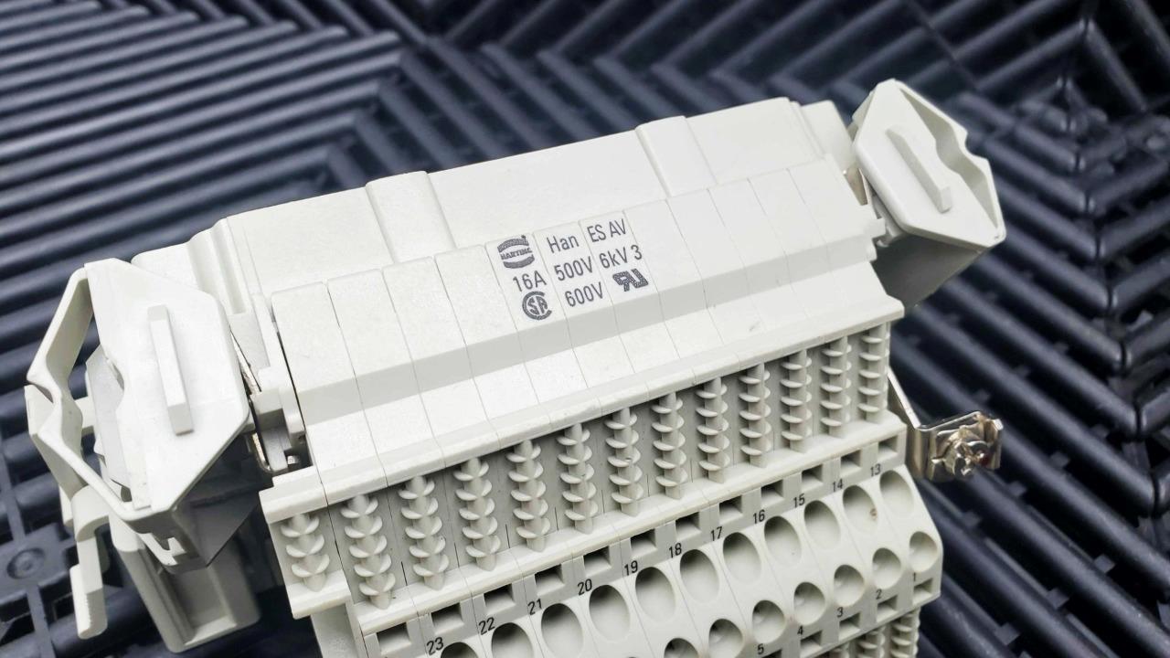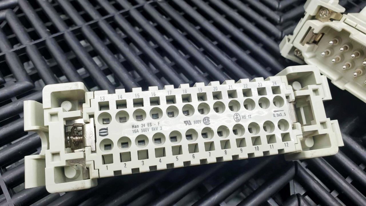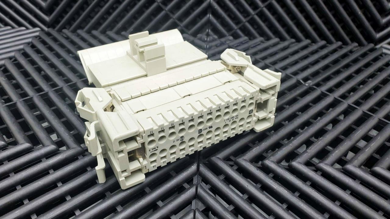 Here is a Harting HAN 24 ES AV Terminal Connector w/ 09330242716 Female Insert 24 ES-F. In excellent condition with minimal wear except for one missing posterior clip, see photos.Â
